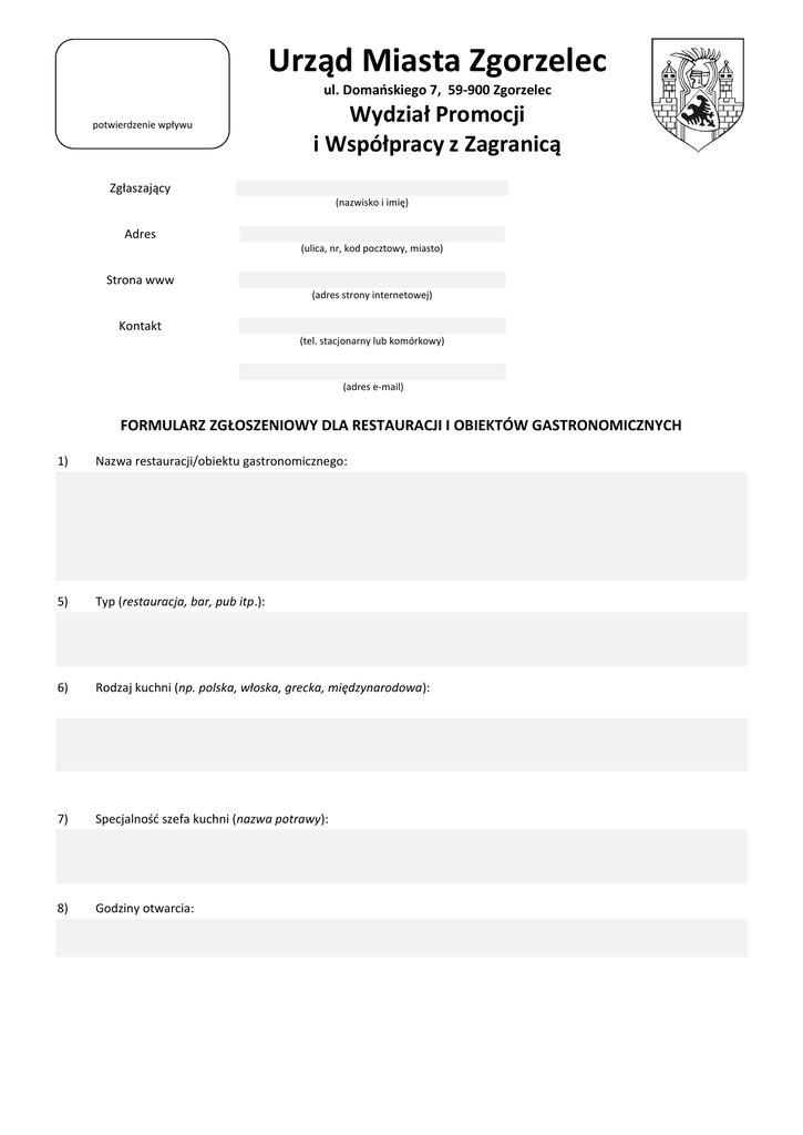 Urząd Miasta Zgorzelec ul. Domańskiego 7, 59-900 Zgorzelec potwierdzenie wpływu Zgłaszający Wydział Promocji i Współpracy z Zagranicą …………………………………………….……………………………. (nazwisko i imię) Adres …………………………………………….…..………………………. (ulica, nr, kod pocztowy, miasto) Strona www ………………………………………………….………………………. (adres strony internetowej) Kontakt ………………………………………………………..………………… (tel. stacjonarny lub komórkowy) ………………………………………………………..………………… (adres e-mail) FORMULARZ ZGŁOSZENIOWY DLA RESTAURACJI I OBIEKTÓW GASTRONOMICZNYCH 1) 2) 3) 4) Nazwa restauracji/obiektu gastronomicznego: .............................................................................................................................................................................................. ............ .............................................................................................................................................................................................. ............ .............................................................................................................................................................................................. ............ 5) Typ (restauracja, bar, pub itp.): .......................................................................................................................................................................................................... .......................................................................................................................................................................................................... ......................................................................................................................................................................................................... 6) Rodzaj kuchni (np. polska, włoska, grecka, międzynarodowa): .......................................................................................................................................................................................................... .......................................................................................................................................................................................................... .......................................................................................................................................................................................................... 7) Specjalność szefa kuchni (nazwa potrawy): .......................................................................................................................................................................................................... .......................................................................................................................................................................................................... .......................................................................................................................................................................................................... 8) Godziny otwarcia: .......................................................................................................................................................................................................... .......................................................................................................................................................................................................... PIKTOGRAMY (należy zaznaczyć X odpowiednie piktogramy charakteryzujące Państwa restaurację/obiekt gastronomiczny) Parking Miejsce przystosowane dla osób niepełnosprawnych Lokal klimatyzowany Wi-Fi Miejsce do przewijania dzieci Strefa dla osób palących Akceptacja zwierząt domowych Ogródek letni Akceptacja płatności kartą płatniczą/kredytową Akceptacja płatności obcą walutą (należy wpisać jaką, np. EUR, USD, CZK) Język obsługi (należy wpisać np. język polski, niemiecki, angielski itd.) Łączna liczba miejsc i liczba miejsc w największej sali (należy wpisać) (należy wpisać) Orientacyjny koszt dania obiadowego od do (należy wpisać w PLN od-do)