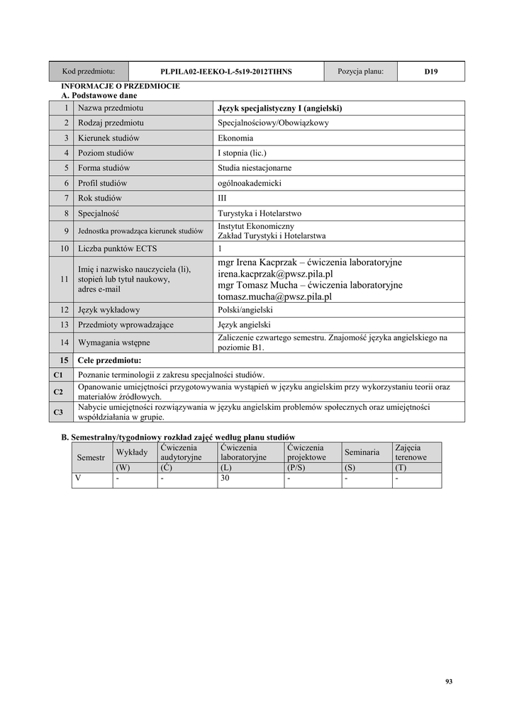 Kod przedmiotu: PLPILA02-IEEKO-L-5s19-2012TIHNS Pozycja planu: D19 INFORMACJE O PRZEDMIOCIE A. Podstawowe dane 1 Nazwa przedmiotu Język specjalistyczny I (angielski) 2 Rodzaj przedmiotu Specjalnościowy/Obowiązkowy 3 Kierunek studiów Ekonomia 4 Poziom studiów I stopnia (lic.) 5 Forma studiów Studia niestacjonarne 6 Profil studiów ogólnoakademicki 7 Rok studiów III 8 Specjalność 9 Jednostka prowadząca kierunek studiów Turystyka i Hotelarstwo Instytut Ekonomiczny Zakład Turystyki i Hotelarstwa 1 10 Liczba punktów ECTS 11 Imię i nazwisko nauczyciela (li), stopień lub tytuł naukowy, adres e-mail mgr Irena Kacprzak – ćwiczenia laboratoryjne [email protected] mgr Tomasz Mucha – ćwiczenia laboratoryjne [email protected] 12 Język wykładowy Polski/angielski 13 Przedmioty wprowadzające 14 Wymagania wstępne Język angielski Zaliczenie czwartego semestru. Znajomość języka angielskiego na poziomie B1. 15 Cele przedmiotu: C1 C2 C3 Poznanie terminologii z zakresu specjalności studiów. Opanowanie umiejętności przygotowywania wystąpień w języku angielskim przy wykorzystaniu teorii oraz materiałów źródłowych. Nabycie umiejętności rozwiązywania w języku angielskim problemów społecznych oraz umiejętności współdziałania w grupie. B. Semestralny/tygodniowy rozkład zajęć według planu studiów Ćwiczenia Ćwiczenia Ćwiczenia Wykłady audytoryjne laboratoryjne projektowe Semestr (W) (Ć) (L) (P/S) V 30 - Seminaria (S) - Zajęcia terenowe (T) - 93 PRZEDMIOTOWE EFEKTY KSZTAŁCENIA (wg KRK) Efekt EP1 EP2 EP3 EP4 Po zakończeniu przedmiotu i potwierdzeniu osiągnięcia efektów kształcenia student: Student zna terminologię z zakresu ekonomii w szczególności z obszaru specjalności studiów. Posiada umiejętność przygotowania wystąpień ustnych w języku obcym, dotyczących zagadnień szczegółowych, z wykorzystaniem podstawowych ujęć teoretycznych, a także innych źródeł. Jest kreatywny w zakresie rozwiązywania w języku obcym problemów społecznych. Potrafi współdziałać i pracować w grupie, przyjmując w niej różne role. Odniesienie przedmiotowych efektów kształcenia do efektów kształcenia dla celów kierunku obszaru S1A_W02 C1 K_W16 S1A_W04 S1A_W08 C2 K_U24 S1A_U11 S1A_U10 C3 K_K08 S1A_K01 S1A_K06 K_K07 S1A_K02 C3 TREŚCI PROGRAMOWE ODNIESIONE DO EFEKTÓW KSZTAŁCENIA T Treści programowe Forma: ćwiczenia laboratoryjne Ścieżka kariery w turystyce. Rodzaje podmiotów w przemyśle turystycznym. T1C CV. List motywacyjny T2C Rozmowa o pracę. Jak odnieść sukces – strategie. T3C Przemysł turystyczny. Działalność podmiotów w przemyśle turystycznym. T4C Cele podróży. Rodzaje usług. T5C Hotel oraz infrastruktura hotelowa. T6C Kontakty interpersonalne. Rozmowa z gościem hotelowym T7C T8C Rozwiązywanie problemów. Skargi i zażalenia. T9C T10C T11C T12C T13C T14C T15C Listy formalne – list z przeprosinami. W hotelowej recepcji. Rezerwacje. Rozmowy telefoniczne. Kultura – opis galerii, muzeum. Organizowanie pobytu. Hotelowi inspektorzy. Ankieta ewaluacyjna. Turystyczne atrakcje Madrytu. Praca z przewodnikiem turystycznym. Hotele w Berlinie – porównanie jakości świadczonych usług. liczba godzin 2 2 2 2 2 2 2 2 2 2 2 2 2 2 2 EP EP1 EP1 EP2 EP1 EP1 EP1 EP2 EP3 EP3 EP4 EP3 EP4 EP1 EP4 EP1 EP3 EP2,EP4 LITERATURA Literatura podstawowa P.STRUTT: English for International Tourism, Longman, Londyn, 2010. Literatura uzupełniająca P.MOOR: New Cutting Edge Intermediate, Longman, Londyn 2009. J.SZYKE: Repetytorium leksykalno-tematyczne, Edgard, Warszawa 2009. METODY DYDAKTYCZNE Forma kształcenia ćwiczenia laboratoryjne Metody dydaktyczne Metody problemowe : aktywizujące, podające, praktyczne. 94 METODY WERYFIKACJI PRZEDMIOTOWYCH EFEKTÓW KSZTAŁCENIA Forma oceny E E T P U Przedmiotowy efekt kształcenia K S W S U P R O D S E PS K I x EP1 EP2 EP3 EP4 x x x EP – egzamin pisemny EU – egzamin ustny T – test K – kolokwium P – prezentacja D – dyskusja KI – konsultacje indywidualne SW – sprawdzian wiedzy R – raport/referat SE – seminarium SU – sprawdzenie umiejętności praktycznych O – obserwacja w czasie zajęć PS – prace samokształceniowe studentów KRYTERIA OCENY OSIĄGNIĘCIA PRZEDMIOTOWYCH EFEKTÓW KSZTAŁCENIA Kryteria oceny Efekt kształcenia 2 3 - 3,5 EP1 Student nie zna terminologii z zakresu specjalności studiów. Student zna niektóre terminy z zakresu specjalności studiów, ma trudności z ich zdefiniowaniem. EP2 Student nie potrafi przygotować wystąpień ustnych w języku angielskim. Student przygotowuje krótkie wystąpienia, w których popełnia liczne błędy językowe. EP3 Student nie potrafi rozwiązywać w języku angielskim problemów. Student podaje przykłady rozwiązań problemów, ale nie potrafi ich uzasadnić. EP4 Student nie potrafi współdziałać i pracować w grupie. Student w ograniczonym stopniu współdziała w grupie, popełnia błędy w komunikacji. 4 – 4,5 Student zna terminologię z zakresu specjalności studiów, w definicjach popełnia nieliczne błędy. Student przygotowuje wystąpienia ustne, w których popełnia nieliczne błędy. Student w stopniu dobrym potrafi rozwiązywać w języku angielskim problemy. Student współdziała i pracuje w grupie, popełnia nieliczne błędy w komunikacji. 5 Student bezbłędnie podaje i definiuje terminologię z zakresu specjalności studiów. Student bezbłędnie przygotowuje wyczerpujące wystąpienia ustne w języku angielskim. Student potrafi rozwiązywać problemy w języku angielskim oraz motywuje swoje wybory. Student bezbłędnie współdziała i pracuje w grupie, przyjmując w niej różne role. SPOSOBY OCENIANIA I WARUNKI ZALICZENIA W POSZCZEGÓLNYCH FORMACH KSZTAŁCENIA Ćwiczenia laboratoryjne – ocenianie formujące (bieżące) obejmujące: aktywność w czasie zajęć, sprawdziany pisemne oraz ustne sprawdziany praktyczne umiejętności. Ocenianie podsumowujące na podstawie średniej arytmetycznej z 