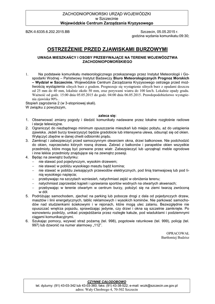 ZACHODNIOPOMORSKI URZĄD WOJEWÓDZKI w Szczecinie Wojewódzkie Centrum Zarządzania Kryzysowego BZK-II.6335.6.202.2015.BB Szczecin, 05.05.2015 r. godzina wydania komunikatu:09:30; OSTRZEŻENIE PRZED ZJAWISKAMI BURZOWYMI UWAGA MIESZKAŃCY I OSOBY PRZEBYWAJĄCE NA TERENIE WOJEWÓDZTWA ZACHODNIOPOMORSKIEGO Na podstawie komunikatu meteorologicznego przekazanego przez Instytut Meteorologii i Gospodarki Wodnej – Państwowy Instytut Badawczy Biuro Meteorologicznych Prognoz Morskich – Wydział w Szczecinie, Wojewódzkie Centrum Zarządzania Kryzysowego ostrzega przed możliwością wystąpienia silnych burz z gradem. Prognozuje się wystąpienie silnych burz z opadami deszczu od 25 mm do 40 mm, lokalnie około 50 mm, oraz porywami wiatru do 100 km/h. Lokalnie opady gradu. Ważność od godz. 15:00 dnia 05.05.2015 do godz. 04:00 dnia 06.05.2015. Prawdopodobieństwo wystąpienia zjawiska 90% . Stopień zagrożenia 2 (w 3-stopniowej skali). W związku z powyższym, 1. zaleca się: 1. Obserwować zmiany pogody i śledzić komunikaty nadawane przez lokalne rozgłośnie radiowe i stacje telewizyjne. 2. Ograniczyć do niezbędnego minimum opuszczanie mieszkań lub miejsc pobytu, aż do ustąpienia zjawiska. Jeżeli burzy towarzyszyć będzie gradobicie lub intensywna ulewa, odsunąć się od okien. Wyłączyć zbędne w danej chwili odbiorniki prądu. 3. Zamknąć i zabezpieczyć przed samoczynnym otwarciem okna, drzwi balkonowe. Nie podchodzić do okien, naprzeciwko których rosną drzewa. Zabrać z balkonów i parapetów okien wszystkie przedmioty, które mogą być porwane przez wiatr. Zabezpieczyć lub uprzątnąć meble ogrodowe i inne lekkie przedmioty znajdujące się na zewnątrz posesji. 4. Będąc na zewnątrz budynku: nie stawać pod pojedynczym, wysokim drzewem; nie stawać w pobliżu wysokiego masztu bądź komina; nie stawać w pobliżu zwisających przewodów elektrycznych, pod linią tramwajową lub pod linią wysokiego napięcia; przebywając na szczytach wzniesień, natychmiast zejść w obniżenia terenu; natychmiast zaprzestać kąpieli i uprawiania sportów wodnych na otwartych akwenach; przebywając w terenie otwartym w centrum burzy, położyć się na ziemi twarzą zwróconą w dół. 5. Podróżując samochodem, zjechać na parking lub pobocze drogi z dala od pojedynczych drzew, masztów i linii energetycznych, tablic reklamowych i wysokich kominów. Nie parkować samochodów nad studzienkami ściekowymi i w rejonach, które mogą ulec zalaniu. Bezwzględnie nie opuszczać wnętrza pojazdu, sprawdzając jedynie, czy drzwi i okna są szczelnie zamknięte. Po wznowieniu podróży, unikać przejeżdżania przez rozległe kałuże, pod wiaduktami i podziemnymi ciągami komunikacyjnymi. 6. Szukając pomocy, wzywać straż pożarną (tel. 998), pogotowie ratunkowe (tel. 999), policję (tel. 997) lub dzwonić na numer alarmowy „112”. OPRACOWAŁ Bartłomiej Budzisz CZYNNE CAŁODOBOWO tel. dyżurny: (91) 43-03-342 lub 43-03-360; faks: (91) 43-38-522; e-mail: [email protected] adres: Wały Chrobrego 4, 70-502 Szczecin ZACHODNIOPOMORSKI URZĄD WOJEWÓDZKI w Szczecinie Wojewódzkie Centrum Zarządzania Kryzysowego Subregion nadmorski: Świnoujście oraz powiaty: kamieński, gryficki, kołobrzeski, koszaliński, sławieński. Subregion Zalew Szczeciński : Zalew Szczeciński, Świnoujście, Szczecin oraz powiaty: kamieński, policki, goleniowski. Subregion wewnętrzny ZACHODNI - Szczecin oraz powiaty: goleniowski, gryfiński, łobeski, myśliborski, policki, pyrzycki, stargardzki. Subregion wewnętrzny WSCHODNI - powiaty: białogardzki, choszczeński, drawski, szczecinecki, świdwiński, wałecki. CZYNNE CAŁODOBOWO tel. dyżurny: (91) 43-03-342 lub 43-03-360; faks: (91) 43-38-522; e-mail: [email protected] adres: Wały Chrobrego 4, 70-502 Szczecin