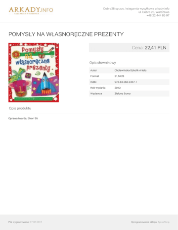 Dobra28 sp zoo. księgarnia wysyłkowa arkady.info ul. Dobra 28, Warszawa +48 22 444 86 97 POMYSŁY NA WŁASNORĘCZNE PREZENTY Cena: 22,41 PLN Opis słownikowy Autor Cholewińska-Szkolik Aniela Format 21,5X28 ISBN 978-83-265-0447-1 Rok wydania 2012 Wydawca Zielona Sowa Opis produktu Oprawa twarda, Stron 96 Plik wygenerowano: 07-03-2017 Powered by TCPDF (www.tcpdf.org) Oprogramowanie sklepu: AptusShop