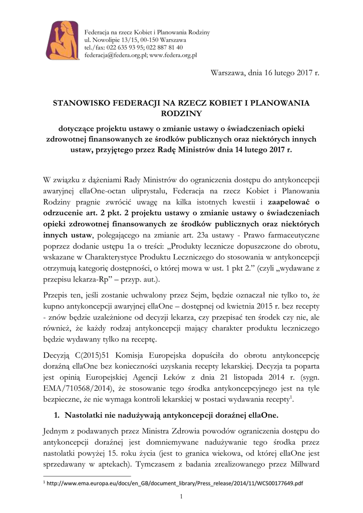 Federacja na rzecz Kobiet i Planowania Rodziny ul. Nowolipie 13/15, 00-150 Warszawa tel./fax: 022 635 93 95; 022 887 81 40 [email protected]; www.federa.org.pl Warszawa, dnia 16 lutego 2017 r. STANOWISKO FEDERACJI NA RZECZ KOBIET I PLANOWANIA RODZINY dotyczące projektu ustawy o zmianie ustawy o świadczeniach opieki zdrowotnej finansowanych ze środków publicznych oraz niektórych innych ustaw, przyjętego przez Radę Ministrów dnia 14 lutego 2017 r. W związku z dążeniami Rady Ministrów do ograniczenia dostępu do antykoncepcji awaryjnej ellaOne-octan uliprystalu, Federacja na rzecz Kobiet i Planowania Rodziny pragnie zwrócić uwagę na kilka istotnych kwestii i zaapelować o odrzucenie art. 2 pkt. 2 projektu ustawy o zmianie ustawy o świadczeniach opieki zdrowotnej finansowanych ze środków publicznych oraz niektórych innych ustaw, polegającego na zmianie art. 23a ustawy - Prawo farmaceutyczne poprzez dodanie ustępu 1a o treści: „Produkty lecznicze dopuszczone do obrotu, wskazane w Charakterystyce Produktu Leczniczego do stosowania w antykoncepcji otrzymują kategorię dostępności, o której mowa w ust. 1 pkt 2.” (czyli „wydawane z przepisu lekarza-Rp” – przyp. aut.). Przepis ten, jeśli zostanie uchwalony przez Sejm, będzie oznaczał nie tylko to, że kupno antykoncepcji awaryjnej ellaOne – dostępnej od kwietnia 2015 r. bez recepty - znów będzie uzależnione od decyzji lekarza, czy przepisać ten środek czy nie, ale również, że każdy rodzaj antykoncepcji mający charakter produktu leczniczego będzie wydawany tylko na receptę. Decyzją C(2015)51 Komisja Europejska dopuściła do obrotu antykoncepcję doraźną ellaOne bez konieczności uzyskania recepty lekarskiej. Decyzja ta poparta jest opinią Europejskiej Agencji Leków z dnia 21 listopada 2014 r. (sygn. EMA/710568/2014), że stosowanie tego środka antykoncepcyjnego jest na tyle bezpieczne, że nie wymaga kontroli lekarskiej w postaci wydawania recepty1. 1. Nastolatki nie nadużywają antykoncepcji doraźnej ellaOne. Jednym z podawanych przez Ministra Zdrowia powodów ograniczenia dostępu do antykoncepcji doraźnej jest domniemywane nadużywanie tego środka przez nastolatki powyżej 15. roku życia (jest to granica wiekowa, od której ellaOne jest sprzedawany w aptekach). Tymczasem z badania zrealizowanego przez Millward 1 http://www.ema.europa.eu/docs/en_GB/document_library/Press_release/2014/11/WC500177649.pdf 1 Federacja na rzecz Kobiet i Planowania Rodziny ul. Nowolipie 13/15, 00-150 Warszawa tel./fax: 022 635 93 95; 022 887 81 40 [email protected]; www.federa.org.pl Brown wśród farmaceutów wynika, że w Polsce największą grupę klientów aptek decydujących się na zakup ellaOne stanowią osoby w wieku 25-30 lat (45%). Na kolejnych miejscach w zestawieniu znalazły się klientki w wieku 18-24 lata (21%) oraz 31-35 lat (18%)2. Osoby w wieku poniżej 18 lat stanowią niespełna 2% kupujących. Zjawisko przeciwne byłoby mało prawdopodobne ze względów finansowych – ellaOne należy do produktów drogich. Ponadto, producent wskazuje, że Polska jest krajem o jednym z najniższych w Europie stopniu penetracji rynku - określanym przez odsetek kupujących ellaOne w całej populacji kobiet w wieku 15-49 lat. W przypadku Polski w 2015 r. wyniósł on 2,9%, co plasuje ją na 22 miejscu w zestawieniu obejmującym 24 państwa, przy średnim stopniu penetracji wynoszącym 6,4%. Istniejące obawy władz publicznych o sposób zabezpieczania się nastolatek powinien skłonić natomiast do reformy edukacji seksualnej w szkołach, tak by była ona w końcu rzetelna, powszechna i odpowiadająca krajowym i międzynarodowym standardom oraz potrzebom młodzieży. Na to, że obecnie istniejące w polskich szkołach lekcje „wychowania do życia w rodzinie” nie realizują tych postulatów, wskazują rekomendacje powstałe w wyniku projektu "Kontrola realizacji prawa młodzieży do edukacji seksualnej" realizowanego przez Federację na rzecz Kobiet i Planowania Rodziny w ramach programu „Obywatele dla Demokracji” finansowanego z Funduszy EOG3. 2. Względy medyczne nie kwalifikują antykoncepcji awaryjnej ellaOne do wzmożonej kontroli lekarskiej. W komunikacie Ministerstwa Zdrowia można przeczytać, że „tabletki ellaOne powrócą do grupy leków, których wydawanie będzie się wiązało ze ściślejszą kontrolą lekarską. Uzasadniają to względy medyczne. Wydawanie leku na receptę to procedura, która ma na celu zapewnienie pacjentom maksymalnego bezpieczeństwa farmakoterapii”. Z danych Komitetu ds. Oceny Ryzyka w Ramach Nadzoru nad Bezpieczeństwem Farmakoterapii Europejskiej Agencji Leków wynika, że w przypadku Polski w okresie od wprowadzenia leku do sprzedaży do 31 lipca 2016 r. odnotowano 81 zgłoszeń dotyczących niepożądanych działań ellaOne, wśród których 23 zgłoszenia (28,4%) dotyczyły zajścia pacjentek w ciążę, pomimo zażycia tego leku. Warto przywołać tu opinię prof. dr hab. n. med. Violetty SkrzypulecPlinta o tym, że: „ellaOne jest lekiem bezpiecznym. Oczywiście, jak wszystkie 2 http://centrumprasowe.pap.pl/cp/pl/news/info/keyword/8876,65751,,to-nie-nastolatki-kupuja-pigulke-po-! http://ponton.org.pl/sites/ponton/files/pdf/2016/rekomendacje_kontrola_prawa_edukacja_seksualna_2016. pdf 3 2 Federacja na rzecz Kobiet i Planowania Rodziny ul. Nowolipie 13/15, 00-150 Warszawa tel./fax: 022 635 93 95; 022 887 81 40 [email protected]; www.federa.org.pl leki może wywoływać działania niepożądane, choć występują one bardzo rzadko. Najczęściej zgłaszane działania niepożądane to: niechciana ciąża, bóle głowy, nudności, bóle brzucha i bolesne okresy”. Nie są to zatem dolegliwości zagrażające życiu lub zdrowiu pacjentek, nie ma więc potrzeby reglamentowania sprzedaży antykoncepcji awaryjnej ellaOne decyzją lekarza. Przeciwskazania przyjmowania leku nie różnią się znacznie od tych występujących przy innych produktach lecznicz
