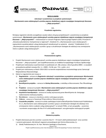 REGULAMIN rekrutacji i uczestnictwa w projekcie systemowym Wyrównanie szans edukacyjnych uczniów poprzez dodatkowe zajęcia rozwijające kompetencje kluczowe – „Moja przyszłość”, § 1. Przedmiot regulaminu. Niniejszy regulamin określa szczegółowe zasady naboru do grup projektowych i uczestnictwa w projekcie systemowym: Wyrównanie szans edukacyjnych uczniów poprzez dodatkowe zajęcia rozwijające kompetencje kluczowe – „Moja przyszłość” - realizowanym w ramach Programu Operacyjnego Kapitał Ludzki, Priorytet IX „Rozwój wykształcenia i kompetencji w regionach”, Działanie 9.1 „Wyrównywanie szans edukacyjnych i zapewnienie wysokiej jakości usług edukacyjnych świadczonych w systemie oświaty”, Poddziałanie 9.1.2 „Wyrównywanie szans edukacyjnych uczniów z grup o utrudnionym dostępie do edukacji oraz zmniejszanie różnic w jakości usług edukacyjnych”. § 2. Postanowienia ogólne. 1. 2. 3. 4. Projekt Wyrównanie szans edukacyjnych uczniów poprzez dodatkowe zajęcia rozwijające kompetencje kluczowe – „Moja przyszłość”, jest współfinansowany ze środków Europejskiego Funduszu Społecznego. Projekt jest realizowany w partnerstwie na podstawie art. 28a ustawy z dnia 6 grudnia 2006 r. o zasadach prowadzenia polityki rozwoju (Dz. U. z 2009 r. Nr 84, poz. 712, z późn. zm.) Projekt jest realizowany w latach 2014-2015 na terenie województwa mazowieckiego przez Samorząd Województwa Mazowieckiego. Ilekroć w regulaminie jest mowa o: 1) Regulaminie – oznacza to Regulamin rekrutacji i uczestnictwa w projekcie systemowym Wyrównanie szans edukacyjnych uczniów poprzez dodatkowe zajęcia rozwijające kompetencje kluczowe – „Moja przyszłość”, 2) Beneficjencie projektu – oznacza to Gminę Mszczonów, z siedzibą w Mszczonowie; Plac Piłsudskiego 1, 3) Projekcie - oznacza to projekt: Wyrównanie szans edukacyjnych uczniów poprzez dodatkowe zajęcia rozwijające kompetencje kluczowe – „Moja przyszłość”, 4) Asystencie koordynatora - oznacza to osobę wyznaczoną przez Beneficjenta do bieżącego nadzorowania realizacji projektu, 5) Dyrektorze - oznacza to dyrektora szkoły realizującej projekt, 6) Liderze - oznacza to Samorząd Województwa Mazowieckiego, 7) Uczestniku projektu - oznacza to osoby spełniające kryteria Beneficjentów Ostatecznych Poddziałania 9.1.2 „Wyrównanie szans edukacyjnych uczniów z grup o utrudnionym dostępie do edukacji oraz zmniejszenie różnic w jakości usług edukacyjnych” w ramach POKL, w tym przypadku - uczennice i uczniowie uczęszczający do klas IV-VI szkół podstawowych oraz gimnazjów realizujących projekt. § 3. Założenia projektu. 1. Projekt skierowany jest do uczniów i uczennic klas IV – VI trzech szkół podstawowych oraz uczniów i uczennic gimnazjum, dla których organem prowadzącym jest Gmina Mszczonów, tj.: 1) Szkoły Podstawowej im. Ks. Kan. Mariana Lipskiego w Osuchowie, Strona 1 z 6 Projekt współfinansowany przez Unię Europejską w ramach Europejskiego Funduszu Społecznego 2) Szkoły Podstawowej w Piekarach, 3) Szkoły Podstawowej w Lutkówce, 4) Gimnazjum im. J.A. Maklakiewicza w Mszczonowie. 2. Celem głównym Projektu jest wyrównywanie szans edukacyjnych uczestniczących w Projekcie dziewcząt i chłopców poprzez udział w dodatkowych zajęciach pozalekcyjnych rozwijających kompetencje kluczowe. 3. Celami szczegółowymi Projektu są: 1) objęcie uczennic i uczniów uczestniczących w projekcie wsparciem w postaci dodatkowych zajęć pozalekcyjnych; 2) rozszerzenie oferty edukacyjno-wychowawczej szkół podstawowych oraz gimnazjalnych; 3) przeciwdziałanie zjawiskom przemocy i agresji wśród dzieci i młodzieży; 4) wsparcie z zakresu poradnictwa i doradztwa edukacyjno – zawodowego dla dziewcząt i chłopców; 5) kształtowanie umiejętności właściwego spędzania czasu wolnego. 4. Projekt jest realizowany w okresie od września 2014 r. do czerwca 2015 r. 5. W ramach projektu: 1) w każdej szkole podstawowej uczestniczącej w Projekcie realizowane będą w bloku zajęć pozalekcyjnych obejmującym łącznie 20 godzin (lekcyjnych) zajęć miesięcznie następujące zajęcia dodatkowe: a) zajęcia z nauki języka angielskiego - 8 godzin miesięcznie, b) zajęcia z przedmiotów matematyczno – przyrodniczych (matematyka - 8 godzin miesięcznie, przyroda - 2 godziny miesięcznie, c) zajęcia związane z poradnictwem i doradztwem edukacyjno – zawodowym - 2 godziny miesięcznie. 2) W gimnazjum uczestniczącym w Projekcie realizowane będą w bloku zajęć pozalekcyjnych obejmującym łącznie 20 godzin (lekcyjnych) zajęć miesięcznie następujące zajęcia dodatkowe: a) zajęcia z nauki języka angielskiego - 3 godziny miesięcznie, zajęcia z nauki języka rosyjskiego - 3 godziny miesięcznie, b) zajęcia z przedmiotów matematyczno – przyrodniczych (matematyka - 2 godziny miesięcznie, biologia - 2 godziny miesięcznie, chemia - 2 godziny miesięcznie, geografia - 2 godziny miesięcznie) c) zajęcia związane z poradnictwem i doradztwem edukacyjno – zawodowym - 6 godzin miesięcznie. 6. Organizowane formy wsparcia prowadzone będą jako zajęcia pozalekcyjne zgodnie z harmonogramem zajęć opracowanym przez Wykonawcę i zatwierdzonym przez dyrektora. Zajęcia określone w harmonogramie zajęć mogą w poszczególnych miesiącach odbywać się w liczbie innej niż to określono w ust. 5, jednak z zastrzeżeniem, że zachowana zostanie proporcja wykonanych zajęć przez 4 miesiące w roku 2014 oraz przez 6 miesięcy w roku 2015. Harmonogram zostanie udostępniony w szkole oraz opublikowany na stronach internetowych szkół. W uzasadnionych przypadkach, realizator projektu zastrzega sobie możliwość wprowadzenia zmian w harmonogramie zajęć. 7. Zajęcia prowadzone będą na terenie szkół lub w innych miejscach uzgodnionych przez Wykonawcę nauczyciela z dyrektorem. 8. Zajęcia odbywały się będą w dni nauki szkolnej. Dopuszcza się or
