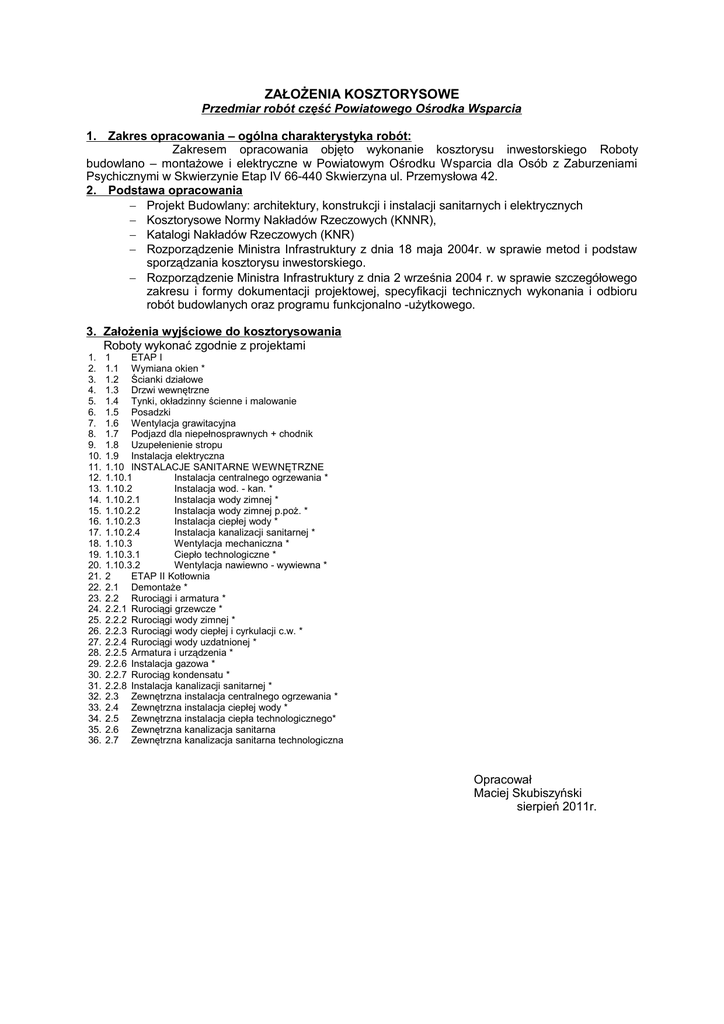 ZAŁOŻENIA KOSZTORYSOWE Przedmiar robót część Powiatowego Ośrodka Wsparcia 1. Zakres opracowania – ogólna charakterystyka robót: Zakresem opracowania objęto wykonanie kosztorysu inwestorskiego Roboty budowlano – montażowe i elektryczne w Powiatowym Ośrodku Wsparcia dla Osób z Zaburzeniami Psychicznymi w Skwierzynie Etap IV 66-440 Skwierzyna ul. Przemysłowa 42. 2. Podstawa opracowania − Projekt Budowlany: architektury, konstrukcji i instalacji sanitarnych i elektrycznych − Kosztorysowe Normy Nakładów Rzeczowych (KNNR), − Katalogi Nakładów Rzeczowych (KNR) − Rozporządzenie Ministra Infrastruktury z dnia 18 maja 2004r. w sprawie metod i podstaw sporządzania kosztorysu inwestorskiego. − Rozporządzenie Ministra Infrastruktury z dnia 2 września 2004 r. w sprawie szczegółowego zakresu i formy dokumentacji projektowej, specyfikacji technicznych wykonania i odbioru robót budowlanych oraz programu funkcjonalno -użytkowego. 3. Założenia wyjściowe do kosztorysowania Roboty wykonać zgodnie z projektami 1. 2. 3. 4. 5. 6. 7. 8. 9. 10. 11. 12. 13. 14. 15. 16. 17. 18. 19. 20. 21. 22. 23. 24. 25. 26. 27. 28. 29. 30. 31. 32. 33. 34. 35. 36. 1 ETAP I 1.1 Wymiana okien * 1.2 Ścianki działowe 1.3 Drzwi wewnętrzne 1.4 Tynki, okładzinny ścienne i malowanie 1.5 Posadzki 1.6 Wentylacja grawitacyjna 1.7 Podjazd dla niepełnosprawnych + chodnik 1.8 Uzupełenienie stropu 1.9 Instalacja elektryczna 1.10 INSTALACJE SANITARNE WEWNĘTRZNE 1.10.1 Instalacja centralnego ogrzewania * 1.10.2 Instalacja wod. - kan. * 1.10.2.1 Instalacja wody zimnej * 1.10.2.2 Instalacja wody zimnej p.poż. * 1.10.2.3 Instalacja ciepłej wody * 1.10.2.4 Instalacja kanalizacji sanitarnej * 1.10.3 Wentylacja mechaniczna * 1.10.3.1 Ciepło technologiczne * 1.10.3.2 Wentylacja nawiewno - wywiewna * 2 ETAP II Kotłownia 2.1 Demontaże * 2.2 Rurociągi i armatura * 2.2.1 Rurociągi grzewcze * 2.2.2 Rurociągi wody zimnej * 2.2.3 Rurociągi wody ciepłej i cyrkulacji c.w. * 2.2.4 Rurociągi wody uzdatnionej * 2.2.5 Armatura i urządzenia * 2.2.6 Instalacja gazowa * 2.2.7 Rurociąg kondensatu * 2.2.8 Instalacja kanalizacji sanitarnej * 2.3 Zewnętrzna instalacja centralnego ogrzewania * 2.4 Zewnętrzna instalacja ciepłej wody * 2.5 Zewnętrzna instalacja ciepła technologicznego* 2.6 Zewnętrzna kanalizacja sanitarna 2.7 Zewnętrzna kanalizacja sanitarna technologiczna Opracował Maciej Skubiszyński sierpień 2011r.