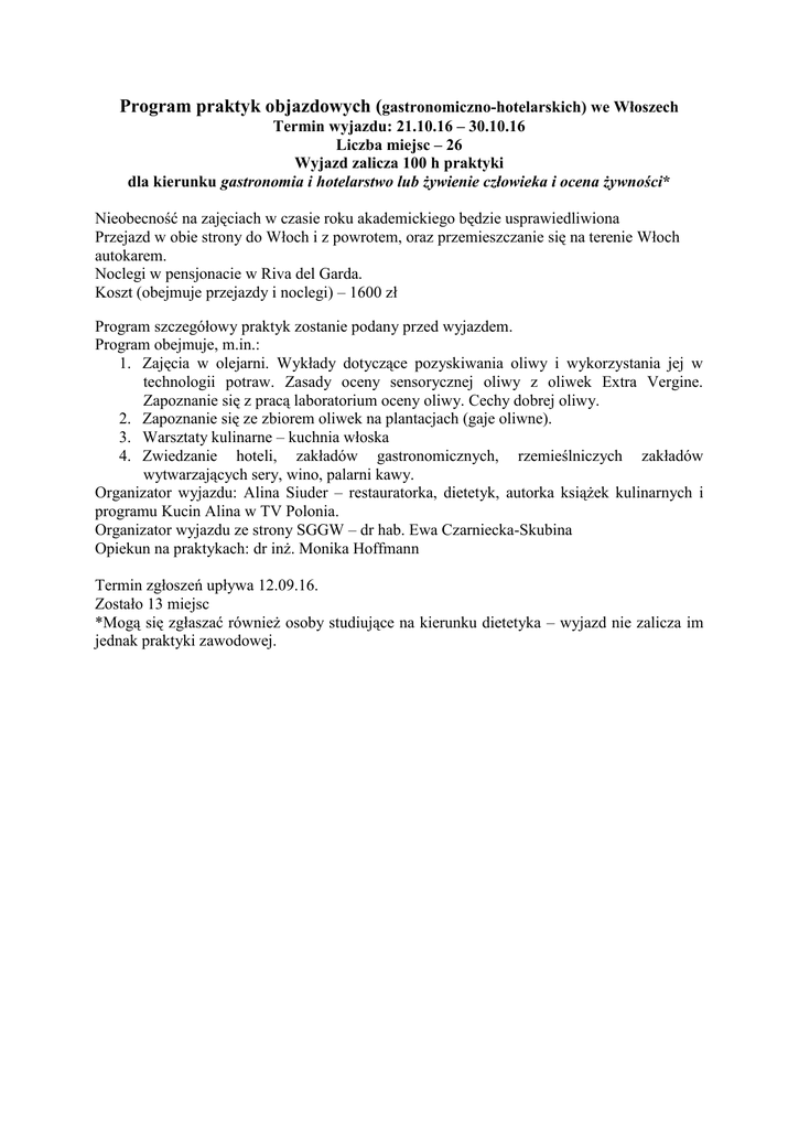 Program praktyk objazdowych (gastronomiczno-hotelarskich) we Włoszech Termin wyjazdu: 21.10.16 – 30.10.16 Liczba miejsc – 26 Wyjazd zalicza 100 h praktyki dla kierunku gastronomia i hotelarstwo lub żywienie człowieka i ocena żywności* Nieobecność na zajęciach w czasie roku akademickiego będzie usprawiedliwiona Przejazd w obie strony do Włoch i z powrotem, oraz przemieszczanie się na terenie Włoch autokarem. Noclegi w pensjonacie w Riva del Garda. Koszt (obejmuje przejazdy i noclegi) – 1600 zł Program szczegółowy praktyk zostanie podany przed wyjazdem. Program obejmuje, m.in.: 1. Zajęcia w olejarni. Wykłady dotyczące pozyskiwania oliwy i wykorzystania jej w technologii potraw. Zasady oceny sensorycznej oliwy z oliwek Extra Vergine. Zapoznanie się z pracą laboratorium oceny oliwy. Cechy dobrej oliwy. 2. Zapoznanie się ze zbiorem oliwek na plantacjach (gaje oliwne). 3. Warsztaty kulinarne – kuchnia włoska 4. Zwiedzanie hoteli, zakładów gastronomicznych, rzemieślniczych zakładów wytwarzających sery, wino, palarni kawy. Organizator wyjazdu: Alina Siuder – restauratorka, dietetyk, autorka książek kulinarnych i programu Kucin Alina w TV Polonia. Organizator wyjazdu ze strony SGGW – dr hab. Ewa Czarniecka-Skubina Opiekun na praktykach: dr inż. Monika Hoffmann Termin zgłoszeń upływa 12.09.16. Zostało 13 miejsc *Mogą się zgłaszać również osoby studiujące na kierunku dietetyka – wyjazd nie zalicza im jednak praktyki zawodowej.