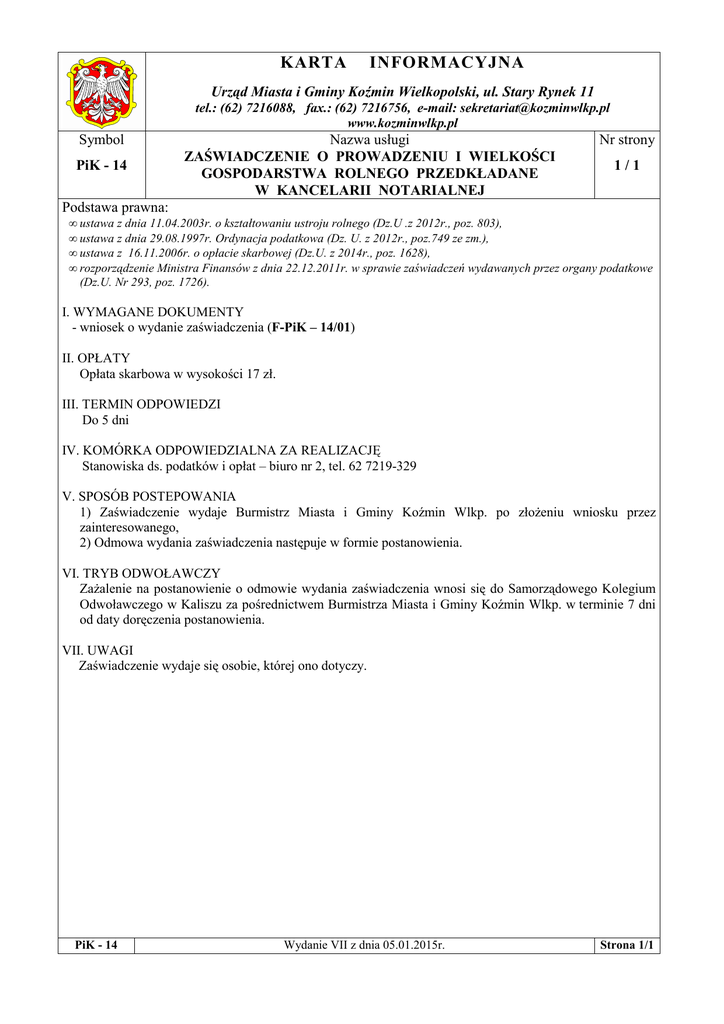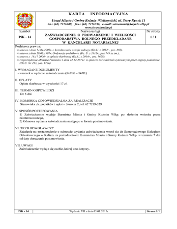 KARTA INFORMACYJNA Urząd Miasta i Gminy Koźmin Wielkopolski, ul. Stary Rynek 11 tel.: (62) 7216088, fax.: (62) 7216756, e-mail: [email protected] www.kozminwlkp.pl Symbol PiK - 14 Nazwa usługi ZAŚWIADCZENIE O PROWADZENIU I WIELKOŚCI GOSPODARSTWA ROLNEGO PRZEDKŁADANE W KANCELARII NOTARIALNEJ Nr strony 1/1 Podstawa prawna: • • • • ustawa z dnia 11.04.2003r. o kształtowaniu ustroju rolnego (Dz.U .z 2012r., poz. 803), ustawa z dnia 29.08.1997r. Ordynacja podatkowa (Dz. U. z 2012r., poz.749 ze zm.), ustawa z 16.11.2006r. o opłacie skarbowej (Dz.U. z 2014r., poz. 1628), rozporządzenie Ministra Finansów z dnia 22.12.2011r. w sprawie zaświadczeń wydawanych przez organy podatkowe (Dz.U. Nr 293, poz. 1726). I. WYMAGANE DOKUMENTY - wniosek o wydanie zaświadczenia (F-PiK – 14/01) II. OPŁATY Opłata skarbowa w wysokości 17 zł. III. TERMIN ODPOWIEDZI Do 5 dni IV. KOMÓRKA ODPOWIEDZIALNA ZA REALIZACJĘ Stanowiska ds. podatków i opłat – biuro nr 2, tel. 62 7219-329 V. SPOSÓB POSTEPOWANIA 1) Zaświadczenie wydaje Burmistrz Miasta i Gminy Koźmin Wlkp. po złoŜeniu wniosku przez zainteresowanego, 2) Odmowa wydania zaświadczenia następuje w formie postanowienia. VI. TRYB ODWOŁAWCZY ZaŜalenie na postanowienie o odmowie wydania zaświadczenia wnosi się do Samorządowego Kolegium Odwoławczego w Kaliszu za pośrednictwem Burmistrza Miasta i Gminy Koźmin Wlkp. w terminie 7 dni od daty doręczenia postanowienia. VII. UWAGI Zaświadczenie wydaje się osobie, której ono dotyczy. PiK - 14 Wydanie VII z dnia 05.01.2015r. Strona 1/1