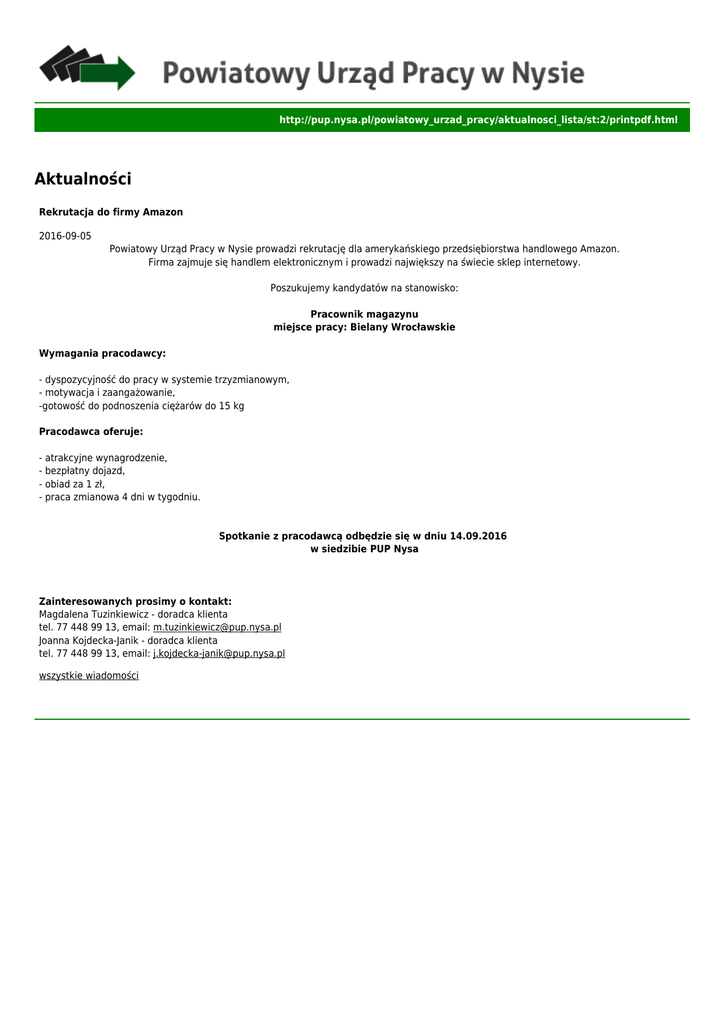 http://pup.nysa.pl/powiatowy_urzad_pracy/aktualnosci_lista/st:2/printpdf.html Aktualności Rekrutacja do firmy Amazon 2016-09-05 Powiatowy Urząd Pracy w Nysie prowadzi rekrutację dla amerykańskiego przedsiębiorstwa handlowego Amazon. Firma zajmuje się handlem elektronicznym i prowadzi największy na świecie sklep internetowy. Poszukujemy kandydatów na stanowisko: Pracownik magazynu miejsce pracy: Bielany Wrocławskie Wymagania pracodawcy: - dyspozycyjność do pracy w systemie trzyzmianowym, - motywacja i zaangażowanie, -gotowość do podnoszenia ciężarów do 15 kg Pracodawca oferuje: - atrakcyjne wynagrodzenie, - bezpłatny dojazd, - obiad za 1 zł, - praca zmianowa 4 dni w tygodniu. Spotkanie z pracodawcą odbędzie się w dniu 14.09.2016 w siedzibie PUP Nysa Zainteresowanych prosimy o kontakt: Magdalena Tuzinkiewicz - doradca klienta tel. 77 448 99 13, email: [email protected] Joanna Kojdecka-Janik - doradca klienta tel. 77 448 99 13, email: [email protected] wszystkie wiadomości