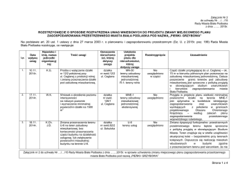 Załącznik Nr 2 do uchwały Nr …/…/15 Rady Miasta Biała Podlaska z dnia ……. 2015r. ROZSTRZYGNIĘCIE O SPOSOBIE ROZPATRZENIA UWAG WNIESIONYCH DO PROJEKTU ZMIANY MIEJSCOWEGO PLANU ZAGOSPODAROWANIA PRZESTRZENNEGO MIASTA BIAŁA PODLASKA POD NAZWĄ „PIEŃKI- GRZYBOWA” Na podstawie art. 20 ust. 1 ustawy z dnia 27 marca 2003 r. o planowaniu i zagospodarowaniu przestrzennym (Dz. U. z 2015r. poz. 199) Rada Miasta Biała Podlaska rozstrzyga, co następuje: Lp. Data wpływu uwag Nazwisko i imię, nazwa jednostki organizacyj nej Treść uwagi Oznaczenie nieruchomo ści, której dotyczy uwaga Ustalenia projektu planu dla nieruchomości, której dotyczy uwaga MN-30 tereny zabudowy mieszkaniowej jednorodzinnej R-1- tereny rolne Rozstrzygnięcie Uzasadnienie Nie uwzględniono w części Część działki przylegającej do ul. Ceglanej – ok. 70 m w kierunku północnym plan przeznacza na zabudowę mieszkaniową jednorodzinną. Dalsze poszerzenie granic terenów pod zabudowę mieszkaniową jest sprzeczne z polityką przyjętą w obowiązującym studium uwarunkowań i kierunków zagospodarowania miasta Biała Podlaska. Przyjęta w projekcie planu wielkość minimalnej powierzchni działki na terenie MNE-1 jest optymalna w kontekście istniejącego zagospodarowania oraz uwarunkowań wynikających z położenia w granicach projektowanego Obszaru Chronionego Krajobrazu – według zaleceń planu zagospodarowania przestrzennego wojewódzkiego lubelskiego. Zmiana dyspozycji funkcjonalno- przestrzennych przedmiotowego terenu będzie sprzeczna z polityką przyjętą w obowiązującym Studium Miasta. Teren znajduje się w strefie uciążliwości akustycznej kolei – bezpośrednio przy terenach kolejowych. Dopuszcza się realizację mieszkań wbudowanych w budynki zgodne z przeznaczeniem terenu pod warunkiem, że nie 1. 10.11. 2014r. K.G. Prośba o wyłączenie działki nr 12/2 położonej przy ul. Ceglanej z produkcji rolnej i zmianę przeznaczenia działki pod zabudowę mieszkaniową. działka nr ewid.12/2 ul. Ceglana 2. 17.11. 2014r. W.K. Wniosek o określenie poziomu intensywności na niższym poziomie i wyznaczenie minimalnej powierzchni działki na 1500 2 m działka nr ewid. 126/1 ul. Ceglana MNE-1 tereny zabudowy mieszkaniowej jednorodzinnej ekstensywnej Nie uwzględniono 3. 18.11. 2014r. K.Ch. J.D. Zmiana przeznaczenia terenu U-6 na teren zabudowy mieszkaniowej, bez konieczności przeznaczania części budynku na działalność usługową lub zwiększenie powierzchni mieszkalnej budynku na terenie U-6. działka nr ewid.82/2 ul. Sokulska U-6 tereny usług Nie uwzględniono Załącznik nr 2 do uchwały Nr …/…/15 Rady Miasta Biała Podlaska z dnia …….2015r. w sprawie uchwalenia zmiany miejscowego planu zagospodarowania przestrzennego miasta Biała Podlaska pod nazwą „PIEŃKI- GRZYBOWA” Strona 1 z 4 będą stanowić więcej niż 10% użytkowej budynku. powierzchni Wniosek o dodanie na końcu §44 ust. 2 „oraz realizację funkcji związanej z działalnością rolną i infrastruktury towarzyszącej”; obszar o pow. 3,1 ha w ewidencji gruntów oznaczony jako RV, RVI, LzV zagospodarowany ekstensywną zabudową mieszkaniową pozostanie w znacznej mierze (2,5 ha) zagospodarowany w sposób dotychczasową tj. działalnością rolną. Wniosek o zmianę w §46 ust. 1 pkt 1 planu minimalnej powierzchni działki na 2 5000m . działki nr ewid. 129, 130 ul. Grzybowa MNE-1 tereny zabudowy mieszkaniowej jednorodzinnej ekstensywnej §44 ust. 2 Nie uwzględniono Dopuszczenie "realizacji funkcji związanej z działalnością rolną i infrastruktury towarzyszącej” na przedmiotowym terenie będzie sprzeczna z polityką przyjętą w obowiązującym studium uwarunkowań i kierunków zagospodarowania miasta Biała Podlaska. Wnioskowana funkcja uzupełniająca może być realizowana jedynie na terenach rolnych wyznaczonych w studium. działki nr ewid. 129, 130 ul. Grzybowa MNE-1 tereny zabudowy mieszkaniowej jednorodzinnej ekstensywnej §46 ust. 1 pkt1 Nie uwzględniono B.P. Wniosek o zmianę w §46 ust. 2 minimalnej powierzchni nowo wydzielonej działki 2 budowlanej na 5000 m . działki nr ewid. 129, 130 ul. Grzybowa MNE-1 tereny zabudowy mieszkaniowej jednorodzinnej ekstensywnej §46 ust. 2 Nie uwzględniono B.P. Wniosek o zmianę w §48 pkt 4 na „maksymalna wysokość budynku od poziomu terenu do najwyżej położonego elementu dachu – 15 m, za wyjątkiem przewyższeń miejscowych, dominant”. działki nr ewid. 129, 130 ul. Grzybowa MNE-1 tereny zabudowy mieszkaniowej jednorodzinnej ekstensywnej §48 pkt 4 Nie uwzględniono Przyjęta w projekcie planu wielkość minimalnej powierzchni działki na terenie MNE-1 jest optymalna w kontekście istniejącego zagospodarowania oraz uwarunkowań wynikających z położenia w granicach projektowanego Obszaru Chronionego Krajobrazu– według zaleceń planu zagospodarowania przestrzennego wojewódzkiego lubelskiego. Przyjęta w projekcie planu wielkość minimalnej powierzchni działki na terenie MNE-1 jest optymalna w kontekście istniejącego zagospodarowania oraz uwarunkowań wynikających z położenia w granicach projektowanego Obszaru Chronionego Krajobrazu. Przyjęta w projekcie planu wielkość maksymalnej wysokości budynku od poziomu terenu do najwyżej położonego elementu na terenie MNE-1 jest optymalna w kontekście istniejącego zagospodarowania oraz uwarunkowań wynikających z położenia w granicach projektowanego Obszaru Chronionego Krajobrazu. 4.1 19.11. 2014r. B.P. 4.2 19.11. 2014r. B.P. 4.3 19.11. 2014r. 4.4 19.11. 2014r. Załącznik nr 2 do uchwały Nr …/…/15 Rady Miasta Biała Podlaska z dnia …….2015r. w sprawie uchwalenia zmiany miejscowego planu zagospodarowania przestrzennego miasta Biała Podlaska pod nazwą „PIEŃKI- GRZYBOWA” Strona 2 z 4 5. 19.11. 2014r. A.W. Wniosek o możliwość parcelacji działki nr 367/1 na warunkach: dopuszczenie podziału działki na działki o powierzchni 2 minimum 1200 m z możliwośc