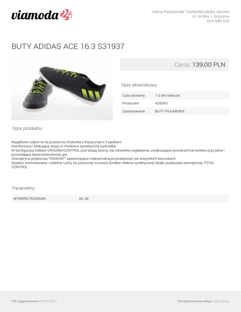Halina Paszkaniak "ViaModa"odzież, obuwie Ul. Krótka 1, brzozów 604 645 233 BUTY ADIDAS ACE 16.3 S31937 Cena: 139,00 PLN Opis słownikowy Czas dostawy 1-2 dni robocze Producent ADIDAS Zastosowanie BUTY PIŁKARSKIE Opis produktu Wyjątkowo odporna na przetarcia cholewka z klasycznymi 3 paskami Komfortowa i blokująca stopy w cholewce syntetyczna wyściółka W konfiguracji kołków GROUND/CONTROL pod stopą tworzy się niewielkie zagłębienie, zwiększające powierzchnię korków przy piłce i pozwalające lepiej kontrolować grę Zewnętrzna podeszwa TRAXION™ zapewniająca maksymalną przyczepność we wszystkich kierunkach Szybkie, kontrolowane i stabilne ruchy na sztucznej murawie (krótkie włókna syntetyczne) dzięki podeszwie zewnętrznej TOTAL CONTROL Parametry WYBIERZ ROZMIAR Plik wygenerowano: 07-03-2017 34, 36 Oprogramowanie sklepu: AptusShop Halina Paszkaniak "ViaModa"odzież, obuwie Ul. Krótka 1, brzozów 604 645 233 Galeria Plik wygenerowano: 07-03-2017 Powered by TCPDF (www.tcpdf.org) Oprogramowanie sklepu: AptusShop