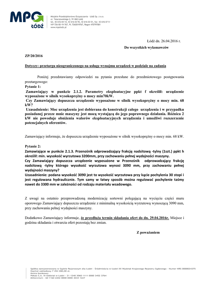 Łódź dn. 26.04.2016 r. Do wszystkich wykonawców ZP/20/2016 Dotyczy: przetargu nieograniczonego na usługę wynajmu urządzeń w podziale na zadania Poniżej przedstawiamy odpowiedzi na pytania przesłane do przedmiotowego postępowania przetargowego: Pytanie 1: Zamawiający w punkcie 2.1.2. Parametry eksploatacyjne ppkt f określił: urządzenie wyposażone w silnik wysokoprężny o mocy min70kW. Czy Zamawiający dopuszcza urządzenie wyposażone w silnik wysokoprężny o mocy min. 68 kW? Uzasadnienie: Moc urządzenia jest dobierana do konstrukcji całego urządzenia i w przypadku posiadanej przeze mnie maszyny jest mocą wystającą do jego poprawnego działania. Różnica 2 kW nie powoduje obniżenia walorów eksploatacyjnych urządzenia i umożliwi rozszerzenie potencjalnych oferentów. Zamawiający informuje, że dopuszcza urządzenie wyposażone w silnik wysokoprężny o mocy min. 68 kW. Pytanie 2: Zamawiające w punkcie 2.1.3. Przenośnik odprowadzający frakcję nadsitową -tylny (1szt.) ppkt h określił: min. wysokość wyrzutowa 3200mm, przy zachowaniu pełnej wydajności maszyny. Czy Zamawiający dopuszcza urządzenie wyposażone w Przenośnik odprowadzający frakcję nadsitową -tylny którego wysokość wyrzutowa wynosi 3090 mm, przy zachowaniu pełnej wydajności maszyny? Uzasadnienie: podana wysokość 3090 jest to wysokość wyrzutowa przy kącie pochylenia 30 stopi i jest regulowana hydraulicznie. Tym samy w łatwy sposób można regulować pochylenie taśmy nawet do 3300 mm w zależności od rodzaju materiału wsadowego. Z uwagi na ostatnio przeprowadzoną modernizację sortowni polegającą na wycięciu części muru oporowego Zamawiający dopuszcza urządzenie z minimalną wysokością wyrzutową wynoszącą 3090 mm, przy zachowaniu pełnej wydajności maszyny. Dodatkowo Zamawiający informuje, że przedłuża termin składania ofert do dn. 29.04.2016r. Miejsce i godzina składania i otwarcia ofert pozostają bez zmian. Z poważaniem