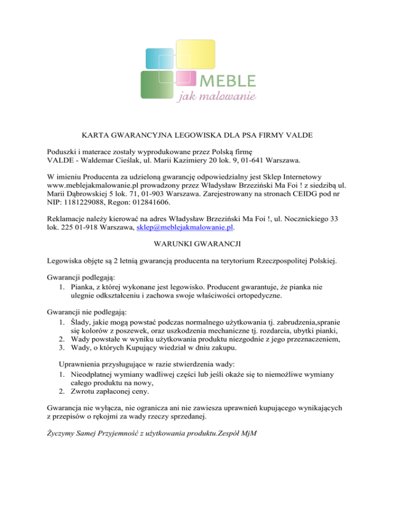 KARTA GWARANCYJNA LEGOWISKA DLA PSA FIRMY VALDE Poduszki i materace zostały wyprodukowane przez Polską firmę VALDE - Waldemar Cieślak, ul. Marii Kazimiery 20 lok. 9, 01-641 Warszawa. W imieniu Producenta za udzieloną gwarancję odpowiedzialny jest Sklep Internetowy www.meblejakmalowanie.pl prowadzony przez Władysław Brzeziński Ma Foi ! z siedzibą ul. Marii Dąbrowskiej 5 lok. 71, 01-903 Warszawa. Zarejestrowany na stronach CEIDG pod nr NIP: 1181229088, Regon: 012841606. Reklamacje należy kierować na adres Władysław Brzeziński Ma Foi !, ul. Nocznickiego 33 lok. 225 01-918 Warszawa, [email protected]. WARUNKI GWARANCJI Legowiska objęte są 2 letnią gwarancją producenta na terytorium Rzeczpospolitej Polskiej. Gwarancji podlegają: 1. Pianka, z której wykonane jest legowisko. Producent gwarantuje, że pianka nie ulegnie odkształceniu i zachowa swoje właściwości ortopedyczne. Gwarancji nie podlegają: 1. Ślady, jakie mogą powstać podczas normalnego użytkowania tj. zabrudzenia,spranie się kolorów z poszewek, oraz uszkodzenia mechaniczne tj. rozdarcia, ubytki pianki, 2. Wady powstałe w wyniku użytkowania produktu niezgodnie z jego przeznaczeniem, 3. Wady, o których Kupujący wiedział w dniu zakupu. Uprawnienia przysługujące w razie stwierdzenia wady: 1. Nieodpłatnej wymiany wadliwej części lub jeśli okaże się to niemożliwe wymiany całego produktu na nowy, 2. Zwrotu zapłaconej ceny. Gwarancja nie wyłącza, nie ogranicza ani nie zawiesza uprawnień kupującego wynikających z przepisów o rękojmi za wady rzeczy sprzedanej. Życzymy Samej Przyjemność z użytkowania produktu.Zespół MjM