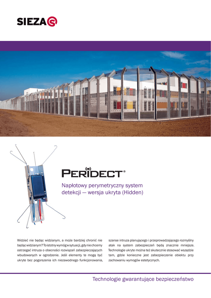 N Napłotowy perymetryczny system detekcji — wersja ukryta (Hidden) de Widzieć nie będąc widzianym, a może bardziej chronić nie będąc widzianym? To istotny wymóg w sytuacji, gdy nie chcemy ostrzegać intruza o obecności rozwiązań zabezpieczających wbudowanych w ogrodzenie. Jeśli elementy te mogą być ukryte bez pogorszenia ich niezawodnego funkcjonowania, szanse intruza planującego i przeprowadzającego rozmyślny atak na system zabezpieczeń będą znacznie mniejsze. Technologie ukryte można też skutecznie stosować wszędzie tam, gdzie konieczne jest zabezpieczenie obiektu przy zachowaniu wymogów estetycznych. Technologie gwarantujące bezpieczeństwo NAPŁOTOWY PERYMETRYCZNY SYSTEM DETEKCJI Dokładny napłotowy perymetryczny system detekcji HIDDEN poszczególnych elementów zgodnie z konkretnymi ZALETY SYSTEMU : zawiera rozwiązania zapewniające warunkami chronionego obiektu oraz wymaganiami precyzyjną i skuteczną ochronę obiektów przy danego klienta. Zastosowanie wyjątkowej dla systemów • Dokładna detekcja najwyższym poziomie zabezpieczeń (4 stopień — „logiki różnicowej” (Differential Logic) • Differential Logic® Hidden znacząco ogranicza fałszywe alarmy wywoływane • Wyjątkowo mało fałszywych alarmów można wykorzystać do zabezpieczania więzień, przez złe warunki pogodowe (silne opady deszczu, • Prosta architektura zabytków i innych obiektów, w przypadku których silne wiatry, grad). • Indywidualne ustawienia każdego wysokie ryzyko). System detektora duże znaczenie ma skuteczny i niewidoczny system ochrony. System System Hidden działający na tej samej można łatwo podłączyć do • Możliwość konfiguracji systemu standardowych systemów zabezpieczania i kontroli. • Szybkie naprawy Możliwe jest też stworzenie całkowicie niezawodnego • Zakres temperatur roboczych , rozwiązania zabezpieczającego poprzez zintegrowanie • Bardzo długi czas eksploatacji skutecznie wykrywa wibracje ogrodzenia spowodowane tego systemu z rozwiązaniami CCTV zgodnymi • Prosta integracja z innymi rozwiązaniami przez z zasadzie, co cała linia produktów bodźce mechaniczne będące skutkiem systemem oprogramowania zarządzającego. prób przejścia przez ogrodzenie (wspinanie się, Oczywiście możliwy jest też zdalny dostęp i regulacja cięcie, podnoszenie) z największą dokładnością ustawień systemu przez internet. technologicznymi (np. CCTV) • Wizualizacja po przystępnych cenach zazwyczaj do 2,5–3 m na jeden panel ogrodzenia. W przeciwieństwie do systemów Jeśli to konieczne, dzięki zastosowanej architekturze Standard i modularnej można w dowolnym momencie rozgałęziać Antivandal, elementy Hidden (szczególnie detektory i/lub przedłużać aktualnie chroniony obwód bez CERTYFIKATY: i moduły wejścia/wyjścia) zaprojektowano pod kątem zmiany wcześniej zainstalowanego sprzętu. Napłotowy • Na zgodność z normą bezpieczeństwa instalacji elementów system detekcji można w łatwy sposób uzupełnić CSN EN 50131-1 w zakresie użytkowania ogrodzenia, przez co wykrycie i rozpoznanie systemu o dokładny podziemny perymetryczny system detekcji w czeskich obiektach wojskowych, systemu wewnątrz indywidualnych ochrony jest dla potencjalnego intruza wyjątkowo trudne. bez dodatkowego inwestowania we wcześniej zainstalowane rozwiązania techniczne. w zastosowaniach cywilnych oraz przez Urząd Bezpieczeństwa Narodowego Republiki Czeskiej W systemie Hidden, tak jak w systemach Standard i można indywidualnie Antivandal, ustawiać System jest dopuszczony do pracy w temperaturach od -55°C do +85°C. parametry • Certyfikat wyrobu technicznego wydany przez Urząd Bezpieczeństwa Narodowego Republiki Czeskiej • Certyfikat GOST-R pozwalający na import i instalację systemu na obszarze WYBRANE PROGRAMY WIZUALIZACYJNE, Z KTÓRYMI MOŻNA ZINTEGROWAĆ SYSTEM Federacji Rosyjskiej • Certyfikat pozwalający na import i instalację systemu na Ukrainie 1 2 3 4 1 2+3 4 5 Niewidoczny system detekcji Hidden Hidden zainstalowany wewnątrz ogrodzenia Detektor systemu Oprogramowanie do konfiguracji Program C4 do wizualizacji systemu detekcji 5 Sieza s.r.o., Buštěhradská 109, Dubí, 272 03 Kladno, Czech Republic, e-mail: [email protected] www.sieza.com Zintegrowany System Zarządzania