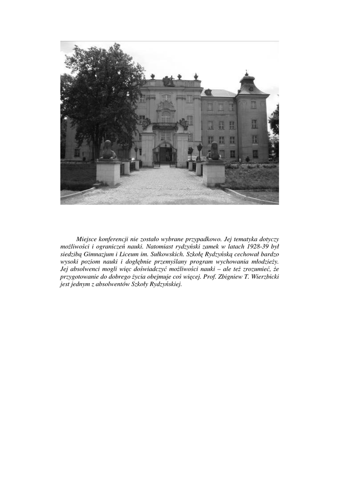 Miejsce konferencji nie zostało wybrane przypadkowo. Jej tematyka dotyczy możliwości i ograniczeń nauki. Natomiast rydzyński zamek w latach 1928-39 był siedzibą Gimnazjum i Liceum im. Sułkowskich. Szkołę Rydzyńską cechował bardzo wysoki poziom nauki i dogłębnie przemyślany program wychowania młodzieży. Jej absolwenci mogli więc doświadczyć możliwości nauki – ale też zrozumieć, że przygotowanie do dobrego życia obejmuje coś więcej. Prof. Zbigniew T. Wierzbicki jest jednym z absolwentów Szkoły Rydzyńskiej. CHARAKTERYSTYKA SZKOŁY RYDZYŃSKIEJ Zbigniew T. Wierzbicki Edyta Żebrowska Szkoła Rydzyńska powstała w 1928 roku za sprawą zapisu fundacyjnego ks. Augusta Sułkowskiego, który przekazał, w przypadku wygaśnięcia rodu Sułkowskich, wszystkie swe dobra na rzecz Komisji Edukacji Narodowej dla bezpłatnego kształcenia niezamożnej, a mającej dobre zadatki moralne młodzieży. Jej dyrektorem został Tadeusz Łopuszański – doświadczony pedagog, który przeszedł przez wszystkie szczeble swego zawodu: od nauczyciela, inspektora szkolnego i wizytatora, do ministra i długoletniego wiceministra oświaty w Polsce, by w końcu stać się założycielem i dyrektorem eksperymentalnej średniej internatowej ogólnokształcącej szkoły w Rydzynie. Rydzyna kuźnią charakterów Głównym celem założonej szkoły było nie tylko kształcenie, lecz również kształtowanie określonych cech charakteru polskiej młodzieży, przyszłej inteligencji polskiej – „kierowniczej warstwy narodu”. Łopuszański twierdził, iż odpowiednio oddziałując na młodzież w najwrażliwszym okresie jej życia, a więc okresie dojrzewania, można ukształtować takie cechy charakteru, które będą mieć istotny wpływ na całe jej dorosłe życie. Cel ten chciał osiągnąć poprzez odpowiedni program nauczania i połączony ze szkołą obowiązkowy internat. Nauczyciel mistrzem i przewodnikiem Uczniowie nawet z pobliskich miejscowości, czy z miasteczka Rydzyny, mieszkali w historycznym zamku książąt Sułkowskich i wspólnie z nauczycielami spożywali posiłki (10 - 12 uczniów przy jednym stole ze swoim wychowawcą). Dzięki temu uczniowie mieli kontakty ze swoimi nauczycielami niemalże przez całą dobę, co ułatwiało pedagogiczne oddziaływanie, jak również uczestniczenie w życiu naukowym szkoły, w kółkach naukowych oraz publikacjach uczniów w szkolnym czasopiśmie „Rydzyniaku”. Rozbudzanie indywidualnych zainteresowań Było to możliwe dzięki z jednej strony rozwijaniu indywidualnych zainteresowań, a z drugiej strony pewnym zmianom programowym, których dokonał Łopuszański, ograniczając przerabiany materiał naukowy do rzeczy – jego zdaniem – istotnie ważnych, bo jak twierdził, obowiązujący program naukowy „utrudnia uczniowi sumienne i gruntowne przerobienie zawsze wszystkiego i uniknięcia niedokładności i luk w wiedzy oraz nie pozostawia mu dość czasu na 23 oddanie się dobrowolnej pracy nad przedmiotami wzbudzającymi w nim szczególne zainteresowanie.” 1 Natomiast dzięki mniejszemu zakresowi obowiązkowej, wszechstronnej wiedzy, którą mieli uczniowie przyswoić, a jednocześnie rozbudowaniu materiału, leżącego w zakresie ich zainteresowań, udało się zharmonizować nauczanie i wychowanie. Jeśli szkoła zdoła tak zorganizować życie młodzieży, by nieinteresujących ją, niemiłych jej prac i zajęć nie było w nim zbyt wiele, a młodzież mogła wyżywać się w zajęciach i pracach ją pociągających, to nie tylko jej wysiłki nad nauką będą bardziej ochotne, wytężone i owocne, ale przede wszystkim na gruncie takiego jej życia, ożywionego zainteresowaniem, wytężonego, bujnego i radosnego, zdołają nauczyciele – wychowawcy osiągnąć o wiele silniejszy wpływ na młodzież, potrafią łatwiej skłonić ją do pracy nad sobą i zaszczepić jej różne wartościowe cechy i siły moralne.2 Jako niewątpliwy sukces pedagogiczny na skalę ogólnopolską, jeśli nie europejską, można uznać likwidację w Szkole Rydzyńskiej tzw. kłamstwa szkolnego: podpowiadania, ściągania. Zdaniem Łopuszańskiego oszukiwanie nauczycieli przez uczniów uniemożliwia stworzenie między nimi bliskiej relacji, a to z kolei pozbawia skuteczności proces wychowania, bo, jak pisał: kłamstwo, nieszczerość, nieuczciwość uczniów wznoszą między nimi a nauczycielami mur, o który rozbijają się najlepsze usiłowania nauczycieli oddziaływania na młodzież, kierowania jej krokami, przychodzenia jej z pomocą w trudnych, a ważnych chwilach jej rozwoju.3 Kształtowanie silnej woli Zdaniem Łopuszańskiego najtrudniejszą do kształtowania w młodzieży jest tzw. silna wola, tzn. taka postawa, która umożliwia finalizowanie podjętych zadań, a z kolei jej brak niweczy każdą rozpoczętą pracę. Dlatego w Szkole Rydzyńskiej kładziono szczególny nacisk na kształtowanie tej cechy na kilku poziomach: w pracowni robót ręcznych, podczas zajęć wychowania fizycznego, w pracach indywidualnych, a także w pracy społecznej, prowadzonej przez uczniów w miasteczku i paru okolicznych wsiach. 1 Łopuszański T., Rydzyna. Gimnazjum im. Sułkowskich (1928-1936), Drukarnia Uniwersytetu Poznańskiego, Rydzyna 1937, s. 72. 2 Łopuszański, Szkoła doświadczalna. Trzechlecie 1936-1939 Gimnazjum i Liceum im. Sułkowskich w Rydzynie, Wydawnictwo „Polonia”, 1985, s. 30. 3 Łopuszański, Rydzyna..., s. 154. 24 „Sportowanie” W Szkole Rydzyńskiej, oprócz porannej gimnastyki oraz dwóch lekcji wychowania fizycznego, odbywały się po południu zajęcia sportowe (zazwyczaj na powietrzu sześć razy w tygodniu po dwie godziny) – wiosną i jesienią: siatkówka, tenis, piłka ręczna i koszykówka na szkolnych boiskach, a zimą: hokej na lodowisku, które stanowiła fosa zamkowa. Aby utrzymać w uczniach ochotę i radość z podejmowanego wysiłku fizycznego, organizowano wewnętrzne i zewnętrzne zawody sportowe. 