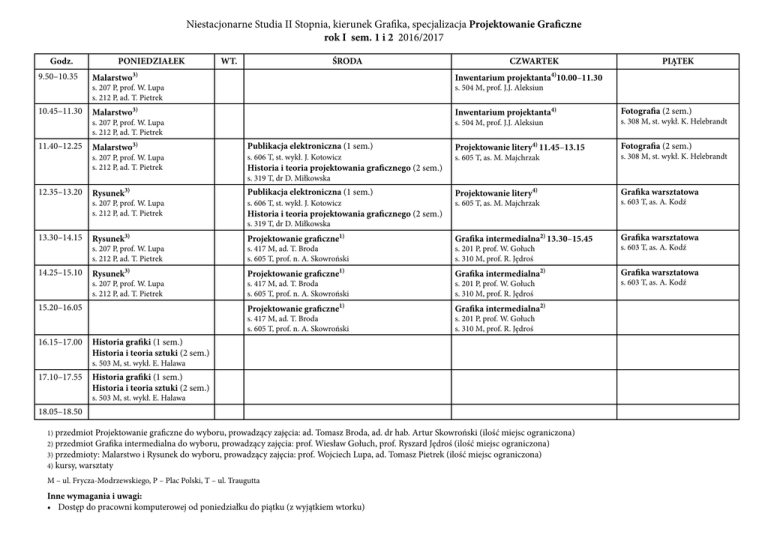Niestacjonarne Studia II Stopnia, kierunek Grafika, specjalizacja Projektowanie Graficzne rok I sem. 1 i 2 2016/2017 Godz. PONIEDZIAŁEK WT. ŚRODA CZWARTEK PIĄTEK 9.50–10.35 Malarstwo3) s. 207 P, prof. W. Lupa s. 212 P, ad. T. Pietrek s. 504 M, prof. J.J. Aleksiun 10.45–11.30 Malarstwo3) Inwentarium projektanta4) Fotografia (2 sem.) Projektowanie litery4) 11.45–13.15 Fotografia (2 sem.) Projektowanie litery4) Grafika warsztatowa 11.40–12.25 12.35–13.20 13.30–14.15 14.25–15.10 s. 207 P, prof. W. Lupa s. 212 P, ad. T. Pietrek Malarstwo3) s. 207 P, prof. W. Lupa s. 212 P, ad. T. Pietrek 3) Rysunek s. 207 P, prof. W. Lupa s. 212 P, ad. T. Pietrek s. 504 M, prof. J.J. Aleksiun Publikacja elektroniczna (1 sem.) s. 606 T, st. wykł. J. Kotowicz Historia i teoria projektowania graficznego (2 sem.) s. 605 T, as. M. Majchrzak s. 308 M, st. wykł. K. Helebrandt s. 319 T, dr D. Miłkowska Publikacja elektroniczna (1 sem.) s. 606 T, st. wykł. J. Kotowicz Historia i teoria projektowania graficznego (2 sem.) s. 605 T, as. M. Majchrzak s. 603 T, as. A. Kodź s. 319 T, dr D. Miłkowska Projektowanie graficzne1) Grafika intermedialna2) 13.30–15.45 Grafika warsztatowa Rysunek3) Projektowanie graficzne1) Grafika intermedialna2) Grafika warsztatowa Projektowanie graficzne1) Grafika intermedialna2) s. 207 P, prof. W. Lupa s. 212 P, ad. T. Pietrek s. 207 P, prof. W. Lupa s. 212 P, ad. T. Pietrek s. 417 M, ad. T. Broda s. 605 T, prof. n. A. Skowroński s. 417 M, ad. T. Broda s. 605 T, prof. n. A. Skowroński s. 417 M, ad. T. Broda s. 605 T, prof. n. A. Skowroński s. 201 P, prof. W. Gołuch s. 310 M, prof. R. Jędroś s. 201 P, prof. W. Gołuch s. 310 M, prof. R. Jędroś s. 201 P, prof. W. Gołuch s. 310 M, prof. R. Jędroś Historia grafiki (1 sem.) Historia i teoria sztuki (2 sem.) s. 503 M, st. wykł. E. Halawa 17.10–17.55 s. 308 M, st. wykł. K. Helebrandt Rysunek 3) 15.20–16.05 16.15–17.00 Inwentarium projektanta4)10.00–11.30 Historia grafiki (1 sem.) Historia i teoria sztuki (2 sem.) s. 503 M, st. wykł. E. Halawa 18.05–18.50 1) przedmiot Projektowanie graficzne do wyboru, prowadzący zajęcia: ad. Tomasz Broda, ad. dr hab. Artur Skowroński (ilość miejsc ograniczona) 2) przedmiot Grafika intermedialna do wyboru, prowadzący zajęcia: prof. Wiesław Gołuch, prof. Ryszard Jędroś (ilość miejsc ograniczona) 3) przedmioty: Malarstwo i Rysunek do wyboru, prowadzący zajęcia: prof. Wojciech Lupa, ad. Tomasz Pietrek (ilość miejsc ograniczona) 4) kursy, warsztaty M – ul. Frycza-Modrzewskiego, P – Plac Polski, T – ul. Traugutta Inne wymagania i uwagi: • Dostęp do pracowni komputerowej od poniedziałku do piątku (z wyjątkiem wtorku) s. 603 T, as. A. Kodź s. 603 T, as. A. Kodź Niestacjonarne Studia II Stopnia, kierunek Grafika, specjalizacja Projektowanie Graficzne rok II sem. 3 i 4 2016/2017 Godz. PONIEDZIAŁEK WTOREK ŚRODA CZWARTEK 9.50–10.35 10.45–11.30 11.40–12.25 12.35–13.20 13.30–14.15 Projektowanie graficzne1) Grafika intermedialna2) 13.30–15.45 14.25–15.10 Projektowanie graficzne1) Grafika intermedialna2) 15.20–16.05 Introligatorstwo Grafika intermedialna2) 16.15–17.00 Introligatorstwo Projektowanie graficzne1) 16.00–18.15 s. 417 M, ad. T. Broda s. 417 M, ad. T. Broda s. 327 P, A. Włodarski s. 327 P, A. Włodarski 17.10–17.55 18.05–18.50 s. 201 P, prof. W. Gołuch s. 310 M, prof. n. M. Grzyb s. 201 P, prof. W. Gołuch s. 310 M, prof. n. M. Grzyb s. 201 P, prof. W. Gołuch s. 310 M, prof. n. M. Grzyb s. 605 T, prof. n. A. Skowroński Projektowanie graficzne1) s. 605 T, prof. n. A. Skowroński Historia i teoria sztuki (3 sem.) Konsultacje magisterskich prac pisemnych (4 sem.) Projektowanie graficzne1) s. 605 T, prof. n. A. Skowroński s. 503 M, st. wykł. E. Halawa 19.00–19.45 Historia i teoria sztuki (3 sem.) Konsultacje magisterskich prac pisemnych (4 sem.) s. 503 M, st. wykł. E. Halawa 1) przedmiot Projektowanie graficzne do wyboru, prowadzący zajęcia: prof. n. Artur Skowroński, ad. Tomasz Broda (ilość miejsc ograniczona) 2) przedmiot Grafika intermedialna do wyboru, prowadzący zajęcia: prof. Wiesław Gołuch, prof. n. Marek Grzyb (ilość miejsc ograniczona) M – ul. Frycza-Modrzewskiego, P – Plac Polski, T – ul. Traugutta Inne wymagania i uwagi: • Dostęp do pracowni komputerowej od poniedziałku do piątku (z wyjątkiem wtorku) PIĄTEK