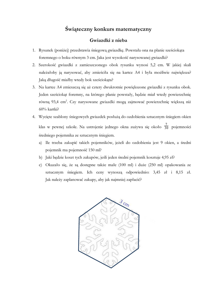 Świąteczny konkurs matematyczny Gwiazdki z nieba 1. Rysunek (poniżej) przedstawia śniegową gwiazdkę. Powstała ona na planie sześciokąta foremnego o boku równym 3 cm. Jaka jest wysokość narysowanej gwiazdki? 2. Szerokość gwiazdki z zamieszczonego obok rysunku wynosi 5,2 cm. W jakiej skali należałoby ją narysować, aby zmieściła się na kartce A4 i była możliwie największa? Jaką długość miałby wtedy bok sześciokąta? 3. Na kartce A4 zmieszczą się aż cztery dwukrotnie powiększone gwiazdki z rysunku obok. Jeden sześciokąt foremny, na którego planie powstały, będzie miał wtedy powierzchnię równą 93,4 cm2. Czy narysowane gwiazdki mogą zajmować powierzchnię większą niż 60% kartki? 4. Wycięte szablony śniegowych gwiazdek posłużą do ozdobienia sztucznym śniegiem okien klas w pewnej szkole. Na ustrojenie jednego okna zużywa się około 7 30 pojemności średniego pojemnika ze sztucznym śniegiem. a) Ile trzeba zakupić takich pojemników, jeżeli do ozdobienia jest 9 okien, a średni pojemnik ma pojemność 150 ml? b) Jaki będzie koszt tych zakupów, jeśli jeden średni pojemnik kosztuje 4,95 zł? c) Okazało się, że są dostępne także małe (100 ml) i duże (250 ml) opakowania ze sztucznym śniegiem. Ich ceny wynoszą odpowiednio: 3,45 zł i 8,15 zł. Jak należy zaplanować zakupy, aby jak najmniej zapłacić?
