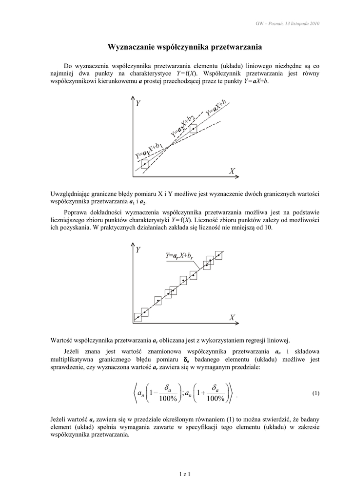 GW – Poznań, 13 listopada 2010 Wyznaczanie współczynnika przetwarzania Do wyznaczenia współczynnika przetwarzania elementu (układu) liniowego niezbędne są co najmniej dwa punkty na charakterystyce Y = f(X). Współczynnik przetwarzania jest równy współczynnikowi kierunkowemu a prostej przechodzącej przez te punkty Y = aX+b. b X+ a Y= Y= a 2X +b 2 Y + a 1X = Y b1 X Uwzględniając graniczne błędy pomiaru X i Y możliwe jest wyznaczenie dwóch granicznych wartości współczynnika przetwarzania a1 i a2. Poprawa dokładności wyznaczenia współczynnika przetwarzania możliwa jest na podstawie liczniejszego zbioru punktów charakterystyki Y = f(X). Liczność zbioru punktów zależy od możliwości ich pozyskania. W praktycznych działaniach zakłada się liczność nie mniejszą od 10. Y Y=ar X+br X Wartość współczynnika przetwarzania ar obliczana jest z wykorzystaniem regresji liniowej. Jeżeli znana jest wartość znamionowa współczynnika przetwarzania an i składowa multiplikatywna granicznego błędu pomiaru δa badanego elementu (układu) możliwe jest sprawdzenie, czy wyznaczona wartość ar zawiera się w wymaganym przedziale: δ δ an 1 − a ; an 1 + a 100% 100% . (1) Jeżeli wartość ar zawiera się w przedziale określonym równaniem (1) to można stwierdzić, że badany element (układ) spełnia wymagania zawarte w specyfikacji tego elementu (układu) w zakresie współczynnika przetwarzania. 1z1