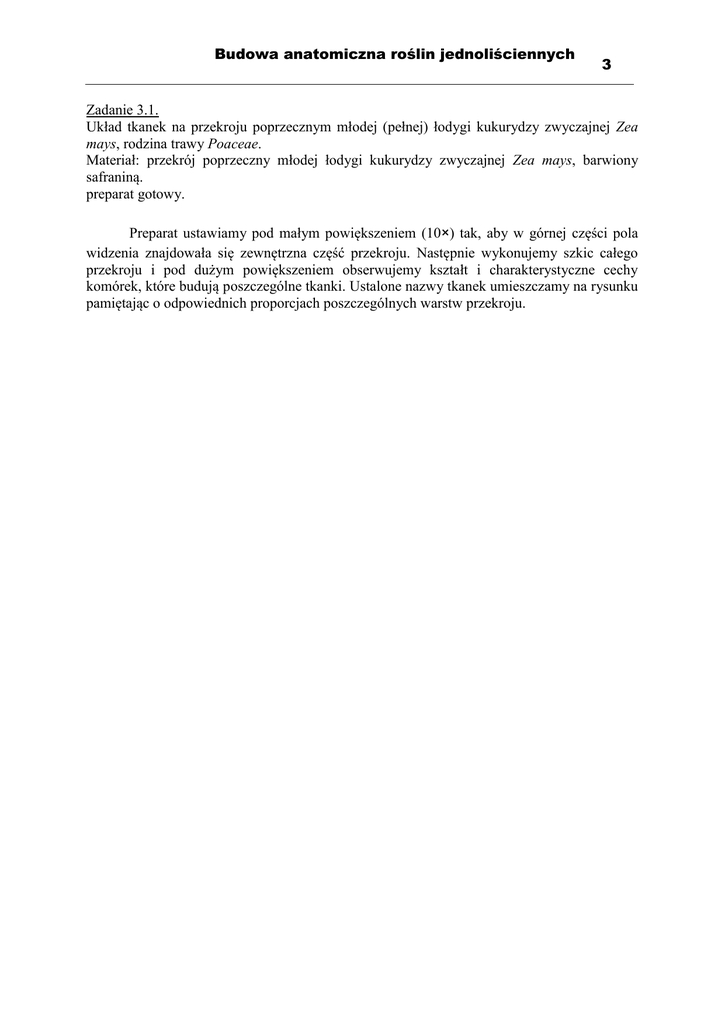 Budowa anatomiczna roślin jednoliściennych 3 Zadanie 3.1. Układ tkanek na przekroju poprzecznym młodej (pełnej) łodygi kukurydzy zwyczajnej Zea mays, rodzina trawy Poaceae. Materiał: przekrój poprzeczny młodej łodygi kukurydzy zwyczajnej Zea mays, barwiony safraniną. preparat gotowy. Preparat ustawiamy pod małym powiększeniem (10×) tak, aby w górnej części pola widzenia znajdowała się zewnętrzna część przekroju. Następnie wykonujemy szkic całego przekroju i pod dużym powiększeniem obserwujemy kształt i charakterystyczne cechy komórek, które budują poszczególne tkanki. Ustalone nazwy tkanek umieszczamy na rysunku pamiętając o odpowiednich proporcjach poszczególnych warstw przekroju. Budowa anatomiczna roślin jednoliściennych 3 Zadanie 3.2. Układ tkanek na przekroju poprzecznym młodej łodygi pszenicy zwyczajnej Triticum aestivum, rodzina trawy Poaceae. Materiał: przekrój poprzeczny młodej łodygi pszenicy zwyczajnej Triticum aestivum, barwiony safraniną. Preparat gotowy. Preparat ustawiamy pod małym powiększeniem (10×) tak, aby w polu widzenia widoczna była jego zewnętrzna krawędź. Po dokładnym obejrzeniu wykonujemy szkic rozmieszczenia poszczególnych tkanek. Następnie oglądamy łodygę w dużym powiększeniu (40×) i określamy typy tkanek tam występujących. Zaznaczamy strefy zajmowane przez: epidermę, sklerenchymę, miękisz asymilacyjny, miękisz zasadniczy i wiązki przewodzące. Zwracamy uwagę na proporcje poszczególnych warstw i kanał powietrzny, zajmujący wnętrze przekroju. Budowa anatomiczna roślin jednoliściennych 3 Zadanie 3.3. Układ tkanek na przekroju poprzecznym łodygi turzycy Carex sp., rodzina turzycowate Cyperaceae Materiał: przekrój poprzeczny łodygi turzycy Carex sp, barwiony safraniną. Preparat gotowy. Rysujemy przekrój poprzeczny łodygi turzycy, zaznaczając wszystkie typy tkanek. Zwracamy uwagę na charakterystyczny kształt przekroju oraz na rdzeń, który może być wypełniony tkanką lub częściowo pusty. Budowa anatomiczna roślin jednoliściennych 3 Zadanie 3.4. Budowa pierwotna korzenia. Materiał: Przekrój poprzeczny korzenia kosaćca (Iris sp.), rodzina kosaćcowate (Iridaceae). Preparat gotowy. Preparat ustawiamy pod małym powiększeniem (10×) tak aby w polu widzenia widoczna była jego zewnętrzna krawędź. Po dokładnym obejrzeniu preparatu wykonujemy schematyczny rysunek, zaznaczamy w nim rozmieszczenie poszczególnych tkanek korzenia. Następnie w dużym powiększeniu (40×) określamy typy tkanek i na rysunku zaznaczamy strefy zajmowane przez: epiblemę, egzodermę, miękisz kory pierwotnej, śródskórnię (endodermę), okolnicę (perycykl), drewno i łyko wiązki radialnej. Zwracamy uwagę na proporcje poszczególnych warstw.