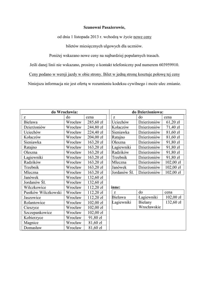 Szanowni Pasażerowie, od dnia 1 listopada 2013 r. wchodzą w życie nowe ceny biletów miesięcznych ulgowych dla uczniów. Poniżej wskazano nowe ceny na najbardziej popularnych trasach. Jeśli danej linii nie wskazano, prosimy o kontakt telefoniczny pod numerem 603959910. Ceny podano w wersji jazdy w obie strony. Bilet w jedną stronę kosztuje połowę tej ceny Niniejsza informacja nie jest ofertą w rozumieniu kodeksu cywilnego i może ulec zmianie. do Wrocławia: z do Bielawa Wrocław Dzierżoniów Wrocław Uciechów Wrocław Kołaczów Wrocław Sieniawka Wrocław Ratajno Wrocław Oleszna Wrocław Łagiewniki Wrocław Radzików Wrocław Trzebnik Wrocław Mleczna Wrocław Janówek Wrocław Jordanów Śl. Wrocław Wilczkowice Wrocław Pustków Wilczkowski Wrocław Jaszowice Wrocław Rolantowice Wrocław Cieszyce Wrocław Szczepankowice Wrocław Kobierzyce Wrocław Magnice Wrocław Domasław Wrocław cena 285,60 zł 244,80 zł 224,40 zł 204,00 zł 163,20 zł 163,20 zł 163,20 zł 163,20 zł 163,20 zł 163,20 zł 163,20 zł 132,60 zł 132,60 zł 112,20 zł 112,20 zł 112,20 zł 102,00 zł 102,00 zł 102,00 zł 91,80 zł 81,60 zł 81,60 zł do Dzierżoniowa: z do cena Uciechów Dzierżoniów 61,20 zł Kołaczów Dzierżoniów 71,40 zł Sieniawka Dzierżoniów 81,60 zł Ratajno Dzierżoniów 81,60 zł Oleszna Dzierżoniów 91,80 zł Łagiewniki Dzierżoniów 91,80 zł Radzików Dzierżoniów 91,80 zł Trzebnik Dzierżoniów 91,80 zł Mleczna Dzierżoniów 102,00 zł Janówek Dzierżoniów 102,00 zł Jordanów Śl. Dzierżoniów 102,00 zł inne: z Bielawa Łagiewniki do cena Łagiewniki 102,00 zł Bielany 132,60 zł Wrocławskie