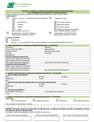Wniosek o otwarcie rachunku oszczędnościowo-rozliczeniowego oraz udostępnienie produktów i usług bankowych Prosimy o czytelne wypełnienie i zaznaczenie znakiem X odpowiednich informacji w polach wyboru. 1. Wnioskuję o*: otwarcie typu: rachunku oszczędnościowo-rozliczeniowego Visa Classic Debetowa MasterCard PayPass Visa Classic Student Naklejka zbliżeniowa Visa payWave Dla Aktywnych Standard Student Senior (Klient wypełnia część A i B) wydanie karty typu: (Klient wypełnia dodatkowo część C) udostępnienie usługi Internet Banking (Klient wypełnia dodatkowo część D) udostępnienie usługi SMS Banking (Klient wypełnia dodatkowo część E) 2. Rodzaj rachunku*: Indywidualny Wspólny*** (w tym przypadku Klient wypełnia dodatkowy wniosek dla Współposiadacza rachunku) A. DANE PERSONALNE POSIADACZA/WSPÓŁPOSIADACZA** RACHUNKU Imię/Imiona: Nazwisko: Numer ewidencyjny PESEL: Data urodzenia: Nazwisko rodowe: Nazwisko rodowe matki: Imię ojca: Imię matki: Obywatelstwo: Pierwszy dokument tożsamości: Rodzaj i numer dokumentu tożsamości: Organ wydający dokument tożsamości: Data wydania dokumentu tożsamości: Data ważności dokumentu tożsamości: Drugi dokument tożsamości**: Rodzaj i numer dokumentu tożsamości: Organ wydający dokument tożsamości: Data wydania dokumentu tożsamości: Data ważności dokumentu tożsamości: B. MIEJSCE ZAMIESZKANIA POSIADACZA/WSPÓŁPOSIADACZA** RACHUNKU 1. Adres stałego zamieszkania: Ulica: Nr domu: Nr lokalu: Miejscowość: Poczta: Kod: 2. Adres korespondencyjny (podać jeżeli inny niż adres zamieszkania) Ulica: Nr domu: Nr lokalu: Miejscowość: Poczta: Kod: 3. Inne dane kontaktowe: numer telefonu domowego: numer telefonu komórkowego: e-mail: C. KARTA PŁATNICZA DLA POSIADACZA/WSPÓŁPOSIADACZA** RACHUNKU Typ karty*: spersonalizowana niespersonalizowana zbliżeniowa naklejka zbliżeniowa Imię i nazwisko do umieszczenia na karcie: UWAGA!!! Na karcie mogą być umieszczone 26 znaków licząc z odstępem pomiędzy imieniem i nazwiskiem. Prosimy nie wpisywać tytułów i pseudonimów. Wnioskuję o ustalenie następujących dziennych limitów transakcyjnych: Dzienny limit transakcji gotówkowych Dzienny limit transakcji bezgotówkowych W tym: Dzienny limit transakcji internetowych D. SYSTEM INTERNET BANKING DLA POSIADACZA/WSPÓŁPOSIADACZA** RACHUNKU 1. Wniosek o korzystanie z Systemu Internet Banking w zakresie*: podglądu sald pełnym bez limitów transakcji pełnym z limitami transakcji: maksymalna kwota jednorazowego przelewu ____________________ maksymalna kwota dzienna wszystkich przelewów ____________________ maksymalna kwota miesięczna wszystkich przelewów ____________________ 2. Hasła jednorazowe do autoryzacji transakcji w SIB w formie*: + 4 8 komunikatów SMS na nr telefonu komórkowego: lista haseł jednorazowych: odbierana osobiście w Banku wysyłana pocztą na adres korespondencyjny Posiadacza rachunku. E. SMS BANKING DLA POSIADACZA/WSPÓŁPOSIADACZA** RACHUNKU 1. Upoważniam Bank Spółdzielczy w Suchej Beskidzkiej do przekazywania na telefon komórkowy numer: + 4 8 informacji o rachunku oszczędnościowo-rozliczeniowym. 2. Informacja ma być wysyłana przez Bank w odpowiedzi na zadane pytanie SMS oraz: po operacji bilansowej (dla rachunków ROR): WN MA Każda na koniec dnia roboczego, jeśli saldo uległo zmianie. F. SPOSÓB PRZEKAZYWANIA WYCIĄGÓW DO RACHUNKU W formie elektronicznej na e-mail podany we wniosku Generowanie i odbiór w bankowości elektronicznej W formie pisemnej na adres do korespondencji Odbiór osobisty w placówce Banku G. OŚWIADCZENIA POSIADACZA/WSPÓŁPOSIADACZA**RACHUNKU 1. Oświadczam, że: 1) 2) 3) 4) 5) 6) Zapoznałem się z „Regulaminem otwierania i prowadzenia rachunków bankowych dla Klientów indywidualnych w Banku Spółdzielczym w Suchej Beskidzkiej” oraz przyjmuję do wiadomości i stosowania wszystkie postanowienia w nim zawarte. Przyjmuję do wiadomości, że zgodnie z art. 23 ust. 1 pkt. 3 Ustawy o ochronie danych osobowych z dnia 29 sierpnia 1997r., (Dz. U. z 2014 r. poz. 1182), Bank Spółdzielczy w Suchej Beskidzkiej, z siedzibą przy ul. Piłsudskiego 5, 34-200 Sucha Beskidzka, jako Administrator Danych ma prawo przetwarzania moich danych osobowych w celu wykonywania Umowy. Przyjmuję do wiadomości, że przysługuje mi prawo dostępu do treści podanych danych osobowych oraz możliwość ich poprawiania. Dobrowolnie wyrażam zgodę/nie wyrażam zgody* na przetwarzanie moich danych osobowych przez Bank w celu marketingu produktów własnych Banku. Dobrowolnie wyrażam zgodę/nie wyrażam zgody* na przesyłanie informacji handlowej za pomocą środków komunikacji elektronicznej w rozumieniu ustawy o świadczeniu usług drogą elektroniczną z dnia 18 lipca 2002 r. (Dz. U. z 2013 r., poz. 1422.) w tym celu wskazuje adres poczty elektronicznej: ……………………..…………………………….. Dobrowolnie wyrażam zgodę/nie wyrażam zgody* na automatyczne przetwarzanie danych, mających na celu ocenę pewnych cech osobowych, dokonywanie analizy zachowania, sytuacji ekonomicznej, preferencji i wiarygodności w celu przedkładania oferty usług spersonalizowanych. …………………………………… (miejscowość, data) …………………………………………………………………… (podpis Posiadacza rachunku) Tożsamość została ustalona na podstawie …………………………………………………………………………………… (nazwa i numer dowodu tożsamości). Stwierdzam własnoręczność podpisu złożonego w mojej obecności. *zaznaczyć właściwe **niepotrzebne skreślić ***opcja niedostępna dla rachunku Dla Aktywnych ………………………………………………………………… (data, pieczątka oraz podpis pracownika Banku) Bank Spółdzielczy w Suchej Beskidzkiej podjął decyzję o otwarciu/odmowie otwarcia** rachunku oszczędnościowo-rozliczeniowego, wydaniu/odmowie wydania*