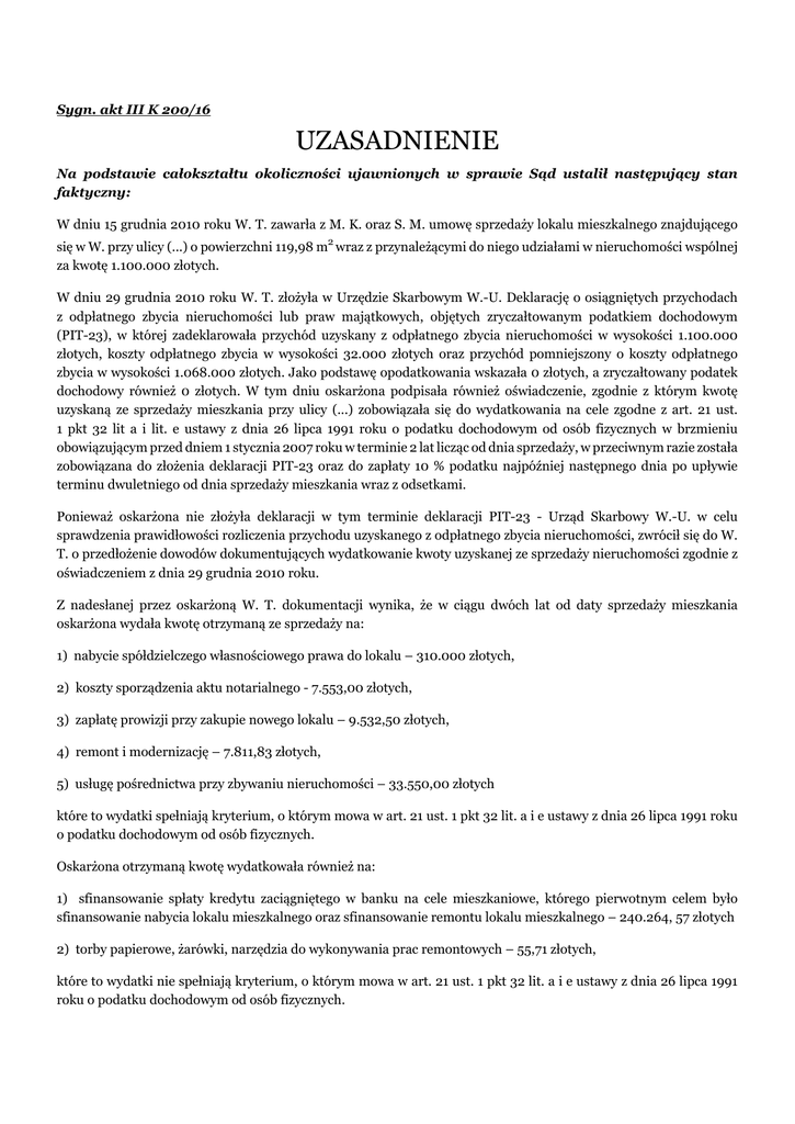 Sygn. akt III K 200/16 UZASADNIENIE Na podstawie całokształtu okoliczności ujawnionych w sprawie Sąd ustalił następujący stan faktyczny: W dniu 15 grudnia 2010 roku W. T. zawarła z M. K. oraz S. M. umowę sprzedaży lokalu mieszkalnego znajdującego się w W. przy ulicy (...) o powierzchni 119,98 m2 wraz z przynależącymi do niego udziałami w nieruchomości wspólnej za kwotę 1.100.000 złotych. W dniu 29 grudnia 2010 roku W. T. złożyła w Urzędzie Skarbowym W.-U. Deklarację o osiągniętych przychodach z odpłatnego zbycia nieruchomości lub praw majątkowych, objętych zryczałtowanym podatkiem dochodowym (PIT-23), w której zadeklarowała przychód uzyskany z odpłatnego zbycia nieruchomości w wysokości 1.100.000 złotych, koszty odpłatnego zbycia w wysokości 32.000 złotych oraz przychód pomniejszony o koszty odpłatnego zbycia w wysokości 1.068.000 złotych. Jako podstawę opodatkowania wskazała 0 złotych, a zryczałtowany podatek dochodowy również 0 złotych. W tym dniu oskarżona podpisała również oświadczenie, zgodnie z którym kwotę uzyskaną ze sprzedaży mieszkania przy ulicy (...) zobowiązała się do wydatkowania na cele zgodne z art. 21 ust. 1 pkt 32 lit a i lit. e ustawy z dnia 26 lipca 1991 roku o podatku dochodowym od osób fizycznych w brzmieniu obowiązującym przed dniem 1 stycznia 2007 roku w terminie 2 lat licząc od dnia sprzedaży, w przeciwnym razie została zobowiązana do złożenia deklaracji PIT-23 oraz do zapłaty 10 % podatku najpóźniej następnego dnia po upływie terminu dwuletniego od dnia sprzedaży mieszkania wraz z odsetkami. Ponieważ oskarżona nie złożyła deklaracji w tym terminie deklaracji PIT-23 - Urząd Skarbowy W.-U. w celu sprawdzenia prawidłowości rozliczenia przychodu uzyskanego z odpłatnego zbycia nieruchomości, zwrócił się do W. T. o przedłożenie dowodów dokumentujących wydatkowanie kwoty uzyskanej ze sprzedaży nieruchomości zgodnie z oświadczeniem z dnia 29 grudnia 2010 roku. Z nadesłanej przez oskarżoną W. T. dokumentacji wynika, że w ciągu dwóch lat od daty sprzedaży mieszkania oskarżona wydała kwotę otrzymaną ze sprzedaży na: 1) nabycie spółdzielczego własnościowego prawa do lokalu – 310.000 złotych, 2) koszty sporządzenia aktu notarialnego - 7.553,00 złotych, 3) zapłatę prowizji przy zakupie nowego lokalu – 9.532,50 złotych, 4) remont i modernizację – 7.811,83 złotych, 5) usługę pośrednictwa przy zbywaniu nieruchomości – 33.550,00 złotych które to wydatki spełniają kryterium, o którym mowa w art. 21 ust. 1 pkt 32 lit. a i e ustawy z dnia 26 lipca 1991 roku o podatku dochodowym od osób fizycznych. Oskarżona otrzymaną kwotę wydatkowała również na: 1) sfinansowanie spłaty kredytu zaciągniętego w banku na cele mieszkaniowe, którego pierwotnym celem było sfinansowanie nabycia lokalu mieszkalnego oraz sfinansowanie remontu lokalu mieszkalnego – 240.264, 57 złotych 2) torby papierowe, żarówki, narzędzia do wykonywania prac remontowych – 55,71 złotych, które to wydatki nie spełniają kryterium, o którym mowa w art. 21 ust. 1 pkt 32 lit. a i e ustawy z dnia 26 lipca 1991 roku o podatku dochodowym od osób fizycznych. W związku z powyższym w dniu 1 kwietnia 2015 roku zostało wszczęte postępowanie podatkowe, w wyniku którego w dniu 26 maja 2015 roku została wydana decyzja, w której określono kwotę zobowiązania podatkowego oskarżonej w 10% zryczałtowanym podatku dochodowym w wysokości 73.155,00 złotych. Obecnie oskarżona W. T. ma 57 lat, legitymuje się wykształceniem średnim, z zawodu jest ekonomistą, jest osobą bezrobotną, nie posiada majątku, nie ma nikogo na utrzymaniu, pozostaje osobą niekaraną. Sąd ustalił powyższy stan faktyczny na podstawie: częściowo wyjaśnień oskarżonej (k. 92v-93, 144-146), zawiadomienia (k. 1-2), aktu notarialnego (k. 21-32), deklaracji (k. 35), oświadczenia (k. 36), wykazu informacji o czynnościach majątkowych (k. 60-61), decyzji naczelnika US (k. 62-69), postanowienia Dyrektora Izby Skarbowej (k. 73-76), karty karnej (k. 94), listy zaległości oskarżonej (k. 96, 142), informacji podatkowej (k. 103). W. T. przesłuchana w trakcie postępowania przygotowawczego przyznała się do winy (k. 93v-94) i wyjaśniła, że w momencie, w którym sprzedawała nieruchomość prowadziła działalność gospodarczą i obracała dużą ilością pieniędzy – była przekonana, że będzie w stanie zapłacić kwotę ewentualnego podatku. Wyjaśniła, że kupiła mieszkanie za kwotę 300.000 złotych, spłaciła kredyt w banku za około 200 000 złotych, zaś resztę kwoty zainwestowała w działalność gospodarczą. Inwestycja okazała się nietrafiona, oskarżona nie uzyskała wystarczających dochodów. Przesłuchana przed Sądem oskarżona nie przyznała się do zarzuconego jej czynu. Wyjaśniła, że nie wiedziała, że musi składać deklarację PIT-23. Uważała, że po sprzedaży mieszkania „sprawa jest załatwiona”. Wskazała, że myślała, że postępowanie toczy się o podatek od nieruchomości, który jest ściągalny po dwóch latach. Przyznała, że podpisała oświadczenie znajdujące się na k. 36 akt sprawy. Sąd uznał wyjaśnienia oskarżonej W. T. za wiarygodne tylko częściowo, to jest w zakresie jej wyjaśnień z postępowania przygotowawczego. Są one spójne, logiczne i korespondują z resztą materiału dowodowego zgromadzonego w sprawie, przede wszystkim z jej oświadczeniem z dnia 29 grudnia 2016 roku, w którym zobowiązała się do wydatkowania środków pieniężnych otrzymanych ze sprzedaży mieszkania na cele, o których mowa w art. 21 ust. 1 pkt 32 lit. a i e ustawy z dnia 26 lipca 1991 roku o podatku dochodowym od osób fizycznych, a także, w przypadku niewydatkowania całości środków na wskazane cele, do zapłacenia zaległego podatku oraz wypełnienia deklaracji PIT-23. Zdaniem Sądu, wersja przedstawiona przez oskarżoną na rozprawie 