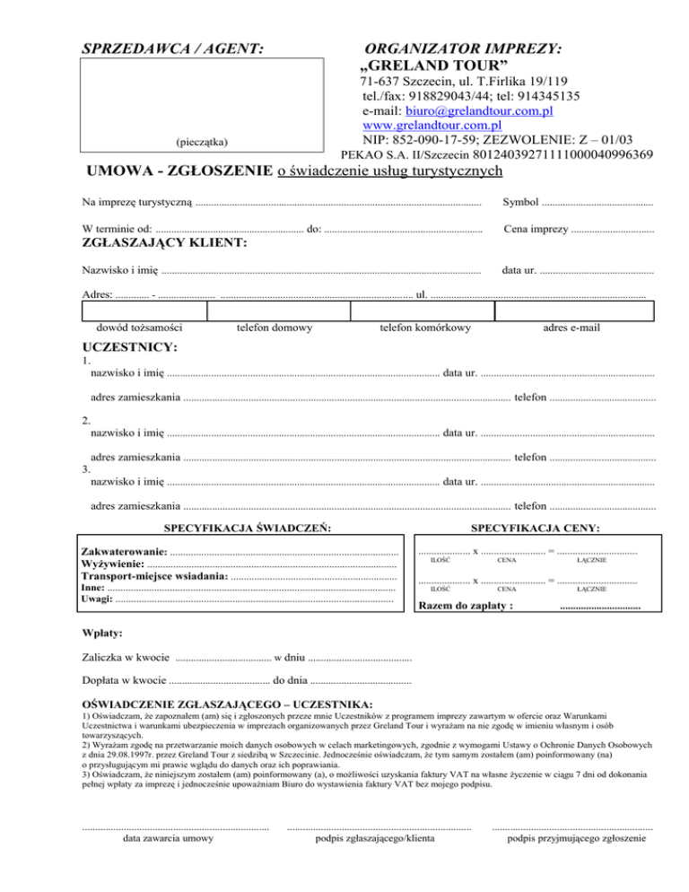 SPRZEDAWCA / AGENT: ORGANIZATOR IMPREZY: „GRELAND TOUR” 71-637 Szczecin, ul. T.Firlika 19/119 tel./fax: 918829043/44; tel: 914345135 e-mail: [email protected] www.grelandtour.com.pl NIP: 852-090-17-59; ZEZWOLENIE: Z – 01/03 PEKAO S.A. II/Szczecin 80124039271111000040996369 (pieczątka) UMOWA - ZGŁOSZENIE o świadczenie usług turystycznych Na imprezę turystyczną .............................................................................................................. Symbol ........................................... W terminie od: ......................................................... do: ............................................................. Cena imprezy ................................ ZGŁASZAJĄCY KLIENT: Nazwisko i imię ........................................................................................................................... data ur. ............................................ Adres: ............. - ...................... .......................................................................... ul. ................................................................................... dowód tożsamości telefon domowy telefon komórkowy adres e-mail UCZESTNICY: 1. nazwisko i imię ......................................................................................................... data ur. ................................................................... adres zamieszkania .............................................................................................................................. telefon ......................................... 2. nazwisko i imię ......................................................................................................... data ur. ................................................................... adres zamieszkania .............................................................................................................................. telefon ......................................... 3. nazwisko i imię ......................................................................................................... data ur. ................................................................... adres zamieszkania .............................................................................................................................. telefon ......................................... SPECYFIKACJA ŚWIADCZEŃ: Zakwaterowanie: ........................................................................................ Wyżywienie: ................................................................................................ Transport-miejsce wsiadania: ................................................................ Inne: ............................................................................................................... Uwagi: ........................................................................................................... SPECYFIKACJA CENY: .................... x ......................... = ............................... ILOŚĆ CENA ŁĄCZNIE .................... x ......................... = ............................... ILOŚĆ CENA Razem do zapłaty : ŁĄCZNIE ............................... Wpłaty: Zaliczka w kwocie ..................................... w dniu ........................................ Dopłata w kwocie ....................................... do dnia ....................................... OŚWIADCZENIE ZGŁASZAJĄCEGO – UCZESTNIKA: 1) Oświadczam, że zapoznałem (am) się i zgłoszonych przeze mnie Uczestników z programem imprezy zawartym w ofercie oraz Warunkami Uczestnictwa i warunkami ubezpieczenia w imprezach organizowanych przez Greland Tour i wyrażam na nie zgodę w imieniu własnym i osób towarzyszących. 2) Wyrażam zgodę na przetwarzanie moich danych osobowych w celach marketingowych, zgodnie z wymogami Ustawy o Ochronie Danych Osobowych z dnia 29.08.1997r. przez Greland Tour z siedzibą w Szczecinie. Jednocześnie oświadczam, że tym samym zostałem (am) poinformowany (na) o przysługującym mi prawie wglądu do danych oraz ich poprawiania. 3) Oświadczam, że niniejszym zostałem (am) poinformowany (a), o możliwości uzyskania faktury VAT na własne życzenie w ciągu 7 dni od dokonania pełnej wpłaty za imprezę i jednocześnie upoważniam Biuro do wystawienia faktury VAT bez mojego podpisu. ........................................................................ data zawarcia umowy ....................................................................... podpis zgłaszającego/klienta .............................................................. podpis przyjmującego zgłoszenie