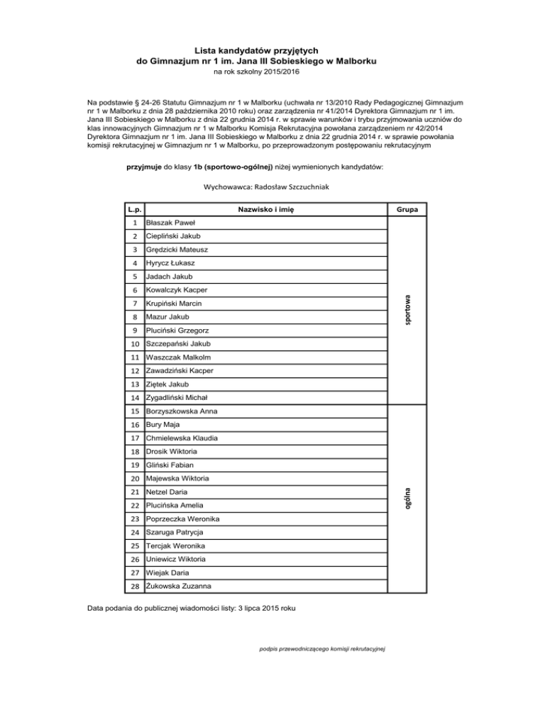 Lista kandydatów przyjętych do Gimnazjum nr 1 im. Jana III Sobieskiego w Malborku na rok szkolny 2015/2016 Na podstawie § 24-26 Statutu Gimnazjum nr 1 w Malborku (uchwała nr 13/2010 Rady Pedagogicznej Gimnazjum nr 1 w Malborku z dnia 28 października 2010 roku) oraz zarządzenia nr 41/2014 Dyrektora Gimnazjum nr 1 im. Jana III Sobieskiego w Malborku z dnia 22 grudnia 2014 r. w sprawie warunków i trybu przyjmowania uczniów do klas innowacyjnych Gimnazjum nr 1 w Malborku Komisja Rekrutacyjna powołana zarządzeniem nr 42/2014 Dyrektora Gimnazjum nr 1 im. Jana III Sobieskiego w Malborku z dnia 22 grudnia 2014 r. w sprawie powołania komisji rekrutacyjnej w Gimnazjum nr 1 w Malborku, po przeprowadzonym postępowaniu rekrutacyjnym przyjmuje do klasy 1b (sportowo-ogólnej) niżej wymienionych kandydatów: Wychowawca: Radosław Szczuchniak 1 Błaszak Paweł 2 Ciepliński Jakub 3 Grędzicki Mateusz 4 Hyrycz Łukasz 5 Jadach Jakub 6 Kowalczyk Kacper 7 Krupiński Marcin 8 Mazur Jakub 9 Pluciński Grzegorz Grupa sportowa Nazwisko i imię L.p. 10 Szczepański Jakub 11 Waszczak Malkolm 12 Zawadziński Kacper 13 Ziętek Jakub 14 Zygadliński Michał 15 Borzyszkowska Anna 16 Bury Maja 17 Chmielewska Klaudia 18 Drosik Wiktoria 19 Gliński Fabian ogólna 20 Majewska Wiktoria 21 Netzel Daria 22 Plucińska Amelia 23 Poprzeczka Weronika 24 Szaruga Patrycja 25 Tercjak Weronika 26 Uniewicz Wiktoria 27 Wiejak Daria 28 Żukowska Zuzanna Data podania do publicznej wiadomości listy: 3 lipca 2015 roku podpis przewodniczącego komisji rekrutacyjnej