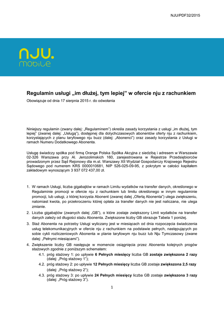 NJU/PDF32/2015 Regulamin usługi „im dłużej, tym lepiej” w ofercie nju z rachunkiem Obowiązuje od dnia 17 sierpnia 2015 r. do odwołania Niniejszy regulamin (zwany dalej: „Regulaminem”) określa zasady korzystania z usługi „im dłużej, tym lepiej” (zwanej dalej: „Usługą”), dostępnej dla dotychczasowych abonentów oferty nju z rachunkiem, korzystających z planu taryfowego nju buzz (dalej: „Abonenci”) oraz zasady korzystania z Usługi w ramach Numeru Dodatkowego Abonenta. Usługę świadczy spółka pod firmą Orange Polska Spółka Akcyjna z siedzibą i adresem w Warszawie 02-326 Warszawa przy Al. Jerozolimskich 160, zarejestrowana w Rejestrze Przedsiębiorców prowadzonym przez Sąd Rejonowy dla m.st. Warszawy XII Wydział Gospodarczy Krajowego Rejestru Sądowego pod numerem KRS 0000010681, NIP 526-025-09-95, z pokrytym w całości kapitałem zakładowym wynoszącym 3 937 072 437,00 zł. 1. W ramach Usługi, liczba gigabajtów w ramach Limitu wydatków na transfer danych, określonego w Regulaminie promocji w ofercie nju z rachunkiem lub limitu określonego w innym regulaminie promocji, lub usługi, z której korzysta Abonent (zwanej dalej „Ofertą Abonenta”) ulega zwiększeniu, natomiast kwota, po przekroczeniu której opłata za transfer danych nie jest naliczana, nie ulega zmianie. 2. Liczba gigabajtów (zwanych dalej „GB”), o które zostaje zwiększony Limit wydatków na transfer danych zależy od długości stażu Abonenta. Zwiększone liczby GB obrazuje Tabela 1 poniżej. 3. Staż Abonenta na potrzeby Usługi wyliczany jest w miesiącach od dnia rozpoczęcia świadczenia usług telekomunikacyjnych w ofercie nju z rachunkiem na podstawie pełnych, następujących po sobie cykli rozliczeniowych Abonenta w planie taryfowym nju buzz lub Nju Tymczasowy (zwane dalej: „Pełnymi miesiącami”). 4. Zwiększenie liczby GB następuje w momencie osiągnięcia przez Abonenta kolejnych progów stażowych zgodnie z poniższym schematem: 4.1. próg stażowy 1: po upływie 6 Pełnych miesięcy liczba GB zostaje zwiększona 2 razy (dalej: „Próg stażowy 1”); 4.2. próg stażowy 2: po upływie 12 Pełnych miesięcy liczba GB zostaje zwiększona 2,5 razy (dalej: „Próg stażowy 2”); 4.3. próg stażowy 3: po upływie 24 Pełnych miesięcy liczba GB zostaje zwiększona 3 razy (dalej: „Próg stażowy 3”). 1 NJU/PDF32/2015 5. Zwiększona liczba GB obowiązuje w każdym okresie rozliczeniowym, następującym po osiągnięciu danego Progu stażowego do momentu osiągnięcia przez Abonenta kolejnego Progu stażowego. 6. W zależności od Oferty Abonenta, zwiększenie liczby GB następuje w stosunku do następujących limitów wydatków: 6.1. Limit wydatków na transfer danych określony w Regulaminie promocji w ofercie „nju z rachunkiem”; 6.2. Limit wydatków na transfer danych w usłudze „Więcej internetu” określony w Regulaminie Usługi „więcej internetu” w ofercie nju z rachunkiem; 6.3. Wspólny limit wydatków w usłudze „Jeden na wszystko” określony w Regulaminie usługi „Jeden na wszystko” w ofercie nju z rachunkiem; 6.4. Limit wydatków na wszystko komórkowe w usłudze „Wszystko komórkowe za 29 zł” określony w Regulaminie usługi „Wszystko komórkowe za 29 zł”. 7. Zwiększenie liczby GB w ramach Usługi nie wiąże się z dodatkowymi opłatami, a dodatkowe GB są rozliczane na zasadach określonych w Regulaminie promocji w ofercie nju z rachunkiem lub w jednym z regulaminów wskazanych w pkt 6 powyżej, w zależności od tego, czy Abonent korzysta z usługi dodatkowej. Tabela 1 Liczba GB do wykorzystania z pełną prędkością OFERTA ABONENTA NAZWA LIMITU WYDATKÓW Promocja w ofercie „nju z rachunkiem” Limit wydatków na transfer danych 3 GB 6 GB 7,5 GB 9 GB Więcej internetu Limit wydatków na transfer danych 10 GB 20 GB 25 GB 30 GB Jeden na wszystko Wspólny limit wydatków 2 GB 4 GB 5 GB 6 GB Wszystko komórkowe za 29 zł Limit wydatków na wszystko komórkowe 2 GB 4 GB 5 GB 6 GB liczba GB Próg stażowy 1 Próg stażowy 2 Próg stażowy 3 Jak włączyć Usługę 8. Usługa wymaga aktywacji. 9. Aktywacja Usługi jest bezpłatna. 10. Aktywacji Usługi można dokonać w następujący sposób: 10.1. poprzez wysłanie SMS-a o treści AKT pod bezpłatny numer 8021 albo, 10.2. po zalogowaniu na portalu www.njumobile.pl wybierając Usługę w zakładce usługi. 11. Usługa zostanie włączona w ciągu 24 godzin od momentu zlecenia aktywacji przez Abonenta, a o włączeniu Usługi Abonent zostanie powiadomiony SMS-em. 12. W przypadku, gdy staż Abonenta jest krótszy niż wymagany do osiągnięcia Progu stażowego 1, Abonent otrzyma informację w SMS-ie potwierdzającym włączenie Usługi, a pierwsze Zwiększenie liczby GB w Ofercie Abonenta nastąpi po osiągnięciu Progu stażowego 1. Abonent zostanie poinformowany SMS-em o zwiększeniu liczby GB. 13. Dla Abonenta, który w momencie aktywacji Usługi osiągnął którykolwiek z progów stażowych zwiększenie liczby GB nastąpi od razu w momencie włączenia Usługi. 14. W przypadku aktywacji Usługi w trakcie trwania cyklu rozliczeniowego liczba GB zostanie zwiększona 2 albo 2,5 albo 3 razy w zależności od progu stażowego, który przekroczył Abonent w odniesieniu do ilości GB w ramach Oferty Abonenta. 2 NJU/PDF32/2015 Jak wyłączyć Usługę 15. Dezaktywacji Usługi można dokonać w następujący sposób: 15.1. poprzez wysłanie SMS-a o treści STOP pod bezpłatny numer 8021 albo, 15.2. po zalogowaniu na portalu www.njumobile.pl dezaktywując Usługę w zakładce usługi. 16. Dezaktywacja Usługi jest bezpłatna. 17. Usługa zostanie wyłączona z końcem okresu rozliczeniowego, w którym została zlecona jej dezaktywacja. 18. Dezaktywacja Usługi nie zmienia stażu Abonenta. Jak sprawdzić stan GB 19. W każdej chwili Abonent ma możliwość sprawdzenia stanu pozostałych do wykorzystania GB, korzystając ze sposobów określonych w regulaminie Ofer