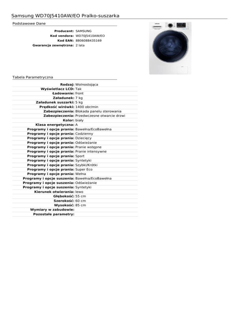 Samsung WD70J5410AW/EO Pralko-suszarka Podstawowe Dane Producent: SAMSUNG Kod vendora: WD70J5410AW/EO Kod EAN: 8806088435169 Gwarancja zewnętrzna: 2 lata Tabela Parametryczna Rodzaj: Wolnostojąca Wyświetlacz LCD: Tak Ładowanie: front Załadunek: 7 kg Załadunek suszarki: 5 kg Prędkość wirówki: 1400 obr/min Zabezpieczenia: Blokada panelu sterowania Zabezpieczenia: Przedwczesne otwarcie drzwi Kolor: biały Klasa energetyczna: A Programy i opcje prania: Bawełna/EcoBawełna Programy i opcje prania: Codzienny Programy i opcje prania: Dziecięcy Programy i opcje prania: Odświeżanie Programy i opcje prania: Pranie wstępne Programy i opcje prania: Pranie intensywne Programy i opcje prania: Sport Programy i opcje prania: Syntetyki Programy i opcje prania: Szybki/Krótki Programy i opcje prania: Super Eco Programy i opcje prania: Wełna Programy i opcje suszenia: Bawełna/EcoBawełna Programy i opcje suszenia: Odświeżanie Programy i opcje suszenia: Syntetyki Kierunek otwierania: lewo Głębokość: 55 cm Szerokość: 60 cm Wysokość: 85 cm Wymiary w zabudowie: Pozostałe parametry: Powered by TCPDF (www.tcpdf.org)