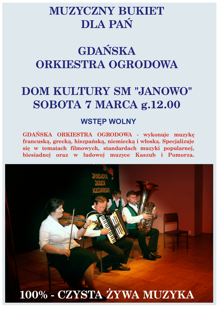 MUZYCZNY BUKIET DLA PAÑ GDAÑSKA ORKIESTRA OGRODOWA DOM KULTURY SM "JANOWO" SOBOTA 7 MARCA g.12.00 WSTÊP WOLNY GDAÑSKA ORKIESTRA OGRODOWA - wykonuje muzykê francusk¹, greck¹, hiszpañsk¹, niemieck¹ i w³osk¹. Specjalizuje siê w tematach filmowych, standardach muzyki popularnej, biesiadnej oraz w ludowej muzyce Kaszub i Pomorza. 100% - CZYSTA ¯YWA MUZYKA