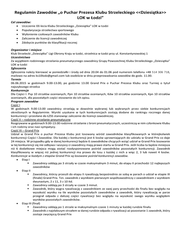 Regulamin Zawodów „o Puchar Prezesa Klubu Strzeleckiego <<Dziesiątka>> LOK w Łodzi” Cel zawodów: Uczczenie XX-lecia Klubu Strzeleckiego „Dziesiątka” LOK w Łodzi Popularyzacja strzelectwa sportowego Wyłonienie czołowych zawodników Klubu Zaliczenie do licencji zawodniczej Zdobycie punktów do klasyfikacji rocznej Organizator i miejsce Klub Strzelecki „Dziesiątka” Ligi Obrony Kraju w Łodzi, strzelnica w Łodzi przy ul. Konstantynowskiej 1 Uczestnictwo Za wyjątkiem rodzinnego strzelania pneumatycznego zawodnicy Grupy Powszechnej Klubu Strzeleckiego „Dziesiątka” LOK w Łodzi Zgłoszenia Zgłoszenia należy kierować w poniedziałki i środy od dnia 20.04 do 01.06 pod numerem telefonu +48 514 306 718, mailowo na adres [email protected] lub osobiście w dniu przeprowadzania zawodów do godz. 11.00. Termin 06.06.2015 w godzinach 9.00-13.00, po godzinie 13.00 Grand Prix o Puchar Prezesa Klubu oraz Turniej o tytuł najszybszego strzelca Konkurencje Dla Części I: Psp 10 strzałów ocenianych, Ppn 10 strzałów ocenianych, Kdw 10 strzałów ocenianych, Kpn 10 strzałów ocenianych, dla pozostałych części stosownie do ich opisu. Program zawodów Część I W godzinach 9.00-13.00 zawodnicy strzelają w dowolnie wybranej lub wybranych przez siebie konkurencjach określonych w Regulaminie. Wyniki uzyskane w tych konkurencjach zostają dodane do rankingu rocznego danej konkurencji i przesłane do ŁZSS stanowiąc zaliczenie do licencji zawodniczej. Część II – rodzinne strzelanie pneumatyczne Rozgrywane w godzinach 9.00-13.00 rodzinne strzelanie z broni pneumatycznych, uczestniczą w nim członkowie Klubu i ich rodziny oraz nasi sympatycy. Część III – Grand Prix Udział w Grand Prix o puchar Prezesa Klubu jest losowany wśród zawodników klasyfikowanych w którejkolwiek konkurencji Części I Zawodów. Dla każdej z konkurencji jest 6 losów uprawniających do udziału w Grand Prix co daje 24 miejsca. W przypadku gdy w danej konkurencji będzie 6 zawodników chcących wziąć udział w Grand Prix losowanie w tej konkurencji się nie odbywa i wszyscy ci zawodnicy mają prawo startu w Grand Prix. Jeśli liczba ta będzie mniejsza niż 6 dodatkowe miejsca mogą zostać rozdysponowane pośród zawodników pozostałych konkurencji. Zawodnik klasyfikowany w więcej niż jednej konkurencji ma prawo do losu z każdej z nich a więc 2, 3 lub nawet 4 losów. Konkurencje w każdym z etapów Grand Prix są losowane pośród konkurencji zawodów. Etap I Zawodnicy oddają po 3 strzały w czasie maksymalnym 3 minut, do etapu II przechodzi 12 najlepszych zawodników Etap II Zawodnicy, którzy przeszli do etapu II rywalizują bezpośrednio ze sobą w parach o udział w etapie III (finale) Grand Prix. Tzn. zawodnik z wynikiem pierwszym współzawodniczy z zawodnikiem z wynikiem dwunastym, 2 z 11, 3 z 10 itd. Zawodnicy oddają po 3 strzały w czasie 3 minut. Zawodnik, który wygra rywalizację z zawodnikiem ze swej pary przechodzi do finału bez względu na wysokość wyniku na tle wyników pozostałych zawodników a zawodnik, który rywalizację w parze przegrał odpada z dalszej części rywalizacji bez względu na wysokość swego wyniku względem wyników pozostałych zawodników. Etap III (finał) Zawodnicy oddają po 1 strzale w maksymalnym czasie 1 minuty w każdej rundzie finału Zawodnik z najsłabszym strzałem w danej rundzie odpada z rywalizacji aż pozostanie 1 zawodnik, który zostaje zwycięzcą Grand Prix Część IV – Turniej o tytuł najszybszego strzelca Udział w Turnieju jest losowany wśród zawodników klasyfikowanych w którejkolwiek konkurencji Części I Zawodów. Zawodnik klasyfikowany w więcej niż jednej konkurencji ma prawo do losu z każdej z nich a więc 2, 3 lub nawet 4 losów. Strzelanie odbywa się z pistoletu 5,6mm. W zawodach mierzy się czas strzelania każdego zawodnika Etap I Zawodnicy oddają kolejno po jednym strzale do każdej z trzech tarcz. Wynik strzelania zostaje obliczony metodą Comstock tj. wynik na tarczach dzieli się przez czas zawodnika. Do finału przechodzi trzech zawodników tego etapu. Etap II (finał) Zawodnicy oddają kolejno po jednym strzale do każdej z trzech tarcz. Kolejność w turnieju ustalana jest przez wynik strzelania zawodników w finale, który obliczony zostaje metodą Comstock. Zwycięzca otrzymuje tytuł najszybszego strzelca Klubu roku 2015. Klasyfikacja i nagrody Klasyfikacja indywidualna we wszystkich konkurencjach Za zajęcie miejsca I w danej konkurencji Części I Zawodów puchar, medal oraz dyplom Za zajęcie miejsc od II do III w danej konkurencji Części I Zawodów medale i dyplomy Za zajęcie miejsca I w Grand Prix puchar Prezesa Klubu, medal oraz dyplom Za zajęcie miejsc II-III w Grand Prix medale i dyplomy Za zajęcie miejsca I w Turnieju o tytuł najszybszego strzelca puchar, medal oraz dyplom Za zajęcie miejsc od II do III w Turnieju o tytuł najszybszego strzelca medale i dyplomy Opłaty 10 PLN od zawodnika tytułem wpisowego do zawodów bez względu na ilość konkurencji (nie jest pobierana od osób, które nie ukończyły 18 roku życia) 50 PLN od konkurencji z Części I 10 PLN od startu w Grand Prix 10 PLN od startu w Turnieju o tytuł najszybszego strzelca Różne Broń, amunicję oraz obsługę sędziowską zapewnia Organizator (Organizator dopuszcza możliwość korzystania z własnej broni i amunicji, zgodnych ze specyfikacją broni i amunicji zapewnianej przez Organizatora co nie zmienia opłaty za konkurencję) W sprawach nieujętych w niniejszym regulaminie zastosowanie mają przepisy LOK oraz PZSS Organizator zastrzega sobie prawo do wnoszenia zmian oraz interpretacji niniejszego regulaminu Organizator zastrzega sobie prawo do przesunięcia godzin rozgrywania konkurencji i Grand Prix w przypadku dużej ilości zgłoszeń Organizator przewiduje tego samego dnia rozdanie nagród połączone z obchodami XX-lecia Klubu