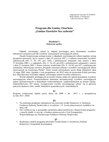 Załącznik do uchwały Nr IX/80/07 Rady Gminy w Ozorkowie z dnia 28 czerwca 2007 r. Program dla Gminy Ozorków „Gmina Ozorków bez azbestu” Rozdział 1. Założenia ogólne. Odpady zawierające azbest to odpady powstające przy demontażu wyrobów azbestowo-cementowych lub wyrobów izolacyjnych zawierających azbest. Zasady bezpiecznego postępowania z odpadami zawierającymi azbest reguluje szereg przepisów prawnych. Są to: ustawa z dnia 19 czerwca 1997 r. o zakazie stosowania wyrobów azbestowych (Dz. U. Nr 101, poz. 628) z późniejszymi zmianami oraz ustawa z dnia 27 kwietnia 2001 r. o odpadach. (Dz. U. Nr 62, poz.628 z późniejszymi zmianami) i ustawa z dnia 27 kwietnia 2001 r. Prawo ochrony środowiska (Dz. U. Nr 62, poz.627 z późniejszymi zmianami). Obowiązuje również „Program usuwania azbestu i wyrobów zawierających azbest stosowanych na terytorium Polski”, który został zatwierdzony przez Radę Ministrów dnia 14 maja 2002 roku. Zgodnie z tym programem, do 2032 roku na terytorium Polski powinny być zlikwidowane wszystkie odpady zawierające azbest (wyroby azbestowe). Wśród zakładów działających na terenie Gminy żaden nie zgłosił posiadania wyrobów zawierających azbest. Przeprowadzono natomiast inwentaryzację wyrobów zawierających azbest zamontowanych w budynkach wielorodzinnych i jednorodzinnych na terenie Gminy. Zidentyfikowano 367 miejsc występowanie wyrobu zawierającego azbest. Są to głównie pokrycia dachowe obór, stodół, budynków gospodarczych i mieszkalnych. §1. Program realizowany będzie przez okres od 2008 r. do na lata 2011 -2020. 2011 r. z perspektywą §2. 1. Na realizację programu zabezpiecza się corocznie środki finansowe w Gminnym Funduszu Ochrony Środowiska w wysokości 1/5 kwoty planowanych wydatków na dany rok. 2. Nie wyklucza się, w przypadku zaistnienia takiej możliwości, finansowania programu z innych źródeł, w tym np. z fundusz pomocowych z Unii Europejskiej, Wojewódzkiego czy Narodowego Funduszu Ochrony Środowiska. §3. 1. Realizację i nadzór programu prowadzi Urząd Gminy w Ozorkowie, Referat Rolnictwa i Gospodarki Komunalnej. §4. 1. Przedsiębiorca musi posiadać zezwolenie na prowadzenie działalności w zakresie zbierania i transportu tego rodzaju odpadów. 2. W ramach wykonywanej usługi zawierać się będą: odbiór odpadów od właściciela obiektu budowlanego, w tym załadunek i transport, magazynowanie, transport na składowisko oraz unieszkodliwienie odpadów. Rozdział II. Warunki ubiegania się o dofinansowanie przez Gminę Ozorków kosztów związanych z odbiorem i unieszkodliwieniem odpadów azbestowych. §5. Właściciel, zarządca lub użytkownik obiektu budowlanego, w którym zastosowano wyroby zawierające azbest, aby ubiegać się o dofinansowanie przez gminę Ozorków kosztów związanych z odbiorem i unieszkodliwianiem odpadów zawierających azbest jest zobowiązany do: 1). spełnienia przed przystąpieniem do prac związanych z usuwaniem wyrobów zawierających azbest wymagań wynikających z ustawy 07 lipca 1994 r. – Prawo budowlane (tekst jednolity: Dz. U. z 2003 r. Nr 207, poz. 2016, zm.: Dz. U. z 2003 r. nr 80, poz. 718). tj. uzyskać pozwolenie na rozbiórkę lub zgłosić rozpoczęcie robót budowlanych. 2). poniesienia kosztów demontażu wyrobów zawierających azbest. Demontaż może przeprowadzić wyłącznie przedsiębiorca posiadający decyzję Starosty Powiatowego w Zgierzu zawierającą program gospodarki tego rodzaju odpadami niebezpiecznymi. Właściciel obiektu jest zobowiązany do zawarcia z wykonawcą prac umowy cywilnoprawnej. Wybierając wykonawcę kieruje się własnym dobrem i interesem finansowym. 3). złożenia w terminie do 31 marca każdego roku go Urzędu Gminy w Ozorkowie stosownego wniosku. §6. Wniosek o dofinansowanie przez Gminę Ozorków kosztów związanych z odbiorem i unieszkodliwieniem odpadów zawierających azbest powinien zawierać: 1). oznaczenie składającego wniosek: w przypadku osób fizycznych imię, nazwisko, adres; w przypadku pozostałych wnioskodawców: nazwa, adres, NIP, REGON, dokument potwierdzający posiadanie uprawnień do reprezentowania wnioskodawcy; 2). dane dotyczące położenia obiektu, 3). pozwolenie lub zgłoszenie wymagane przepisami prawa budowlanego, 4). dokument potwierdzający prawo własności do nieruchomości (np. aktualny odpis z księgi wieczystej), 5). Umowę cywilnoprawną z wykonawcą prac oraz decyzję, o której mowa w §5 pkt 2, 6). określenie ilości wytworzonych odpadów zawierających azbest, 7). określenie przewidywanego terminu rozpoczęcia i zakończenia pracy, 8). podpis wnioskodawcy Kopie dokumentów powinny być potwierdzone za zgodność z oryginałem. Rozdział III Realizacja programu §7. Wnioski są rozpatrywane przez komisję powołaną przez Wójta Gminy w Ozorkowie. §8. Komisja pracuje w oparciu o zarządzenie Wójta Gminy wydane w przedmiotowej sprawie. §9. Pierwszeństwo w realizacji wniosków mają jednostki i zakłady budżetowe Gminy Ozorków, osoby fizyczne oraz właściciele, użytkownicy i administratorzy budynków użyteczności publicznej. §10. 1. Po zakwalifikowaniu wniosku do realizacji Wójt gminy w Ozorkowie wydaje zgodę na dofinansowanie w ramach niniejszego programu kosztów odbioru i unieszkodliwienia odpadów zawierających azbest. 2. Wnioskodawca zleca na piśmie przedsiębiorcy, o którym mowa w §4 odbiór odpadów. 3. Przedsiębiorca odbierający odpady wystawia dokument – kartę przekazania odpadu, zgodny z załącznikiem nr 3 rozporządzenia Ministra Środowiska z dnia 11 grudnia 2001 r. w sprawie wzorów dokumentów stosowanych na potrzeby ewidencji odpadów (Dz. U. nr 152, poz. 1736), następnie transportuje je do miejsca magazynowania (jeśli zachodzi taka potrzeba) lub unieszkodliwiania. Podczas magazynowania muszą być spełnione warunki wynikające z art. 63 ustawy z dnia 27 kwietnia 2001 r. o odpadach (Dz. U. Nr 62, poz. 628 z późniejsz