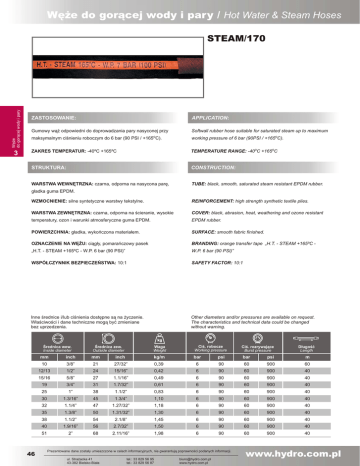 Węże do gorącej wody i pary / Hot Water & Steam Hoses Węże do gorącej wody i pary STEAM/170 3 APPLICATION: ZASTOSOWANIE: Gumowy wąż odpowiedni do doprowadzania pary nasyconej przy o Softwall rubber hose suitable for saturated steam up to maximum maksymalnym ciśnieniu roboczym do 6 bar (90 PSI / +165 C). working pressure of 6 bar (90PSI / +165oC). ZAKRES TEMPERATUR: -40ºC +165ºC TEMPERATURE RANGE: -40oC +165oC STRUKTURA: CONSTRUCTION: WARSTWA WEWNĘTRZNA: czarna, odporna na nasycona parę, TUBE: black, smooth, saturated steam resistant EPDM rubber. gładka guma EPDM. WZMOCNIENIE: silne syntetyczne warstwy tekstylne. REINFORCEMENT: high strength synthetic textile plies. WARSTWA ZEWNĘTRZNA: czarna, odporna na ścieranie, wysokie COVER: black, abrasion, heat, weathering and ozone resistant temperatury, ozon i warunki atmosferyczne guma EPDM. EPDM rubber. POWIERZCHNIA: gładka, wykończona materiałem. SURFACE: smooth fabric finished. OZNACZENIE NA WĘŻU: ciągły, pomarańczowy pasek BRANDING: orange transfer tape „H.T. - STEAM +165ºC - „H.T. - STEAM +165ºC - W.P. 6 bar (90 PSI)” W.P. 6 bar (90 PSI)” WSPÓŁCZYNNIK BEZPIECZEŃSTWA: 10:1 SAFETY FACTOR: 10:1 Inne średnice i/lub ciśnienia dostępne są na życzenie. Właściwości i dane techniczne mogą być zmieniane bez uprzedzenia. Other diameters and/or pressures are available on request. The characteristics and technical data could be changed without warning. Średnica wew. Inside diameter 46 Średnica zew. Outside diameter Waga Weight Ciś. robocze Working pressure Ciś. rozrywające Burst pressure Długość Length mm inch mm inch kg/m bar psi bar psi m 10 3/8” 21 27/32” 0,39 6 90 60 900 60 12/13 1/2” 24 15/16” 0,42 6 90 60 900 40 15/16 5/8” 27 1.1/16” 0,49 6 90 60 900 40 19 3/4” 31 1.7/32” 0,61 6 90 60 900 40 25 1” 38 1.1/2” 0,83 6 90 60 900 40 30 1.3/16” 45 1.3/4” 1,10 6 90 60 900 40 32 1.1/4” 47 1.27/32” 1,18 6 90 60 900 40 35 1.3/8” 50 1.31/32” 1,30 6 90 60 900 40 38 1.1/2” 54 2.1/8” 1,45 6 90 60 900 40 40 1.9/16” 56 2.7/32” 1,50 6 90 60 900 40 51 2” 68 2.11/16” 1,98 6 90 60 900 40 Prezentowane dane zostały umieszczone w celach informacyjnych, nie gwarantują poprawności podanych informacji. ul. Strażacka 41 43-382 Bielsko-Biała tel.: 33 829 56 95 tel.: 33 829 56 87 [email protected] www.hydro.com.pl www.hydro.com.pl