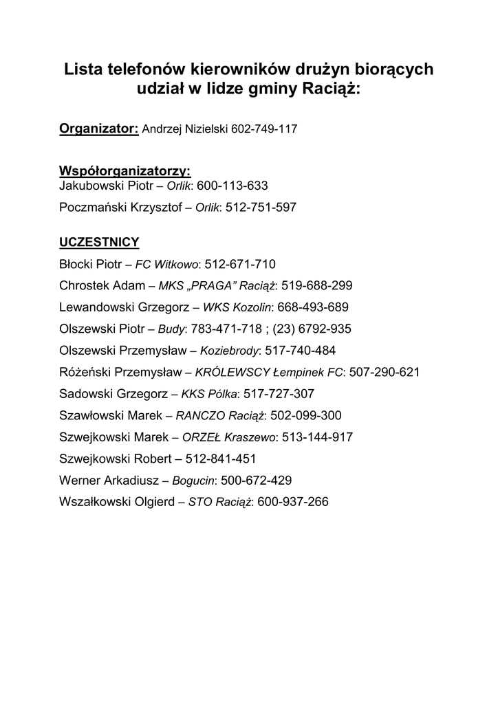 Lista telefonów kierowników druŜyn biorących udział w lidze gminy RaciąŜ: Organizator: Andrzej Nizielski 602-749-117 Współorganizatorzy: Jakubowski Piotr – Orlik: 600-113-633 Poczmański Krzysztof – Orlik: 512-751-597 UCZESTNICY Błocki Piotr – FC Witkowo: 512-671-710 Chrostek Adam – MKS „PRAGA” RaciąŜ: 519-688-299 Lewandowski Grzegorz – WKS Kozolin: 668-493-689 Olszewski Piotr – Budy: 783-471-718 ; (23) 6792-935 Olszewski Przemysław – Koziebrody: 517-740-484 RóŜeński Przemysław – KRÓLEWSCY Łempinek FC: 507-290-621 Sadowski Grzegorz – KKS Pólka: 517-727-307 Szawłowski Marek – RANCZO RaciąŜ: 502-099-300 Szwejkowski Marek – ORZEŁ Kraszewo: 513-144-917 Szwejkowski Robert – 512-841-451 Werner Arkadiusz – Bogucin: 500-672-429 Wszałkowski Olgierd – STO RaciąŜ: 600-937-266