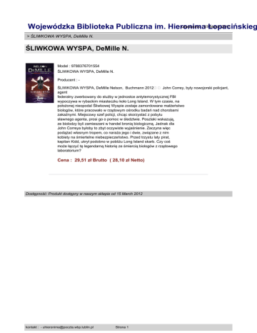Utworzono : 07Łopacińskieg March 2017 Wojewódzka Biblioteka Publiczna im. Hieronima > ŚLIWKOWA WYSPA, DeMille N. ŚLIWKOWA WYSPA, DeMille N. Model : 9788376701554 ŚLIWKOWA WYSPA, DeMille N. Producent : ŚLIWKOWA WYSPA, DeMille Nelson, Buchmann 2012�� John Correy, były nowojorski policjant, agent federalny zwerbowany do służby w jednostce antyterrorystycznej FBI wypoczywa w rybackim miasteczku koło Long Island. W tym czasie, na położonej nieopodal Śliwkowej Wyspie zostaje zamordowane małżeństwo biologów, które pracowało w rządowym ośrodku badań nad chorobami zakaźnymi. Miejscowy szef policji, chcąc skorzystać z pobytu sławnego agenta, prosi go o pomoc w śledztwie. Poszlaki wskazują, ze biolodzy byli zamieszani w handel bronią biologiczną. Jednak dla John Correya byłoby to zbyt oczywiste wyjaśnienie. Zaczyna więc podążać własnym tropem, co naraża jego i dwie, związane z nim kobiety na śmiertelne niebezpieczeństwo. Przed trzystu laty pirat, kapitan Kidd, ukrył podobno w pobliżu Long Island skarb. Czy coś może łączyć tę legendarną historię ze śmiercią biologów z rządowego laboratorium? Cena : 29,51 zł Brutto ( 28,10 zł Netto) Dostępność: Produkt dostępny w naszym sklepie od 15 March 2012 kontakt : - [email protected] Strona 1