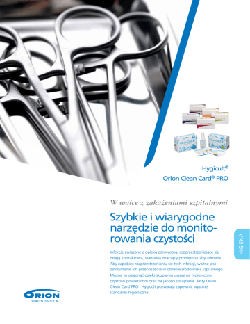 Hygicult® Orion Clean Card® PRO Szybkie i wiarygodne narzędzie do monitorowania czystości Infekcje związane z opieką zdrowotną, rozprzestrzeniające się drogą kontaktową, stanowią znaczący problem służby zdrowia. Aby zapobiec rozprzestrzenianiu się tych infekcji, ważne jest zatrzymanie ich przenoszenia w obrębie środowiska szpitalnego. Można to osiągnąć dzięki skupieniu uwagi na higienicznej czystości powierzchni oraz na jakości sprzątania. Testy Orion Clean Card PRO i Hygicult pozwalają zapewnić wysokie standardy higieniczne. HIGIENA W walce z zakażeniami szpitalnymi Regularne monitorowanie czystości z Orion Clean Card PRO i Hygicult pomaga zredukować rozprzestrzenianie się infekcji Szpitale stanowią środowisko, w którym pracownicy służby zdrowia, pacjenci oraz osoby odwiedzające są ze sobą w bliskim kontakcie, co sprzyja ryzyku przenoszenia zakażeń. Właściwa higiena dłoni oraz metody pracy są podstawą zapobiegania rozprzestrzenianiu się infekcji. Są również niezbędne w celu wyeliminowania transmisji infekcji z powierzchni, poprzez zwrócenie uwagi na ich higienę oraz jakość czyszczenia. Wizualna kontrola powierzchni nie jest już wystarczająca. Dla utrzymania standardów medycznych konieczna jest obiektywna ocena poziomu czystości. Bieżące monitorowanie czystości zapobiega rozprzestrzenianiu się infekcji i pomaga w określeniu najlepszych praktyk aseptycznych. Orion Clean Card PRO do szybkiego monitoringu czystości Orion Clean Card PRO jest łatwym w użyciu testem, zapewniającym szybką ocenę czystości powierzchni. Test mierzy zawartość białek pochodzących z mikroorganizmów, krwi oraz tkanek, których wykrycie wskazuje na niewystarczającą czystość. Testy Hygicult do zarządzania mikrobiologiczną czystością Kontaktowe testy Hygicult zapewniają łatwy i wiarygodny monitoring mikrobiologicznej czystości powierzchni. Produkty 879-01PL general, 11/2012 Testy do kontroli higieny powierzchni znajdują zastosowanie: • w szpitalach - do monitorowania procesów czyszczenia i dezynfekcji, w celu zachowania aseptyki • w sterylizatorniach - do weryfikacji skuteczności czyszczenia oraz kontroli czystości urządzeń, ISO 15883 • w gabinetach dentystycznych - do zapewnienia higieny narzędzi i otoczenia • w laboratoriach i aptekach szpitalnych - do weryfikacji czystości w komorach laminarnych, kontroli otoczenia oraz procesów produkcji środków farmaceutycznych zgodnych z wytycznymi GMP • przy produkcji żywności - do kontroli wewnętrznej • w pralniach - do zapewnienia czystości materiałów używanych w opiece zdrowotnej, EN 14065 Poza tym testy do kontroli czystości służą do poprawy zasad bezpieczeństwa i metod pracy, jak również stanowią pomoc w szkoleniach i edukacji pracowników. Nr kat. Orion Clean Card PRO do szybkiego wykrywania białek pochodzących z kontaminacji 133148/25 testów 133149/50 testów Hygicult TPC do ogólnego wykrywania drobnoustrojów, 10 testów 68010 Hygicult Y & F do wykrywania drożdży i pleśni, 10 testów 68013 Hygicult E do wykrywania Enterobacteriaceae, 10 testów 68012 Hygicult E/B-Gur do wykrywania Enterobacteriaceae oraz bakterii produkujących ß-glukuronidazę (95% szczepów E.coli), 10 testów 68267 Orion Diagnostica Oy, Finlandia Przedstawicielstwo dla CZ, HU, PL, SK, Bělohorská 57, 169 00 Praga 6, Republika Czeska tel: +48 664 382 811, faks: +420 233 350 532 [email protected], www.oriondiagnostica.pl, www.quikread.pl Hygicult TPC i E posiadają pozytywną opinię AOAC. Nasze testy są od razu gotowe do użycia i nie wymagają użycia żadnego specjalistycznego sprzętu.