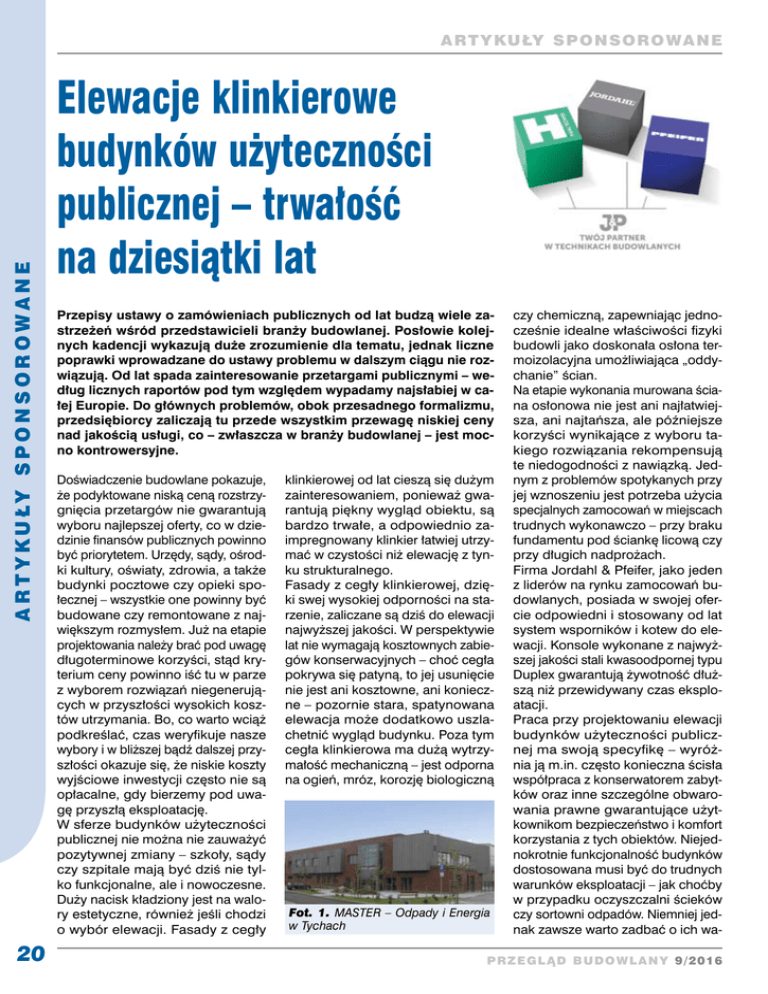 A R T Y K U ŁY S P ON S O R OWANE ARTYKUŁY SPON S OROWANE 20 Elewacje klinkierowe budynków użyteczności publicznej – trwałość na dziesiątki lat Przepisy ustawy o zamówieniach publicznych od lat budzą wiele zastrzeżeń wśród przedstawicieli branży budowlanej. Posłowie kolejnych kadencji wykazują duże zrozumienie dla tematu, jednak liczne poprawki wprowadzane do ustawy problemu w dalszym ciągu nie rozwiązują. Od lat spada zainteresowanie przetargami publicznymi – według licznych raportów pod tym względem wypadamy najsłabiej w całej Europie. Do głównych problemów, obok przesadnego formalizmu, przedsiębiorcy zaliczają tu przede wszystkim przewagę niskiej ceny nad jakością usługi, co – zwłaszcza w branży budowlanej – jest mocno kontrowersyjne. Doświadczenie budowlane pokazuje, że podyktowane niską ceną rozstrzygnięcia przetargów nie gwarantują wyboru najlepszej oferty, co w dziedzinie finansów publicznych powinno być priorytetem. Urzędy, sądy, ośrodki kultury, oświaty, zdrowia, a także budynki pocztowe czy opieki społecznej – wszystkie one powinny być budowane czy remontowane z największym rozmysłem. Już na etapie projektowania należy brać pod uwagę długoterminowe korzyści, stąd kryterium ceny powinno iść tu w parze z wyborem rozwiązań niegenerujących w przyszłości wysokich kosztów utrzymania. Bo, co warto wciąż podkreślać, czas weryfikuje nasze wybory i w bliższej bądź dalszej przyszłości okazuje się, że niskie koszty wyjściowe inwestycji często nie są opłacalne, gdy bierzemy pod uwagę przyszłą eksploatację. W sferze budynków użyteczności publicznej nie można nie zauważyć pozytywnej zmiany – szkoły, sądy czy szpitale mają być dziś nie tylko funkcjonalne, ale i nowoczesne. Duży nacisk kładziony jest na walory estetyczne, również jeśli chodzi o wybór elewacji. Fasady z cegły klinkierowej od lat cieszą się dużym zainteresowaniem, ponieważ gwarantują piękny wygląd obiektu, są bardzo trwałe, a odpowiednio zaimpregnowany klinkier łatwiej utrzymać w czystości niż elewację z tynku strukturalnego. Fasady z cegły klinkierowej, dzięki swej wysokiej odporności na starzenie, zaliczane są dziś do elewacji najwyższej jakości. W perspektywie lat nie wymagają kosztownych zabiegów konserwacyjnych – choć cegła pokrywa się patyną, to jej usunięcie nie jest ani kosztowne, ani konieczne – pozornie stara, spatynowana elewacja może dodatkowo uszlachetnić wygląd budynku. Poza tym cegła klinkierowa ma dużą wytrzymałość mechaniczną – jest odporna na ogień, mróz, korozję biologiczną Fot. 1. MASTER – Odpady i Energia w Tychach czy chemiczną, zapewniając jednocześnie idealne właściwości fizyki budowli jako doskonała osłona termoizolacyjna umożliwiająca „oddychanie” ścian. Na etapie wykonania murowana ściana osłonowa nie jest ani najłatwiejsza, ani najtańsza, ale późniejsze korzyści wynikające z wyboru takiego rozwiązania rekompensują te niedogodności z nawiązką. Jednym z problemów spotykanych przy jej wznoszeniu jest potrzeba użycia specjalnych zamocowań w miejscach trudnych wykonawczo – przy braku fundamentu pod ściankę licową czy przy długich nadprożach. Firma Jordahl & Pfeifer, jako jeden z liderów na rynku zamocowań budowlanych, posiada w swojej ofercie odpowiedni i stosowany od lat system wsporników i kotew do elewacji. Konsole wykonane z najwyższej jakości stali kwasoodpornej typu Duplex gwarantują żywotność dłuższą niż przewidywany czas eksploatacji. Praca przy projektowaniu elewacji budynków użyteczności publicznej ma swoją specyfikę – wyróżnia ją m.in. często konieczna ścisła współpraca z konserwatorem zabytków oraz inne szczególne obwarowania prawne gwarantujące użytkownikom bezpieczeństwo i komfort korzystania z tych obiektów. Niejednokrotnie funkcjonalność budynków dostosowana musi być do trudnych warunków eksploatacji – jak choćby w przypadku oczyszczalni ścieków czy sortowni odpadów. Niemniej jednak zawsze warto zadbać o ich wa- PRz eg l Ąd bu d owl any 9/2016 A R T Y KU ŁY S P ONSOROWANE Firma Jordahl & Pfeifer od lat wspiera projektantów i wykonawców, oferując najnowocześniejsze i kompleksowe rozwiązania w zakresie technik budowlanych. Nie inaczej jest w zakresie elewacji. Przy wielu projektach pracownicy firmy odpowiedzialni byli nie tylko za projektowanie elementów, ale także za koordynację produkcji prefabrykatów oraz ich dostawę na budowę, jak w przypadku prac w kampusie Wydziału Nauk Historycznych i Społecznych UKSW, gdzie przy ul. Wóycickiego wykonano elegancką elewację z czerwonego klinkieru. Firma Jordahl & Pfeifer na budowę tej inwestycji dostarczyła kompletny system mocowania JVA dla łącznej powierzchni około 5 tys. m2 elewacji wraz z akcesoriami do prefabrykacji nadproży oraz Fot. 2. Wydział Nauk Historycznych i Społecznych UKSW w Warszawie systemem ich mocowania (zadanie wymagające, ponieważ przy tym obiekcie wykorzystano ponad 1 km prefabrykowanych nadproży). W przypadku rozbudowy czy przebudowy budynków użyteczności publicznej często stajemy w obliczu trudnego zadania – nadania w miarę spójnej formy dwóm niezależnym i niejednokrotnie zupełnie odmiennym pod względem technologii wykonania obiektom. Doskonały przykład połączenia zabytkowego budynku z jego nowym skrzydłem stanowi rozbudowane w latach 2010–2013 r. Centrum Leczenia Oparzeń w Siemianowicach Śląskich. Nowoczesna izba przyjęć, oddział intensywnej opieki medycznej oraz lądowisko na dachu budynku przy jednoczesnym zachowaniu zabytkowej formy dawnego szpitala stanowiło nie lada wyzwanie architektoniczne. Elewacja z cegły klinkierowej, przy której wykorzystano system firmy Jordahl & Pfeifer, okazała się tu strzałem w dziesiątkę – nowy obiekt to nie tylko lepsza opieka dla pacjentów, ale także spójny architektonicznie nowoc