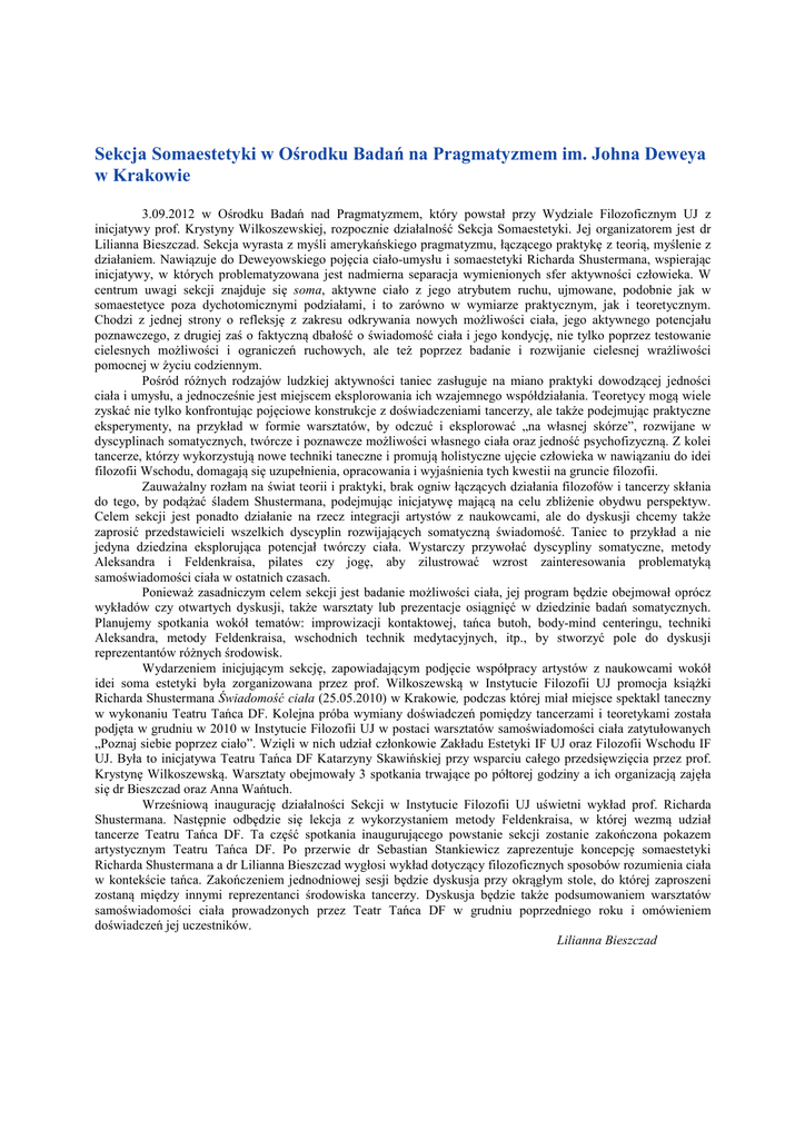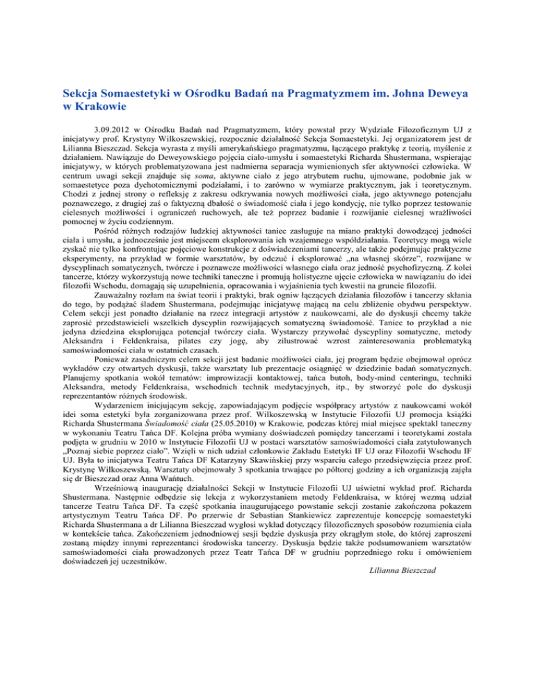 Sekcja Somaestetyki w Ośrodku Badań na Pragmatyzmem im. Johna Deweya w Krakowie 3.09.2012 w Ośrodku Badań nad Pragmatyzmem, który powstał przy Wydziale Filozoficznym UJ z inicjatywy prof. Krystyny Wilkoszewskiej, rozpocznie działalność Sekcja Somaestetyki. Jej organizatorem jest dr Lilianna Bieszczad. Sekcja wyrasta z myśli amerykańskiego pragmatyzmu, łączącego praktykę z teorią, myślenie z działaniem. Nawiązuje do Deweyowskiego pojęcia ciało-umysłu i somaestetyki Richarda Shustermana, wspierając inicjatywy, w których problematyzowana jest nadmierna separacja wymienionych sfer aktywności człowieka. W centrum uwagi sekcji znajduje się soma, aktywne ciało z jego atrybutem ruchu, ujmowane, podobnie jak w somaestetyce poza dychotomicznymi podziałami, i to zarówno w wymiarze praktycznym, jak i teoretycznym. Chodzi z jednej strony o refleksję z zakresu odkrywania nowych możliwości ciała, jego aktywnego potencjału poznawczego, z drugiej zaś o faktyczną dbałość o świadomość ciała i jego kondycję, nie tylko poprzez testowanie cielesnych możliwości i ograniczeń ruchowych, ale też poprzez badanie i rozwijanie cielesnej wrażliwości pomocnej w życiu codziennym. Pośród różnych rodzajów ludzkiej aktywności taniec zasługuje na miano praktyki dowodzącej jedności ciała i umysłu, a jednocześnie jest miejscem eksplorowania ich wzajemnego współdziałania. Teoretycy mogą wiele zyskać nie tylko konfrontując pojęciowe konstrukcje z doświadczeniami tancerzy, ale także podejmując praktyczne eksperymenty, na przykład w formie warsztatów, by odczuć i eksplorować „na własnej skórze”, rozwijane w dyscyplinach somatycznych, twórcze i poznawcze możliwości własnego ciała oraz jedność psychofizyczną. Z kolei tancerze, którzy wykorzystują nowe techniki taneczne i promują holistyczne ujęcie człowieka w nawiązaniu do idei filozofii Wschodu, domagają się uzupełnienia, opracowania i wyjaśnienia tych kwestii na gruncie filozofii. Zauważalny rozłam na świat teorii i praktyki, brak ogniw łączących działania filozofów i tancerzy skłania do tego, by podążać śladem Shustermana, podejmując inicjatywę mającą na celu zbliżenie obydwu perspektyw. Celem sekcji jest ponadto działanie na rzecz integracji artystów z naukowcami, ale do dyskusji chcemy także zaprosić przedstawicieli wszelkich dyscyplin rozwijających somatyczną świadomość. Taniec to przykład a nie jedyna dziedzina eksplorująca potencjał twórczy ciała. Wystarczy przywołać dyscypliny somatyczne, metody Aleksandra i Feldenkraisa, pilates czy jogę, aby zilustrować wzrost zainteresowania problematyką samoświadomości ciała w ostatnich czasach. Ponieważ zasadniczym celem sekcji jest badanie możliwości ciała, jej program będzie obejmował oprócz wykładów czy otwartych dyskusji, także warsztaty lub prezentacje osiągnięć w dziedzinie badań somatycznych. Planujemy spotkania wokół tematów: improwizacji kontaktowej, tańca butoh, body-mind centeringu, techniki Aleksandra, metody Feldenkraisa, wschodnich technik medytacyjnych, itp., by stworzyć pole do dyskusji reprezentantów różnych środowisk. Wydarzeniem inicjującym sekcję, zapowiadającym podjęcie współpracy artystów z naukowcami wokół idei soma estetyki była zorganizowana przez prof. Wilkoszewską w Instytucie Filozofii UJ promocja książki Richarda Shustermana Świadomość ciała (25.05.2010) w Krakowie, podczas której miał miejsce spektakl taneczny w wykonaniu Teatru Tańca DF. Kolejna próba wymiany doświadczeń pomiędzy tancerzami i teoretykami została podjęta w grudniu w 2010 w Instytucie Filozofii UJ w postaci warsztatów samoświadomości ciała zatytułowanych „Poznaj siebie poprzez ciało”. Wzięli w nich udział członkowie Zakładu Estetyki IF UJ oraz Filozofii Wschodu IF UJ. Była to inicjatywa Teatru Tańca DF Katarzyny Skawińskiej przy wsparciu całego przedsięwzięcia przez prof. Krystynę Wilkoszewską. Warsztaty obejmowały 3 spotkania trwające po półtorej godziny a ich organizacją zajęła się dr Bieszczad oraz Anna Wańtuch. Wrześniową inaugurację działalności Sekcji w Instytucie Filozofii UJ uświetni wykład prof. Richarda Shustermana. Następnie odbędzie się lekcja z wykorzystaniem metody Feldenkraisa, w której wezmą udział tancerze Teatru Tańca DF. Ta część spotkania inaugurującego powstanie sekcji zostanie zakończona pokazem artystycznym Teatru Tańca DF. Po przerwie dr Sebastian Stankiewicz zaprezentuje koncepcję somaestetyki Richarda Shustermana a dr Lilianna Bieszczad wygłosi wykład dotyczący filozoficznych sposobów rozumienia ciała w kontekście tańca. Zakończeniem jednodniowej sesji będzie dyskusja przy okrągłym stole, do której zaproszeni zostaną między innymi reprezentanci środowiska tancerzy. Dyskusja będzie także podsumowaniem warsztatów samoświadomości ciała prowadzonych przez Teatr Tańca DF w grudniu poprzedniego roku i omówieniem doświadczeń jej uczestników. Lilianna Bieszczad