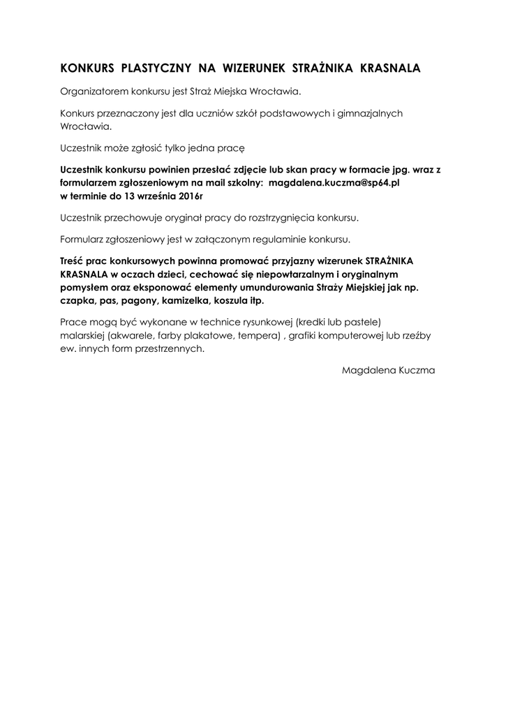 KONKURS PLASTYCZNY NA WIZERUNEK STRAŻNIKA KRASNALA Organizatorem konkursu jest Straż Miejska Wrocławia. Konkurs przeznaczony jest dla uczniów szkół podstawowych i gimnazjalnych Wrocławia. Uczestnik może zgłosić tylko jedna pracę Uczestnik konkursu powinien przesłać zdjęcie lub skan pracy w formacie jpg. wraz z formularzem zgłoszeniowym na mail szkolny: [email protected] w terminie do 13 września 2016r Uczestnik przechowuje oryginał pracy do rozstrzygnięcia konkursu. Formularz zgłoszeniowy jest w załączonym regulaminie konkursu. Treść prac konkursowych powinna promować przyjazny wizerunek STRAŻNIKA KRASNALA w oczach dzieci, cechować się niepowtarzalnym i oryginalnym pomysłem oraz eksponować elementy umundurowania Straży Miejskiej jak np. czapka, pas, pagony, kamizelka, koszula itp. Prace mogą być wykonane w technice rysunkowej (kredki lub pastele) malarskiej (akwarele, farby plakatowe, tempera) , grafiki komputerowej lub rzeźby ew. innych form przestrzennych. Magdalena Kuczma