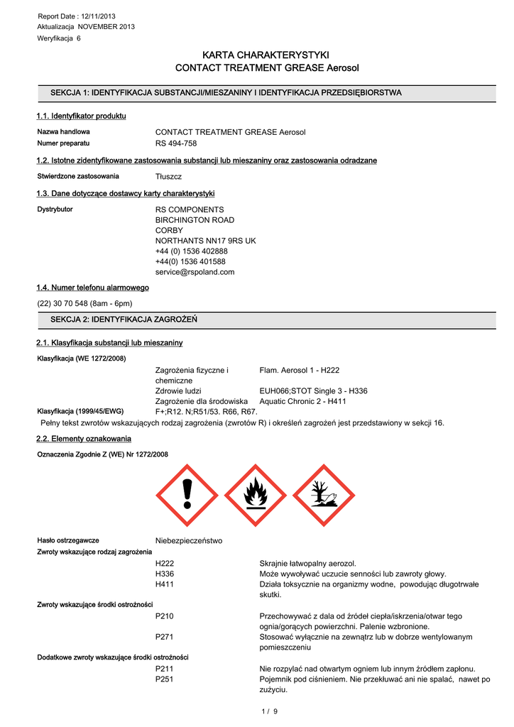 Report Date : 12/11/2013 Aktualizacja NOVEMBER 2013 Weryfikacja 6 KARTA CHARAKTERYSTYKI CONTACT TREATMENT GREASE Aerosol SEKCJA 1: IDENTYFIKACJA SUBSTANCJI/MIESZANINY I IDENTYFIKACJA PRZEDSIĘBIORSTWA 1.1. Identyfikator produktu Nazwa handlowa Numer preparatu CONTACT TREATMENT GREASE Aerosol RS 494-758 1.2. Istotne zidentyfikowane zastosowania substancji lub mieszaniny oraz zastosowania odradzane Stwierdzone zastosowania Tłuszcz 1.3. Dane dotyczące dostawcy karty charakterystyki Dystrybutor RS COMPONENTS BIRCHINGTON ROAD CORBY NORTHANTS NN17 9RS UK +44 (0) 1536 402888 +44(0) 1536 401588 [email protected] 1.4. Numer telefonu alarmowego (22) 30 70 548 (8am - 6pm) SEKCJA 2: IDENTYFIKACJA ZAGROŻEŃ 2.1. Klasyfikacja substancji lub mieszaniny Klasyfikacja (WE 1272/2008) Zagrożenia fizyczne i Flam. Aerosol 1 - H222 chemiczne Zdrowie ludzi EUH066;STOT Single 3 - H336 Zagrożenie dla środowiska Aquatic Chronic 2 - H411 Klasyfikacja (1999/45/EWG) F+;R12. N;R51/53. R66, R67. Pełny tekst zwrotów wskazujących rodzaj zagrożenia (zwrotów R) i określeń zagrożeń jest przedstawiony w sekcji 16. 2.2. Elementy oznakowania Oznaczenia Zgodnie Z (WE) Nr 1272/2008 Hasło ostrzegawcze Niebezpieczeństwo Zwroty wskazujące rodzaj zagrożenia H222 H336 H411 Skrajnie łatwopalny aerozol. Może wywoływać uczucie senności lub zawroty głowy. Działa toksycznie na organizmy wodne, powodując długotrwałe skutki. P210 Przechowywać z dala od źródeł ciepła/iskrzenia/otwar tego ognia/gorących powierzchni. Palenie wzbronione. Stosować wyłącznie na zewnątrz lub w dobrze wentylowanym pomieszczeniu Zwroty wskazujące środki ostrożności P271 Dodatkowe zwroty wskazujące środki ostrożności P211 P251 Nie rozpylać nad otwartym ogniem lub innym źródłem zapłonu. Pojemnik pod ciśnieniem. Nie przekłuwać ani nie spalać, nawet po zużyciu. 1/ 9 Report Date : 12/11/2013 CONTACT TREATMENT GREASE Aerosol P261 P410+412 Unikać wdychania par/rozpylonej cieczy. Chronić przed światłem słonecznym. Nie wystawiać na działanie temperatury przekraczającej 50 °C/122 °F. EUH066 Powtarzające się narażenie może powodować wysuszanie lub pękanie skóry. Informacje uzupełniające na etykiecie 2.3. Inne zagrożenia Nieklasyfikowany jako PBT / vPvB na podstawie obecnych kryteriów UE. SEKCJA 3: SKŁAD/INFORMACJA O SKŁADNIKACH 3.2. Mieszaniny PENTAN Numer CAS: 109-66-0 60-80% Numer WE: 203-692-4 Numer Rejestracyjny: 01-2119459286-30 Klasyfikacja (WE 1272/2008) Flam. Liq. 2 - H225 EUH066 STOT Single 3 - H336 Asp. Tox. 1 - H304 Aquatic Chronic 2 - H411 Klasyfikacja (67/548/EWG) F+;R12 Xn;R65 R66 R67 N;R51/53 PROPAN-2-OL Numer CAS: 67-63-0 1-5% Numer WE: 200-661-7 Klasyfikacja (WE 1272/2008) Flam. Liq. 2 - H225 Eye Irrit. 2 - H319 STOT Single 3 - H336 Klasyfikacja (67/548/EWG) F;R11 Xi;R36 R67 Pełny tekst zwrotów wskazujących rodzaj zagrożenia (zwrotów R) i określeń zagrożeń jest przedstawiony w sekcji 16. Uwagi względem składu Składniki nie wymienione są zakwalifikowe jako sybstancje nieszkodliwe lub w stężeniu poniżej dopuszczalnego poziomu. SEKCJA 4: ŚRODKI PIERWSZEJ POMOCY 4.1. Opis środków pierwszej pomocy Wdychanie Niezwłocznie wynieść/wyprowadzić osobę narażoną na wdychanie na świeże powietrze. Zapewnić poszkodowanej osobie ciepło i odpoczynek. Zapewnić niezwłoczną opiekę lekarską. Zapewnić opiekę lekarską. Spożycie Niezwłocznie wypłukać usta i zapewnić dopływ świeżego powietrza. Kontakt ze skórą Natychmiast umyć skórę wodą z mydłem. W przypadku utrzymującego się dyskomfortu skontaktować się z lekarzem. Kontakt z oczami Przed płukaniem upewnić się, że ewentualne soczewki kontaktowe zostały wyjęte z oczu. Niezwłocznie przemyć oczy dużą ilością wody, podnosząc powieki. Kontynuować płukanie przez co najmniej 15 minut. W przypadku utrzymującego się dyskomfortu skontaktować się z lekarzem. 4.2. Najważniejsze ostre i opóźnione objawy oraz skutki narażenia 4.3. Wskazania dotyczące wszelkiej natychmiastowej pomocy lekarskiej i szczególnego postępowania z poszkodowanym Leczyć objawowo. SEKCJA 5: POSTĘPOWANIE W PRZYPADKU POŻARU 2/ 9 Report Date : 12/11/2013 CONTACT TREATMENT GREASE Aerosol 5.1. Środki gaśnicze Środki gaśnicze Stosować: Proszek. Suche środki chemiczne, piasek, dolomit itp. Rozpryski wody, mgły albo aerozole. 5.2. Szczególne zagrożenia związane z substancją lub mieszaniną Niebezpieczne produkty spalania Wskutek rozkładu termicznego lub spalania mogą uwalniać się tlenki węgla i inne toksyczne gazy oraz pary. Nadzwyczajne zagrożenia pożarowe i wybuchowe Puszki aerozolu mogą wybuchnąć w płomieniach. Zagrożenia specyficzne Preparat jest łatwo palny i przy podgrzewaniu może wydzielać pary, które mogą tworzyć wybuchowe mieszaniny z powietrzem. Wskutek silnego nagrzania powstaje nadciśnienie grożące wybuchowym rozsadzeniem pojemnika aerozolu. 5.3. Informacje dla straży pożarnej Szczególne Procedury Gasnicze Wynieść kontener z miejsca pożaru, jeśli nie łączy się to z ryzykiem. Środki ochrony personelu straży pożarnej W warunkach pożarowych stosować urządzenia oddechowe z własnym obiegiem powietrza i odzież ochronną na całe ciało. SEKCJA 6: POSTĘPOWANIE W PRZYPADKU NIEZAMIERZONEGO UWOLNIENIA DO ŚRODOWISKA 6.1. Indywidualne środki ostrożności, wyposażenie ochronne i procedury w sytuacjach awaryjnych Stosować odzież ochronną zgodnie z sekcją 8 niniejszej karty charakterystyki preparatu niebezpiecznego. 6.2. Środki ostrożności w zakresie ochrony środowiska Nie odprowadzać do kanalizacji, gruntu i cieków wodnych. 6.3. Metody i materiały zapobiegające rozprzestrzenianiu się skażenia i służące do usuwania skażenia Zebrać wermikulitem, suchym piaskiem albo ziemią i przesypać do pojemników. Dobrze wietrzyć. 6.4. Odniesienia do innych sekcji Stosować odzież ochronną zgodnie z sekcją 8 niniejszej karty charakterystyki preparatu niebezpie
