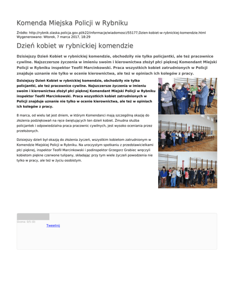 Komenda Miejska Policji w Rybniku Źródło: http://rybnik.slaska.policja.gov.pl/k22/informacje/wiadomosci/55177,Dzien-kobiet-w-rybnickiej-komendzie.html Wygenerowano: Wtorek, 7 marca 2017, 18:29 Dzień kobiet w rybnickiej komendzie Dzisiejszy Dzień Kobiet w rybnickiej komendzie, obchodziły nie tylko policjantki, ale też pracownice cywilne. Najszczersze życzenia w imieniu swoim i kierownictwa złożył płci pięknej Komendant Miejski Policji w Rybniku inspektor Teofil Marcinkowski. Praca wszystkich kobiet zatrudnionych w Policji znajduje uznanie nie tylko w ocenie kierownictwa, ale też w opiniach ich kolegów z pracy. Dzisiejszy Dzień Kobiet w rybnickiej komendzie, obchodziły nie tylko policjantki, ale też pracownice cywilne. Najszczersze życzenia w imieniu swoim i kierownictwa złożył płci pięknej Komendant Miejski Policji w Rybniku inspektor Teofil Marcinkowski. Praca wszystkich kobiet zatrudnionych w Policji znajduje uznanie nie tylko w ocenie kierownictwa, ale też w opiniach ich kolegów z pracy. 8 marca, od wielu lat jest dniem, w którym Komendanci mają szczególną okazję do złożenia podziękowań na ręce świętujących ten dzień kobiet. Żmudna służba policjantek i odpowiedzialna praca pracownic cywilnych, jest wysoko oceniania przez przełożonych. Dzisiejszy dzień był okazją do złożenia życzeń, wszystkim kobietom zatrudnionym w Komendzie Miejskiej Policji w Rybniku. Na uroczystym spotkaniu z przedstawicielkami płci pięknej, inspektor Teofil Marcinkowski i podinspektor Grzegorz Grabiec wręczyli kobietom piękne czerwone tulipany, składając przy tym wiele życzeń powodzenia nie tylko w pracy, ale też w życiu osobistym. Ocena: 0/5 (0) Tweetnij