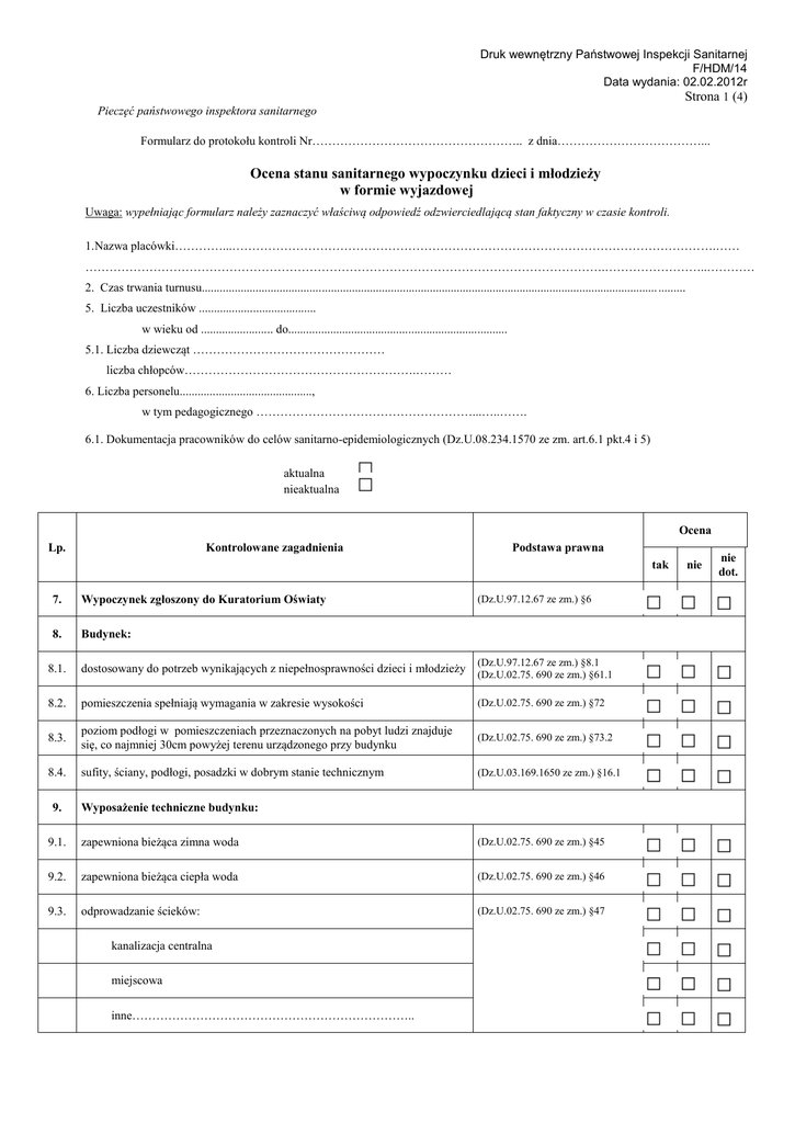Druk wewnętrzny Państwowej Inspekcji Sanitarnej F/HDM/14 Data wydania: 02.02.2012r Strona 1 (4) Pieczęć państwowego inspektora sanitarnego Formularz do protokołu kontroli Nr…………………………………………….. z dnia………………………………... Ocena stanu sanitarnego wypoczynku dzieci i młodzieży w formie wyjazdowej Uwaga: wypełniając formularz należy zaznaczyć właściwą odpowiedź odzwierciedlającą stan faktyczny w czasie kontroli. 1. Nazwa placówki…………...………………………………………………………………………………………………………….…… ………………………………………………………………………………………………………………….……………………..………… 2. Czas trwania turnusu........................................................................................................................................................ ......... 5. Liczba uczestników ....................................... w wieku od ........................ do......................................................................... 5.1. Liczba dziewcząt ………………………………………… liczba chłopców………………………………………………….……… 6. Liczba personelu............................................, w tym pedagogicznego ………………………………………………...…..……. 6.1. Dokumentacja pracowników do celów sanitarno-epidemiologicznych (Dz.U.08.234.1570 ze zm. art.6.1 pkt.4 i 5) aktualna nieaktualna Ocena Lp. Kontrolowane zagadnienia Podstawa prawna tak 7. Wypoczynek zgłoszony do Kuratorium Oświaty 8. Budynek: (Dz.U.97.12.67 ze zm.) §6 (Dz.U.97.12.67 ze zm.) §8.1 8.1. dostosowany do potrzeb wynikających z niepełnosprawności dzieci i młodzieży (Dz.U.02.75. 690 ze zm.) §61.1 8.2. pomieszczenia spełniają wymagania w zakresie wysokości (Dz.U.02.75. 690 ze zm.) §72 8.3. poziom podłogi w pomieszczeniach przeznaczonych na pobyt ludzi znajduje się, co najmniej 30cm powyżej terenu urządzonego przy budynku (Dz.U.02.75. 690 ze zm.) §73.2 8.4. sufity, ściany, podłogi, posadzki w dobrym stanie technicznym (Dz.U.03.169.1650 ze zm.) §16.1 9. Wyposażenie techniczne budynku: 9.1. zapewniona bieżąca zimna woda (Dz.U.02.75. 690 ze zm.) §45 9.2. zapewniona bieżąca ciepła woda (Dz.U.02.75. 690 ze zm.) §46 9.3. odprowadzanie ścieków: (Dz.U.02.75. 690 ze zm.) §47 kanalizacja centralna miejscowa inne…………………………………………………………….. nie nie dot. Druk wewnętrzny Państwowej Inspekcji Sanitarnej F/HDM/14 Data wydania: 02.02.2012r Strona 2 (4) 10. Mikroklimat pomieszczeń: 10.1. we wszystkich pomieszczeniach zapewniona wentylacja grawitacyjna lub mechaniczna (Dz.U.02.75. 690 ze zm.) §51; §147.2; §150.3 10.2. wentylacja mechaniczna w ustępach ogólnodostępnych z ilością kabin większą niż jedna lub nie posiadających okien (Dz.U.02.75. 690 ze zm.) §85.2; §150.3 10.3. co najmniej 50% powierzchni okien ma konstrukcję umożliwiającą otwieranie (Dz.U.02.75. 690 ze zm.) §155.1 10.4. temperatura pomieszczeń co najmniej 200 C (Dz.U.02.75. 690 ze zm.) §134.2 10.5. punkty świetlne czynne (Dz.U.02.75. 690 ze zm.) §59.1 10.6. punkty świetlne zaopatrzone w osłony (Dz.U.02.75. 690 ze zm.) §59.1 11. Pomieszczenia mieszkalne 11.1. liczba pokoi / ilu osobowe ...................................................................... ………………………………………………………………………………… 11.2. pościel / koce / materace czyste, niezniszczone (Dz.U.08.234.1570 ze zm.) art.22.1 11.3. zachowany odstęp miedzy łóżkami nie mniej niż 30 cm (Dz.U.06.22.169) zał. 7 11.4. zachowany wskaźnik powierzchni na jednego uczestnika (Dz.U.06.22.169) 11.5. Pokoje wyposażone w ……………………………………………………… …………………………………………………………………………………. (Dz.U.97.12.67 ze zm.) zał.1 12 Sale zajęć wyposażone w: ………………………………………………… …………………………………………………………………………………. 13. Pomieszczenia sanitarne: 13.1. pomieszczenia zlokalizowane w obiekcie (Dz.U.02.75. 690 ze zm.) §82 13.2. standardy dostępności do urządzeń sanitarnych zachowane (Dz.U.02.75. 690 ze zm.) §82 13.3. pomieszczenia sanitarne wyposażone w środki higieny osobistej 13.4. ściany zmywalne i odporne na działanie wilgoci (Dz.U.02.75. 690 ze zm.) §78.1 13.5. posadzki zmywalne, nienasiąkliwe i nieśliskie (Dz.U.02.75. 690 ze zm.) §78.2 14. 14.1. 15. Pomieszczenia porządkowe: (jeśli brak to wskazać miejsce przechowywania sprzętu porządkowego…………………………………………………………….). przechowywanie środków czystościowych, dezynfekujących oraz sprzętu porządkowego prawidłowe Opieka medyczna: 15.1. Zapewniona w miejscu 15.2. Inna forma opieki medycznej ……………………………………. 16. Pokoje chorych: Druk wewnętrzny Państwowej Inspekcji Sanitarnej F/HDM/14 Data wydania: 02.02.2012r Strona 3 (4) 16.1. 17. 17.1. 18. pokoje chorych wyposażone w: ………………………..…………………. …………………………………………………………………………………… …………………..………………………………………………………….. System I-ej pomocy: w placówce znajdują się odpowiednio wyposażone apteczki oraz instrukcje udzielania pierwszej pomocy. Stan zdrowia uczestników: 18.1. liczba i rodzaj zachorowań : ………………………………………..……… …………………………………………………………………………………. 18.2. liczba hospitalizacji (data i przyczyna): …………..………………………. ………………………