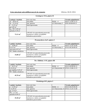 Gliwice, 04-01-2016 Lista mieszkań zakwalifikowanych do remontu Grottgera 31/6, piętro II 2 pokoje+ kuchnia 1p – 28,02 m2 2p – 13,14 m2 k – 15,23 m2 pp-2,85 m2 łaz., WC-9,58 m2 spiżarka-4,30 m2 2 73,12 m inst.wod.-kan. inst.elektr. inst. gazowa brak ogrzewania ROM – 4 ul. Dziewanny 2 Termin oglądalności 04.01-15.00-15.15 0701-09.00-09.15 UWAGI: do sprawdzenia przewody kominowe; należy uwzględnić dobudowę przewodów Przemysłowa 4a/3, piętro I 1 pokój+ kuchnia p – 18,00 m2 k-9,15 m2 inne pom-6,93 m2 WC- klatka schodowa 34,08 m2 inst.wod.-kan. inst.elektr. inst. gazowa brak ogrzewania ROM – 4 ul. Dziewanny 2 Termin oglądalności 04.01-15.45-16.00 07.01-09.30-09.45 UWAGI: do sprawdzenia przewody kominowe; należy uwzględnić dobudowę przewodów Św. Elżbiety 1/15, piętro III 1 pokój+ kuchnia p – 26,15 m2 k-14,10 m2 pp wspólny-5,45 m2 WC- klatka schodowa 45,70 m2 inst.wod.-kan. inst.elektr. inst. gazowa brak ogrzewania Termin oglądalności ROM – 6 05.01-09.00-09.15 ul. Chorzowska 14 07.01-13.00-13.15 UWAGI: do sprawdzenia przewody kominowe; należy uwzględnić dobudowę przewodów Wolskiego 8/5, piętro I 1 pokój+ kuchnia p – 12,58 m2 k-12,39 m2 pp -2,76 m2 WC- 1,17 m2 spiżarka-0,48 m2 29,38 m2 inst.wod.-kan. inst.elektr. inst. gazowa brak ogrzewania UWAGI: do sprawdzenia przewody kominowe; należy uwzględnić dobudowę przewodów Termin oglądalności ROM – 6 05.01-09.25-09.40 ul. Chorzowska 14 07.01-13.25-13.40 Królowej Jadwigi 3/9, piętro III-poddasze BUDYNEK PRZY UL. KRÓLOWEJ JADWIGI 3 W SAMOISTNYM POSIADANIU MIASTA GLIWICE* 3 pokoje+ kuchnia 1p – 26,40 m2 2p-19,40 m2 3p- 12,54 m2+ 2,58 m2 powierzchni poniżej wysokości 1,90 m k -17,50 m2 pp-1,90 m2 WC-klatka schodowa inst.wod.-kan. inst.elektr. brak gazu brak ogrzewania ROM – 2 Oddział 1 ul. Zabrska 15 Termin oglądalności 05.01-12.30-12.45 11.01-11.00-11.15 UWAGI: do sprawdzenia przewody kominowe; należy uwzględnić dobudowę przewodów *Miasto Gliwice włada przedmiotową nieruchomością jak właściciel, lecz nim nie jest; aktualnie brak możliwości wykupu na własność w/w lokalu 79,15 m2 Pszczyńska 49/7, piętro I 1 pokój+ kuchnia p – 14,57 m2 k – 10,75 m2 łaz., WC – 6,87 m2 (nielegalna) komórka– 3,96 m2 36,15 m2 inst.wod.-kan. inst.elektr. inst. gazowa (brak w lokalu) brak ogrzewania ROM – 2 Oddział 1 ul. Zabrska 15 Termin oglądalności 05.01-12.00-12.15 11.01-10.30-10.45 UWAGI: do sprawdzenia przewody kominowe; należy uwzględnić dobudowę przewodów Góry Chełmskiej 2a/11, piętro II BUDYNEK PRZY UL. GÓRY CHEŁMSKIEJ 2A W SAMOISTNYM POSIADANIU MIASTA GLIWICE* 1 pokój+ kuchnia p – 23,63 m2 k – 12,66 m2 pp-2,00 m2 WC- klatka schodowa inst.wod.-kan. inst.elektr. brak gazu brak ogrzewania ROM-1 Oddział 2 ul. Andersa 13 Termin oglądalności 05.01-09.00-09.15 07.01-14.00-14.15 UWAGI: brak przewodów dymowych oraz wentylacji grawitacyjnej-należy uwzględnić dobudowę * Miasto Gliwice włada przedmiotową nieruchomością jak właściciel, lecz nim nie jest; aktualnie brak możliwości wykupu na własność w/w lokalu 38,29 m2 JEDNOKROTNA REZYGNACJA Z OBJĘCIA W NAJEM WSKAZANEGO DO REMONTU LOKALU MIESZKALNEGO SPOWODUJE SKREŚLENIE Z LISTY OSÓB OCZEKUJĄCYCH NA MIESZKANIE DO REMONTU. Prosimy o składanie podań w Biurze Podawczym Zakładu Gospodarki Mieszkaniowej z siedzibą przy Placu Inwalidów Wojennych 12. Termin składania podań do dnia 11 stycznia 2016 roku