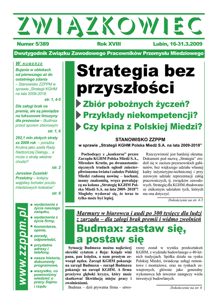 związkowiec Numer 5/389 Rok XVIII Lubin, 16-31.3.2009 Dwutygodnik Związku Zawodowego Pracowników Przemysłu Miedziowego W NUMERZE Bujanie w obłokach od pierwszego aż do ostatniego zdania – Stanowisko ZZPPM w sprawie „Strategii KGHM na lata 2009-2018. str. 1, 4-5 Dla załogi brak na premię, ale są pieniądze na luksusowe limuzyny dla prezesów – Budmax przed sporem zbiorowym. str. 1, 6 www.zzppm.pl 292,1 mln złotych straty za 2008 rok – porażka Krutina jako szefa Rady Nadzorczej Dialogu... a może o stratę właśnie chodzi? str. 2 Jarosław Zuzelski Przelotny – kolejny wątpliwy bohater pocztu miedziowych kolesiów” str. 8 wydarzenia z życia naszego związku, wydarzenia z życia firmy, komentarze, opinie, porady, odpowiedzi, przydatne adresy i telefony, nasza historia, dokumenty programowe, wszystko, co powinniśmy wiedzieć o pracy Sejmu i rządu Strategia bez przyszłości Zbiór pobożnych życzeń? Przykłady niekompetencji? Czy kpina z Polskiej Miedzi? STANOWISKO ZZPPM w sprawie „Strategii KGHM Polska Miedź S.A. na lata 2009-2018” Pochodzący z „konkursu” prezes Zarządu KGHM Polska Miedź S.A., Mirosław Krutin, po dwunastomiesięcznych trudach ogłosił zniecierpliwionemu światu i załodze Polskiej Miedzi radosną nowinę – kochani, mamy znakomitą, wręcz powalającą na kolana „Strategię KGHM Polska Miedź S.A. na lata 2009- 2018”! Mogłoby wydawać się, że teraz to tylko może być lepiej. Rzeczywistość jest bardziej okrutna. Dokument pod nazwą „Strategia” zrodził się w zaciszu prezesowskich gabinetów, bez większego udziału własnej kadry inżynieryjno-technicznej i przy zerowym udziale reprezentacji załóg pracowniczych, tj. związków zawodowych. Strategię dla KGHM zbudowano ze znikomym udziałem tych, których ma ona dotyczyć. Dokończenie na str. 4-5 Marmury w biurowcu i audi po 300 tysięcy dla ludzi z zarządu – dla załogi brak premii i widmo zwolnień Budmax: zastaw się, a postaw się Sytuację Budmaxu można najkrócej określić cytatem z Reja: Ksiądz wini pana, pan księdza, a nam prostym zewsząd nędza. Zarząd KGHM pokazuje na zarząd Budmaxu – zarząd Budmaxu pokazuje na zarząd KGHM. A firma przeżywa głęboki kryzys, który może skutkować likwidacją miejsc pracy i zwolnieniami. Budmax – dziś prywatna firma – utwo- rzony został w wyniku przekształceń KGHM, z wydziału budowlanego o 40-letnich tradycjach. Spółka działa na rynku Polskiej Miedzi, świadcząc usługi remontowe i montażowe, oraz na rynkach zewnętrznych, głównie jako generalny wykonawca lub inwestor zastępczy wielu inwestycji budowlanych. Dokończenie na str. 6 Przyszłość Polskiej Miedzi Bajcować, wkręcać, ściemniać, wciskać kit, wstawiać lipę, bredzić... Tak uczniowie z podstawówki podsumowaliby najnowsze propagandowe wysiłki Zarządu KGHM. Otóż niebawem po zatwierdzeniu przez Radę Nadzorczą KGHM budżetu i strategii Polskiej Miedzi, prezes Krutin rozpoczął intensywny program propagandowy. Celem ma być przekonanie załogi do kierunków rozwoju spółki oraz przedstawienie jej zarządu jako wybitnych menedżerów – wręcz mężów opatrznościowych. Jedynych, którzy mogą przeprowadzić firmę przez trudny czas kryzysu gospodarczego. Spece zarządu od propagandy – czyli jak to się dziś określa od public relations – sięgnęli po wszelkie możliwe metody: od wypowiedzi prasowych i telewizyjnych po ulotki wręczane pracownikom wraz z fiszkami wypłaty. Niezależnie jednak od nośnika informacji – wszędzie zawarta jest jedna myśl: przed nami chude lata, ale zarząd się nie poddaje. Z programu zaprezentowanego przez prezesów odnosimy wrażenie, że najlepszy pomysł, na jaki wpadł zarząd, to przekształcenie Polskiej Miedzi w bank inwestycyjny, który będzie finansować tworzenie miejsc pracy poza granicami Polski. KGHM kupi więc ze dwie kopalnie, i to na drugiej półkuli, i dzięki temu będzie produkować 700 tys. ton miedzi rocznie. Co prawda zarząd nie wie jeszcze, gdzie i jakie złoża rudy będzie kupował, ani jak będzie nimi zarządzał na odległość, ale najważniejsze, że jest dobrej myśli, że szybko się nauczy. Wszak nie święci garnki lepią. Żeby jednak nie popaść w kopalniano-hutniczą rutynę, zarząd snuje wizje o wybudowaniu jakiejś elektrowni atomowej lub węglowej – jeszcze nie wie jakiej, ale to nie problem – oraz zainwestuje w biznes telekomunikacyjny. Lansując na prawo i lewo te mgliste teorie, zarząd obłudnie przemilcza takie założenia strategii, jak: redukcja zatrudnienia w KGHM – w 2009 roku o 334 etaty, likwidacja Huty „Legnica” w 2011 roku – ponad 1000 zatrudnionych oraz zmniejszenie dochodów 2 Czy leci z nami pilot? Propagandowy mętlik menedżerów Polskiej Miedzi pracowników średnio o 507 zł miesięcznie. Pomijane są też problemy spółek grupy kapitałowej i brak koncepcji oraz planu ich rozwoju. Ponieważ prezesom wydaje się, że tak skutecznie ściemniają, przypominamy kilka prawd o Polskiej Miedzi. Czego zarząd do tej pory nie zauważył? W 1992 roku w KGHM zatrudniał ponad 37 tys. pracowników, natomiast w 2008 – 18 tys. W tym okresie produkcja zwiększyła się z 387 tys. ton miedzi elektrolitycznej (1992 r.), do 527 tys. ton w 2008 r. (w 2005 r. wyprodukowano 560 tys. ton miedzi) Oznacza to, że przy ponaddwukrotnie mniejszym zatrudnieniu produkcja zwiększyła się prawie o 150 proc. Prosty rachunek: wydajność pracy w Polskiej Miedzi wzrosła o ponad 300 proc. Jednocześnie średnia praca realna, po uwzględnieniu inflacji, zwiększyła się Kosztowny Dialog Prezes Krutin, który pełni funkcję przewodniczącego w Radzie Nadzorczej Telefonii Dialog, dziewięć miesięcy temu z wielką pompą powołał Piotra Mazurkiewicza na fotel prezesa tej spółki. Decyzję uzasadniano, że jest to wybitny i kompetentny fachowiec, który gwarantuje wyprowadzenie podległej mu firmy na szerokie wody. Ten tak dobrze 
