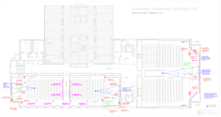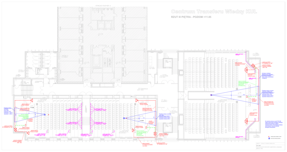 ISTNIEJĄCY BUDYNEK A Centrum Transferu Wiedzy KUL RZUT III PIĘTRA - POZIOM +11.85 szafka typu RACK 19", 600x800 mm, 18U kable prowadzić w korytkach po ścianie i po suficie gniazdo zasilające istniejące, podwójne 230V, 16A Istniejąca instalacja elektryczna do zasilania i sterowania ekranem, ekran należy zamontować i podłączyć zestaw głośników aktywnych montaż do sufitu kable dla 2 mikrofonów zakończyć w puszce gniazdami XLR, kabel audio zakończyć gniazdami 2xRCA kable prowadzić pod podłogą podestu Projekcja obrazu na ekran sterowany elektrycznie, materiał ekranu White Ice, proporcje obrazu 16:9, szerokość obrazu 5,00 m, wysokość obrazu 2,81 m. puszka podłogowa istniejąca głośnik aktywny montaż na ścianie głośnik aktywny montaż na ścianie Projekcja obrazu na ścianę kolor biały , proporcje 16:10, szerokość - 4,00 m, wysokość - 2,50 m. kable prowadzić pod podłogą podestu oraz w korytkach po ścianie kable prowadzić pod podłogą podestu oraz w korytkach po ścianie Projekcja obrazu na ścianę kolor biały , proporcje obrazu 16:10, szerokość obrazu 4,00 m, wysokość obrazu 2,50 m. kable dla 2 mikrofonów zakończyć w puszce gniazdami XLR, kabel audio zakończyć gniazdami 2xRCA kable prowadzić pod podłogą podestu puszka podłogowa istniejąca szafka typu RACK 19", 600x800 mm, 15U kable prowadzić pod podłogą podestu oraz w korytkach po ścianie i po suficie zestaw głośników aktywnych montaż do sufitu puszka podłogowa istniejąca Do zasilenia ekranu w sali CTW 408 należy wykorzystać istniejącą instalację zakończoną puszką w miejscu zasilenia ekranu. W istniejącej instalacji zamontowano również przyciski sterujące pracą ekranu. głośnik aktywny montaż na słupie kable prowadzić w korytkach po ścianie głośnik aktywny montaż na słupie ROLETA ELEKTRYCZNA kable dla 2 mikrofonów zakończyć w puszce gniazdami XLR, kabel audio zakończyć gniazdami 2xRCA kable prowadzić pod podłogą podestu ROLETA ELEKTRYCZNA ROLETA ELEKTRYCZNA ROLETA ELEKTRYCZNA ROLETA ELEKTRYCZNA ROLETA ELEKTRYCZNA ROLETA ELEKTRYCZNA ROLETA ELEKTRYCZNA ROLETA ELEKTRYCZNA ROLETA ELEKTRYCZNA gniazdo zasilające istniejące, podwójne 230V, 16A Istniejące gniazdo zasilające na suficie ROLETA ELEKTRYCZNA Proponowana lokalizacja projektora gniazdo zasilające istniejące, podwójne 230V, 16A kable prowadzić w korytkach po ścianie i po suficie szafka typu RACK 19", 600x800 mm, 15U OBIEKT - Centrum Transferu Wiedzy KUL Rozmieszczenie elementów nagłośnienia - propozycja SKALA 1:100