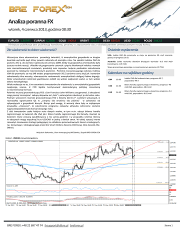 Analiza poranna FX wtorek, 4 czerwca 2013, godzina 08:30 EURUSD 1,30595 EURPLN 4,2568 GOLD 1408,4 BRENT 101,91 DE30 8360,8 US30 15236 POL20 2442,5 Niniejsza publikacja jest publikacją handlową, prosimy o zapoznanie się z oświadczeniem umieszczonym na jej końcu. Złe wiadomości to dobre wiadomości? Wczorajsze dane ekonomiczne pozwalają twierdzić, iż amerykańska gospodarka w drugim kwartale wytraciła pęd, który powoli nabierała od początku roku. Na spadek indeksu ISM do poziomu 49, tj. do wartości najniższej od czerwca 2009, kiedy to gospodarka amerykańska była jeszcze na dnie recesji, składało się pogorszenie czterech z pięciu składowych indeksu: nowych oraz niezrealizowanych zamówień, produkcji oraz zapasów. Jedynie podindeks zatrudnienia pozostał na relatywnie niezmienionym poziomie. Pomimo rozczarowującego odczytu indeksu ISM dla przemysłu za maj (49 wobec prognozowanych 50.5) zarówno ceny akcji jak i towarów odnotowały silne wzrosty, równocześnie rentowności amerykańskich obligacji ledwo drgnęły. Dolar amerykański natomiast gwałtownie osłabił się wobec większości walut, w tym wobec dolara kanadyjskiego. Wiele wskazuje na to, iż w rozumieniu inwestorów złe wiadomości z amerykańskiej gospodarki zwiększają szanse, iż FED będzie kontynuował akomodacyjną politykę monetarną w niezmienionej formule. Również wczoraj przewodniczący FED z San Francisco John Williams zasugerował, iż decydenci mogą zacząć zmniejszać zakupy aktywów od „lata” i potencjalnie zakończyć je do końca roku. Późnym wieczorem również przewodniczący FED z Atlanty Dennis P. Lockhart wskazywał, iż rozważałby ograniczenie QE w „sierpniu lub wrześniu lub później” w zależności od spływających z gospodarki danych. Biorąc pod uwagę, iż wczoraj dane były w najlepszym przypadku „mieszane”, to zakończenie programu zakupów aktywów odroczone zostanie najprawdopodobniej do końca bieżącego roku. Z dziś inwestorów czeka kolejna seria danych marko, w tym m.in. odczyt bilansu handlu zagranicznego za kwiecień dla USA jak i bilans handlu zagranicznego dla Kanady, również za kwiecień. Dane zostaną opublikowana o tej samej godzinie i w przypadku istotnej różnicy w odczytach mogą wypchnąć kurs USDCAD w jedną z dwóch stron. W takiej sytuacji warto rozważyć stosowanie strategii polegającej na składaniu przeciwstawnych zleceń oczekujących, np. korzystając z obsługiwanego przez Bre Smart Orders zlecenia OCO (ang. One-Cancels-theOther). Ostatnie wydarzenia USA: Indeks ISM dla przemysłu w maju na poziomie 49, czyli znacznie gorzej od prognoz (50.5) Australia: Saldo rachunku obrotów bieżących wyniosło -8.5 mld AUD (oczekiwano -8.9 mld) Stopa procentowa pozostaje na niezmienionym poziomie (2.75%) Kalendarz na najbliższe godziny GBP 10:30 Indeks PMI dla budownictwa; prognoza 49.7, poprzednio 49.4 USD 14:30 Bilans handlu zagranicznego w kwietniu; prognoza -40 mld USD, poprzednio -38.8 mld CAD 14:30 Bilans handlu zagranicznego w kwietniu; prognoza -0.4 mld CAD, poprzednio -0.02 mld Wojciech Stokowiec, Dom Inwestycyjny BRE Banku, Zespół BRE FOREX ECN Wykres 1. USDCAD, interwał czterogodzinny BRE FOREX: +48 22 697 47 74 [email protected] breforex.pl Strona 1 Analiza poranna FX wtorek, 4 czerwca 2013, godzina 08:30 Notowania rynkowe (08:30) Waluty EURUSD EURPLN USDPLN USDJPY GBPUSD EURCHF AUDUSD USDCAD NZDUSD Indeksy 1.30595 4.2568 3.2596 100.255 1.53053 1.24072 0.96918 1.03071 0.80324 DE 30 US 30 US 500 US 100 POL 20 FRA 40 UK 100 JPN 225 USD_I Towary 8360.8 15236 1639.1 2991.1 2442.5 3957 6569.5 13670 82.891 GOLD BRENT WTI COPPER SILVER CORN SOY WHEAT.US COCOA.US Obligacje 1408.4 101.91 93.1 333.68 22.626 654.25 1520.5 703.25 2261 TNOTE EURBUND ITBOND XAUUSD - kolejna fala spadków przed nami ? EURJPY traci pomimo lepszych danychz Europy Wykres 2. XAUUSD, interwał dzienny Wykres 3. EURJPY, interwał dzienny 129.42 143.43 114.43 Wczorajsza sesja przyniosła osłabienie dolara względem większości walut po nieoczekiwanym odczycie indeksu ISM poniżej bariery 50 pkt. (49.0). Do łask wrócił szwajcarski frank, co podkreśliło jego wartość jako bezpiecznej przystani. Co ciekawe, drugie aktywo postrzegane jako globalna bezpieczna przystań (złoto) umocniło się tylko nieznacznie. Najwyraźniej w dalszym ciągu w zainteresowaniu inwestorów są ciągłe odpływy ze złotych funduszy ETF, których skala znacznie przewyższa zakupy kruszcu przez Banki Centralne. Od początku drugiego kwartału umorzenia w funduszach ETF sięgnęły już 300 ton. Ponad 70% umorzeń przypada na SPDR Gold Trust, czyli największy ETF złota. Zasoby złota tego funduszu wynoszą obecnie najmniej od 4 lat. Lwia część inwestorów instytucjonalnych traktowała w ciągu ostatnich lat złoto nie tylko jako zabezpieczenie przed inflacją, ale przede wszystkim jako aktywo maksymalizujące całkowitą stopę zwrotu z portfela. Kiedy obecnie globalne postrzeganie ryzyka znacznie się poprawiło, rynek akcyjny wydaje się kierunkiem o większym potencjale. Dopóki rajd na akcjach trwa, dopóty wzmożone odpływy ze złotych funduszy ETF będą się utrzymywać. W przypadku większej korekty amerykańskich indeksów, wysoki popyt na biżuterię i monety oraz zakupy ze strony Banków Centralnych będą w stanie wynieść ceny złota na wyższe poziomy. Część analityków wskazuje drugą połowę roku jako moment realizacji tego scenariusza, jednak wycofanie QE przez FED wcale nie musi wpływać negatywnie na amerykańskie akcje. Trudno zatem wskazać koniec spadków cen złota. Obecnie znajdujemy się blisko ograniczenia wynikającego z 25-sesyjnej średniej, która kilkukrotnie działała jako silne wsparcie spadków. Może to być zatem kluczowy moment co do kierunku na najbliższe sesje. Kurs pary EURJPY zapoczątkował prawdopodobnie korektę spadkową, zatem realizuje się scenariusz, gdzie większa zmienność i rosnące rentowności będ