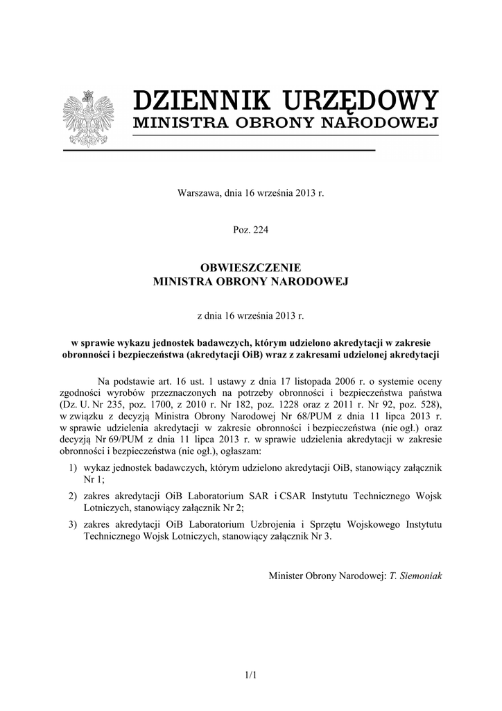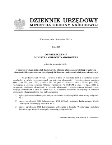 Warszawa, dnia 16 września 2013 r. Poz. 224 OBWIESZCZENIE MINISTRA OBRONY NARODOWEJ z dnia 16 września 2013 r. w sprawie wykazu jednostek badawczych, którym udzielono akredytacji w zakresie obronności i bezpieczeństwa (akredytacji OiB) wraz z zakresami udzielonej akredytacji Na podstawie art. 16 ust. 1 ustawy z dnia 17 listopada 2006 r. o systemie oceny zgodności wyrobów przeznaczonych na potrzeby obronności i bezpieczeństwa państwa (Dz. U. Nr 235, poz. 1700, z 2010 r. Nr 182, poz. 1228 oraz z 2011 r. Nr 92, poz. 528), w związku z decyzją Ministra Obrony Narodowej Nr 68/PUM z dnia 11 lipca 2013 r. w sprawie udzielenia akredytacji w zakresie obronności i bezpieczeństwa (nie ogł.) oraz decyzją Nr 69/PUM z dnia 11 lipca 2013 r. w sprawie udzielenia akredytacji w zakresie obronności i bezpieczeństwa (nie ogł.), ogłaszam: 1) wykaz jednostek badawczych, którym udzielono akredytacji OiB, stanowiący załącznik Nr 1; 2) zakres akredytacji OiB Laboratorium SAR i CSAR Instytutu Technicznego Wojsk Lotniczych, stanowiący załącznik Nr 2; 3) zakres akredytacji OiB Laboratorium Uzbrojenia i Sprzętu Wojskowego Instytutu Technicznego Wojsk Lotniczych, stanowiący załącznik Nr 3. Minister Obrony Narodowej: T. Siemoniak 1/1 Załączniki do obwieszczenia Ministra Obrony Narodowej z dnia 16 września 2013 r. (poz. 224) Załącznik Nr 1 WYKAZ jednostek badawczych, którym udzielono akredytacji OiB Lp. Nazwa jednostki badawczej Zakres udzielonej akredytacji OiB 1. Laboratorium SAR i CSAR Instytutu Technicznego Wojsk Lotniczych Określa załącznik Nr 2 2. Laboratorium Uzbrojenia i Sprzętu Wojskowego Instytutu Technicznego Wojsk Lotniczych Określa załącznik Nr 3 2 Załącznik Nr 2 ZAKRES AKREDYTACJI OiB Nr 3/MON/2013 Wydanie 1 LABORATORIUM SAR i CSAR INSTYTUTU TECHNICZNEGO WOJSK LOTNICZYCH 01-494 Warszawa, ul. Księcia Bolesława 6 Grupa Nazwa wyrobu lub wyrobów* grupy wyrobów Grupa 10 Badane charakterystyki wyrobu i metody badawcze Radiostacja lotnicza, w tym awaryjno – ratunkowa. Dokumenty normatywne i/lub udokumentowane procedury badawcze PROCEDURA BADAWCZA NR PB-01 Pomiar parametrów elektrycznych radiobikonów testerem BT100A (z zastosowaniem połączenia bezpośredniego). Zgodność identyfikatora ID. PROCEDURA BADAWCZA NR PB-02 Pomiar parametrów radiobikonów testerem Treść słowa cyfrowego. BT100A (z zastosowaniem połączenia radiowego). Moc wyjściowa. Rodzaj protokołu. Praca w opcjach TEST i REAL. PROCEDURA BADAWCZA NR PB-03 Badanie radiobikonu w zakresie treści słowa cyfrowego 406 MHz testerem 12-406-7 (z zastosowaniem połączenia bezpośredniego). PROCEDURA BADAWCZA NR PB-04 Badanie radiobikonu w zakresie treści słowa cyfrowego 406 MHz testerem 12-406-7 (z zastosowaniem połączenia radiowego). Uwaga: * - grupy wyrobów zgodnie z art. 6 ustawy z dnia 17 listopada 2006 r. o systemie oceny zgodności wyrobów przeznaczonych na potrzeby obronności i bezpieczeństwa państwa (Dz. U. Nr 235, poz. 1700, z późn. zm.). 1/1 Załącznik Nr 3 ZAKRES AKREDYTACJI OiB Nr 2/MON/2013 Wydanie 1 LABORATORIUM UZBROJENIA I SPRZĘTU WOJSKOWEGO INSTYTUTU TECHNICZNEGO WOJSK LOTNICZYCH 01-494 Warszawa, ul. Księcia Bolesława 6 Grupa Nazwa wyrobu lub grupy wyrobów* wyrobów Badane charakterystyki wyrobu i metody badawcze Dokumenty normatywne i/lub udokumentowane procedury badawcze Grupa 1 Karabiny maszynowe Badania: (uniwersalne, lekkie, prędkości początkowej; ciężkie, lotnicze, okrętowe, prędkości w wybranej przeciwlotnicze, odległości; wielkokalibrowe) prędkości maksymalnej. Karabiny maszynowe (uniwersalne, lekkie, ciężkie, lotnicze, okrętowe, przeciwlotnicze, wielkokalibrowe) zamontowane na śmigłowcach Wojsk Lądowych Procedura badawcza nr PB-14-01 „Pomiar prędkości pocisków metodą radiolokacyjną”. Grupa 2 Przeciwlotnicze karabiny Badania: maszynowe, zestawy prędkości początkowej; artyleryjskie i artyleryjsko prędkości w wybranej rakietowe oraz ich odległości; komponenty prędkości maksymalnej. Działka lotnicze zamontowane na śmigłowcach Wojsk Lądowych Procedura badawcza nr PB-14-01 „Pomiar prędkości pocisków metodą radiolokacyjną”. Grupa 3 Amunicja lotnicza kalibru do 30 mm Badania: prędkości początkowej; Amunicja do broni strzeleckiej prędkości w wybranej odległości; Procedura badawcza nr PB-14-01 „Pomiar prędkości pocisków metodą radiolokacyjną”. Amunicja kalibru do 30 mm i jej elementy do uzbrojenia lądowego prędkości maksymalnej; ciśnienia maksymalnego gazów prochowych; skupienia pocisków na tarczy. Amunicja kalibru do 30 mm i jej elementy stosowana w systemach uzbrojenia śmigłowców Wojsk Lądowych 1/3 Procedura badawcza nr PB-14-03 „Pomiar ciśnienia maksymalnego gazów prochowych”. Procedura badawcza nr PB-14-04 „Pomiar skupienia pocisków na tarczy”. LUiSW ITWL Grupa Nazwa wyrobu lub grupy wyrobów* wyrobów Amunicja do wielkokalibrowych karabinów maszynowych Amunicja do wielkokalibrowych karabinów maszynowych stosowana w systemach uzbrojenia śmigłowców Wojsk Lądowych Amunicja kalibru powyżej 30 mm i jej elementy do uzbrojenia lądowego Badane charakterystyki wyrobu i metody badawcze Badania: prędkości początkowej; prędkości w wybranej odległości; prędkości maksymalnej; ciągu silników rakietowych; impulsu całkowitego; czasu pracy; ciśnienia maksymalnego gazów prochowych; skupienia pocisków na tarczy. Amunicja do uzbrojenia lądowego Dokumenty normatywne i/lub udokumentowane procedury badawcze Procedura badawcza nr PB-14-01 „Pomiar prędkości pocisków metodą radiolokacyjną”. Procedura badawcza nr PB-14-02 „Pomiar ciągu silników rakietowych na paliwo stałe za pomocą czujników piezoelektrycznych”. Procedura badawcza nr PB-14-03 „Pomiar ciśnienia maksymalnego gazów prochowych”. Procedura badawcza nr PB-14-04 „Pomiar skupienia pocisków na tarczy”. Amunicja artyleryjska i moździerzowa Amunicja kalibru powyżej 75 mm i jej elementy Amunicja 