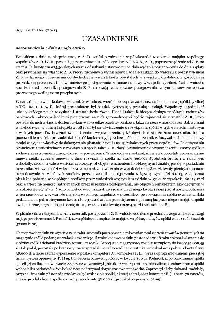 Sygn. akt XVI Ns 1750/14 UZASADNIENIE postanowienia z dnia 9 maja 2016 r. Wnioskiem z dnia 19 sierpnia 2009 r. A. D. wniósł o zniesienie współwłasności w zakresie majątku wspólnego wspólników A. D. i Z. B., powstałego po rozwiązaniu spółki cywilnej A.T.B Z. B., A. D., poprzez zasądzenie od Z. B. na rzecz A. D. kwoty 119.925,30 złotych wraz z odsetkami ustawowymi od dnia wydania postanowienia do dnia zapłaty oraz przyznanie na własność Z. B. rzeczy ruchomych wymienionych w załącznikach do wniosku z pozostawieniem Z. B. wyłącznego uprawnienia do dochodzenia wierzytelności powstałych w związku z działalnością gospodarczą prowadzoną przez uczestników niniejszego postępowania w ramach umowy ww. spółki cywilnej. Nadto wniósł o zasądzenie od uczestnika postępowania Z. B. na swoją rzecz kosztów postępowania, w tym kosztów zastępstwa procesowego według norm przepisanych. W uzasadnieniu wnioskodawca wskazał, że w dniu 20 września 2004 r. zawarł z uczestnikiem umowę spółki cywilnej A.T.C. s.c. (...), A. D., której przedmiotem był handel, dystrybucja, produkcja, usługi. Wspólnicy uzgodnili, iż udziały każdego z nich w zyskach i stratach będą równe. Ustalili także, iż bieżącą obsługą wspólnych rachunków bankowych i obrotem środkami pieniężnymi na nich zgromadzonymi będzie zajmował się uczestnik Z. B., który posiadał do nich wyłączny dostęp i wykonywał wszelkie przelewy bankowe, także na rzecz wnioskodawcy. Jak wyjaśnił wnioskodawca, w dniu 4 listopada 2008 r. złożył on oświadczenie o rozwiązaniu spółki w trybie natychmiastowym z ważnych powodów bez zachowania terminu wypowiedzenia, gdyż dowiedział się, że żona uczestnika, będąca pracownikiem spółki, prowadzi działalność konkurencyjną wobec spółki, a uczestnik wskazywał rachunek bankowy swojej żony jako właściwy do dokonywania płatności z tytułu usług świadczonych przez wspólników. Po otrzymaniu oświadczenia wnioskodawcy o rozwiązaniu spółki także Z. B. złożył oświadczenie o wypowiedzeniu umowy spółki z zachowaniem trzymiesięcznego okresu wypowiedzenia. Wnioskodawca wskazał, iż majątek pozostały po rozwiązaniu umowy spółki cywilnej opiewał w dniu rozwiązania spółki na kwotę 360.074,85 złotych brutto i w skład jego wchodziły: środki trwałe o wartości 140.005,49 zł objęte remanentem likwidacyjnym i znajdujące się w posiadaniu uczestnika, wierzytelności w kwocie 50.401,01 zł, zobowiązania w wysokości 22.778,22 zł, kwoty pieniężne pobrane bezpodstawnie ze wspólnych środków przez uczestnika postępowania w łącznej wysokości 60.113,12 zł, kwota pieniężna pobrana ze wspólnych środków przez wnioskodawcę tytułem udziału w zysku w wysokości 60.113,12 zł oraz wartość ruchomości zatrzymanych przez uczestnika postępowania, nie objętych remanentem likwidacyjnym w wysokości 26.663,89 zł. Nadto wnioskodawca wskazał, że żądana przez niego kwota 119.924,30 zł została obliczona w ten sposób, że ww. wartość majątku wspólnego wspólników pozostałego po rozwiązaniu spółki cywilnej została podzielona na pół, a otrzymana kwota 180.037,42 zł została pomniejszona o pobraną już przez niego z majątku spółki kwotę należnego zysku, to jest kwotę 60.113,12 zł, co dało kwotę 119.924,30 zł (wniosek k. 2-8). W piśmie z dnia 18 stycznia 2011 r. uczestnik postępowania Z. B. wniósł o oddalenie przedmiotowego wniosku z uwagi na jego przedwczesność. Podniósł, że wspólnicy nie zapłacili z majątku wspólnego długów spółki wobec osób trzecich (pismo k. 86). Na rozprawie w dniu 20 stycznia 2011 roku uczestnik postępowania zakwestionował wartość towarów pozostałych na magazynie spółki podaną we wniosku, twierdząc, iż wnioskodawca w dniu 7 listopada 2008 roku dokonał włamania do siedziby spółki i dokonał kradzieży towaru, w wyniku której stan magazynowy został uszczuplony do kwoty 54.080,45 zł. Jak podał, pozostały po kradzieży towar sprzedał. Ponadto według uczestnika wnioskodawca pobrał z konta firmy 38.000 zł, a także zabrał wyposażenie w postaci komputera A., komputera F. (...) wraz z oprogramowaniem, pieczątkę firmy, system operacyjny F. Mag, trzy krzesła barowe i gotówkę w kwocie 800 zł. Podniósł, iż po rozwiązaniu spółki spłacił jej zadłużenie w kwocie 22.778,22 zł, zaznaczył jednak, iż wciąż pozostały nierozliczone zobowiązania spółki wobec kilku podmiotów. Wnioskodawca podtrzymał dotychczasowe stanowisko. Zaprzeczył ażeby dokonał kradzieży, przyznał, iż w dniu 7 listopada 2008 roku był w siedzibie spółki, z której zabrał jeden komputer F. (...) oraz 170 tonerów, a także przelał z konta spółki na swoją rzecz kwotę 38.000 zł (protokół rozprawy k. 95-99). W piśmie z dnia 6 sierpnia 2011 r. uczestnik podniósł, że wskazany przez wnioskodawcę majątek spółki w kwocie 360.074,85 zł nie jest zgodny ze stanem faktycznym, a roszczenia zawarte we wniosku są bezzasadne. Ponownie wskazał, że w dniu 10 listopada 2008 r. została przeprowadzona inwentaryzacja po kradzieży towaru dokonanej w siedzibie spółki, w trakcie której stwierdzono, iż wartość pozostającego w magazynie towaru to jedynie 54.080,45 zł. Podał, iż wartość środków trwałych, pozostawionych w biurze spółki i stanowiących jego wyposażenie, po uwzględnieniu amortyzacji wynosiła 9.742,89 zł. Potwierdził, iż wierzytelności spółki wynosiły 50.401,01 zł, z czego jednak kwota 4.089,44 zł nie została zapłacona. Odnośnie zobowiązań spółki wskazał, że oprócz zobowiązań na kwotę 22.778,22 zł wskazanych przez wnioskodawcę pokrył także zobowiązania na kwotę 20.802,21 zł z tytułu składek ZUS, rachunków za media, wynagrodzenia pracownika, księgowości, bonusu dla firmy (...) oraz kosztów usług i zakupu towarów od ośmiu firm oraz czynszu najmu lokalu. Ponadto stwierdził, i