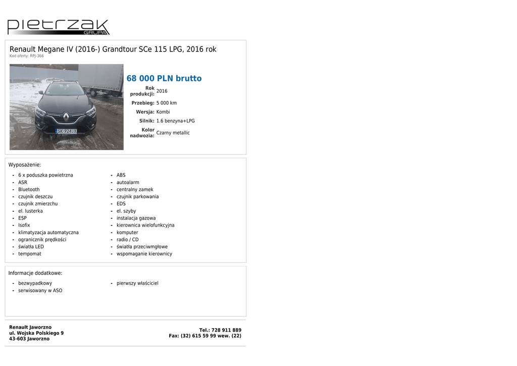 Renault Megane IV (2016-) Grandtour SCe 115 LPG, 2016 rok Kod oferty: RPJ-366 68 000 PLN brutto Rok 2016 produkcji: Przebieg: 5 000 km Wersja: Kombi Silnik: 1.6 benzyna+LPG Kolor Czarny metallic nadwozia: Wyposażenie: - 6 x poduszka powietrzna ASR Bluetooth czujnik deszczu czujnik zmierzchu el. lusterka ESP Isofix klimatyzacja automatyczna ogranicznik prędkości światła LED tempomat - ABS autoalarm centralny zamek czujnik parkowania EDS el. szyby instalacja gazowa kierownica wielofunkcyjna komputer radio / CD światła przeciwmgłowe wspomaganie kierownicy Informacje dodatkowe: - bezwypadkowy - serwisowany w ASO Renault Jaworzno ul. Wojska Polskiego 9 43-603 Jaworzno - pierwszy właściciel Tel.: 728 911 889 Fax: (32) 615 59 99 wew. (22)