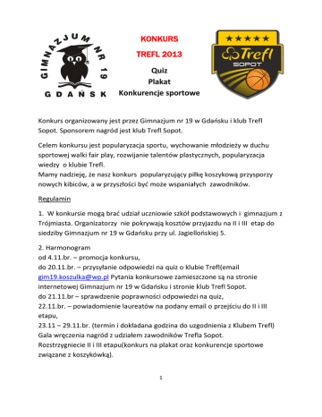KONKURS TREFL 2013 Quiz Plakat Konkurencje sportowe Konkurs organizowany jest przez Gimnazjum nr 19 w Gdańsku i klub Trefl Sopot. Sponsorem nagród jest klub Trefl Sopot. Celem konkursu jest popularyzacja sportu, wychowanie młodzieży w duchu sportowej walki fair play, rozwijanie talentów plastycznych, popularyzacja wiedzy o klubie Trefl. Mamy nadzieję, że nasz konkurs popularyzujący piłkę koszykową przysporzy nowych kibiców, a w przyszłości być może wspaniałych zawodników. Regulamin 1. W konkursie mogą brać udział uczniowie szkół podstawowych i gimnazjum z Trójmiasta. Organizatorzy nie pokrywają kosztów przyjazdu na II i III etap do siedziby Gimnazjum nr 19 w Gdańsku przy ul. Jagiellońskiej 5. 2. Harmonogram od 4.11.br. – promocja konkursu, do 20.11.br. – przysyłanie odpowiedzi na quiz o klubie Trefl(email [email protected] Pytania konkursowe zamieszczone są na stronie internetowej Gimnazjum nr 19 w Gdańsku i stronie klub Trefl Sopot. do 21.11.br – sprawdzenie poprawności odpowiedzi na quiz, 22.11.br. – powiadomienie laureatów na podany email o przejściu do II i III etapu, 23.11 – 29.11.br. (termin i dokładana godzina do uzgodnienia z Klubem Trefl) Gala wręczenia nagród z udziałem zawodników Trefla Sopot. Rozstrzygniecie II i III etapu(konkurs na plakat oraz konkurencje sportowe związane z koszykówką). 1 3. Uczestnicy konkursu mogą korzystać z informacji zamieszczonej na stronach internetowych organizatorów. Wysłanie odpowiedzi jest wyrażeniem zgody na regulamin konkursu, wykorzystywanie danych osobowych związanych z informacją o przebiegu konkursu oraz przekazaniem praw autorskich związanych z wykonanym plakatem. 4. Odpowiedzi na quiz należy przesyłać na email [email protected] do 20 listopada 2013r. włącznie. Należy podać imię, nazwisko, szkołę, email zwrotny, numer telefonu). Wpisujemy numer pytania i odpowiedź.(prace bez numeru pytania nie będą klasyfikowane) 5. Na II i III etap należy przynieść wykonany wcześniej plakat pt. „Basketball my passion” (Koszykówka – moja pasja). Plakat może być wykonany w języku polskim lub angielskim. Format A3, technika dowolna. Uczestników konkurencji sportowych obowiązuje strój sportowy. 6. Komisja konkursowa wyłoni uczestników do II i III etapu. Jedynym kryterium jest poprawna odpowiedź na minimum 70% zadanych pytań. 7. Komisja konkursowa w trakcie II i III etapu oceni wykonane plakaty oraz konkurencje sportowe. 8. Komisja konkursowa wyłoni zdobywcę I, II oraz III miejsca biorąc pod uwagę łączną ilość punktów(quiz, plakat, konkurencje sportowe). Zawodnicy Trefla Sopot wręczą nagrody i dyplomy za I, II oraz III miejsce. 9. Dodatkowych informacji udziela koordynator projektu Janusz Jopek, [email protected] , tel. Gimnazjum nr 19 w Gdańsku 58 761 45 97, email [email protected] 2 3