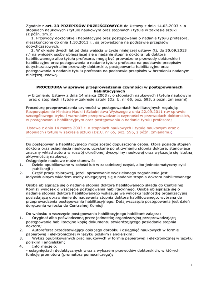 Zgodnie z art. 33 PRZEPISÓW PRZEJŚCIOWYCH do Ustawy z dnia 14.03.2003 r. o stopniach naukowych i tytule naukowym oraz stopniach i tytule w zakresie sztuki (z późn. zm.): 1. Przewody doktorskie i habilitacyjne oraz postępowania o nadanie tytułu profesora, niezakończone do dnia 1.10.2011 r., są prowadzone na podstawie przepisów dotychczasowych. 2. W okresie dwóch lat od dnia wejścia w Ŝycie niniejszej ustawy (tj. do 30.09.2013 r.) na wniosek osoby ubiegającej się o nadanie stopnia doktora lub doktora habilitowanego albo tytułu profesora, mogą być prowadzone przewody doktorskie i habilitacyjne oraz postępowania o nadanie tytułu profesora na podstawie przepisów dotychczasowych albo przewody doktorskie, postępowania habilitacyjne oraz postępowania o nadanie tytułu profesora na podstawie przepisów w brzmieniu nadanym niniejszą ustawą. PROCEDURA w sprawie przeprowadzenia czynności w postępowaniach habilitacyjnych w brzmieniu Ustawy z dnia 14 marca 2003 r. o stopniach naukowych i tytule naukowym oraz o stopniach i tytule w zakresie sztuki (Dz. U. nr 65, poz. 695, z późn. zmianami) Procedurę przeprowadzenia czynności w postępowaniach habilitacyjnych regulują: Rozporządzenie Ministra Nauki i Szkolnictwa WyŜszego z dnia 22.09.2011 r.w sprawie szczegółowego trybu i warunków przeprowadzania czynności w przewodach doktorskich, w postępowaniu habilitacyjnym oraz postępowaniu o nadanie tytułu profesora; Ustawa z dnia 14 marca 2003 r. o stopniach naukowych i tytule naukowym oraz o stopniach i tytule w zakresie sztuki (Dz.U. nr 65, poz. 595, z późn. zmianami); Do postępowania habilitacyjnego moŜe zostać dopuszczona osoba, która posiada stopień doktora oraz osiągnięcia naukowe, uzyskane po otrzymaniu stopnia doktora, stanowiące znaczny wkład autora w rozwój określonej dyscypliny naukowej oraz wykazuje się istotną aktywnością naukową. Osiągnięcie naukowe moŜe stanowić: 1. Dzieło opublikowane w całości lub w zasadniczej części, albo jednotematyczny cykl publikacji ; 2. Część pracy zbiorowej, jeŜeli opracowanie wydzielonego zagadnienia jest indywidualnym wkładem osoby ubiegającej się o nadanie stopnia doktora habilitowanego. Osoba ubiegająca się o nadanie stopnia doktora habilitowanego składa do Centralnej Komisji wniosek o wszczęcie postępowania habilitacyjnego. Osoba ubiegająca się o nadanie stopnia doktora habilitowanego wskazuje we wniosku jednostkę organizacyjną posiadającą uprawnienie do nadawania stopnia doktora habilitowanego, wybraną do przeprowadzenia postępowania habilitacyjnego. Datą wszczęcia postępowania jest dzień doręczenia wniosku do Centralnej Komisji. 1. 2. 3. 4. Do wniosku o wszczęcie postępowania habilitacyjnego habilitant załącza: Oryginał albo poświadczoną przez jednostkę organizacyjną przeprowadzającą postępowanie habilitacyjne kopię dokumentu stwierdzającego posiadanie stopnia doktora; Autoreferat przedstawiający opis jego dorobku i osiągnięć naukowych w formie papierowej i elektronicznej w języku polskim i angielskim; Wykaz opublikowanych prac naukowych w formie papierowej i elektronicznej w języku polskim i angielskim; Informację o: - osiągnięciach dydaktycznych wraz z wykazem przewodów doktorskich, w których funkcję promotora (promotora pomocniczego); 1 - współpracy z instytucjami, organizacjami i towarzystwami naukowymi ; - działalności popularyzującej naukę. 5. W przypadku gdy osiągnięciem naukowym jest część pracy zbiorowej, habilitant przedkłada oświadczenia wszystkich jej współautorów, określające indywidualny wkład kaŜdego z nich w jej powstanie. Habilitant jest zwolniony z obowiązku przedłoŜenia oświadczenia w przypadku śmierci współautora, uznania go za zmarłego albo jego trwałego uszczerbku na zdrowiu, uniemoŜliwiającego uzyskanie wymaganego oświadczenia. Wkład we współautorstwo powinien być określony bardzo precyzyjnie, w tym równieŜ procentowo. Kryteria oceny osiągnięć habilitanta zawiera Rozporządzenie Ministra Nauki i Szkolnictwa WyŜszego z dnia 1.09.2011 r. w sprawie kryteriów oceny osiągnięć osoby ubiegającej się o nadanie stopnia doktora habilitowanego Wniosek o wszczęcie postępowania habilitacyjnego wraz załącznikami habilitant przedkłada w formie papierowej i elektronicznej. Wniosek o wszczęcie postępowania habilitacyjnego wraz z autoreferatem habilitanta zamieszcza się na stronie internetowej Centralnej Komisji. Centralna Komisja w terminie 7 dni dokonuje oceny formalnej wniosku. W przypadku uznania wniosku za niekompletny lub nieodpowiadający wymogom ustawy, Centralna Komisja wzywa do uzupełnienia, wskazując sposób i wyznaczając termin uzupełnienia wniosku Po dokonaniu oceny formalnej wniosku. Centralna Komisja zwraca habilitantowi oryginał albo poświadczoną kopię dokumentu stwierdzającego posiadanie stopnia doktora. Centralna Komisja występuje do Rady jednostki wskazanej przez habilitanta o podjęcie Uchwały w sprawie wyraŜenia zgody na przeprowadzenie postępowania habilitacyjnego i wskazania sekretarza komisji habilitacyjnej oraz jednego recenzenta. Uchwała Rady w tej sprawie podejmowana jest w głosowaniu tajnym. W przypadku, gdy Rada jednostki wskazanej przez wnioskodawcę nie wyrazi zgody na przeprowadzenie postępowania habilitacyjnego, postępowanie prowadzi jednostka organizacyjna posiadająca uprawnienia do nadawania stopnia doktora habilitowanego wyznaczona przez Centralną Komisję. Centralna Komisja wyznacza inną jednostkę do przeprowadzenia przewodu w ciągu 14 dni. Centralna Komisja w terminie 6 tygodni od dnia otrzymania wniosku spełniającego wymagania formalne powołuje komisję habilitacyjną w celu przeprowadzenia postępowania habilitacyjnego. Komisja habilitacyjna składa się z: 1. czterech członków o uznanej renomie naukowej (w tym międzynarodowej), w tym z przewodniczącego i dwóch recenzentów, wyznaczonych przez Centralną Komisję spoza 