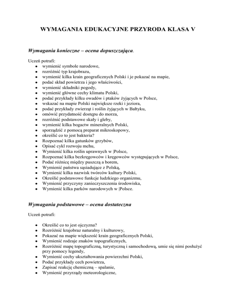 WYMAGANIA EDUKACYJNE PRZYRODA KLASA V Wymagania konieczne – ocena dopuszczająca. Uczeń potrafi: wymienić symbole narodowe, rozróżnić typ krajobrazu, wymienić kilka krain geograficznych Polski i je pokazać na mapie, podać skład powietrza i jego właściwości, wymienić składniki pogody, wymienić główne cechy klimatu Polski, podać przykłady kilku owadów i ptaków żyjących w Polsce, wskazać na mapie Polski największe rzeki i jeziora, podać przykłady zwierząt i roślin żyjących w Bałtyku, omówić przydatność dostępu do morza, rozróżnić podstawowe skały i gleby, wymienić kilka bogactw mineralnych Polski, sporządzić z pomocą preparat mikroskopowy, określić co to jest bakteria? Rozpoznać kilka gatunków grzybów, Opisać cykl rozwoju mchu, Wymienić kilka roślin uprawnych w |Polsce, Rozpoznać kilka bezkręgowców i kręgowców występujących w Polsce, Podać różnicę między puszczą a borem, Wymienić państwa sąsiadujące z Polską, Wymienić kilka nazwisk twórców kultury Polski, Określić podstawowe funkcje ludzkiego organizmu, Wymienić przyczyny zanieczyszczenia środowiska, Wymienić kilka parków narodowych w |Polsce. Wymagania podstawowe – ocena dostateczna Uczeń potrafi: Określić co to jest ojczyzna? Rozróżnić krajobraz naturalny i kulturowy, Pokazać na mapie większość krain geograficznych Polski, Wymienić rodzaje znaków topograficznych, Rozróżnić mapę topograficzną, turystyczną i samochodową, umie się nimi posłużyć przy pomocy legendy, Wymienić cechy ukształtowania powierzchni Polski, Podać przykłady cech powietrza, Zapisać reakcję chemiczną – spalanie, Wymienić przyrządy meteorologiczne, Opisać klimat Polski, Opisać cykl rozwojowy owadów, Wymienić źródła zanieczyszczenia powietrza, wody i gleby, Określić różnicę pomiędzy rzeką główną a dopływem, Wymienić zasoby wód słodkich, Podać kilka informacji o Bałtyku, Podzielić na grupy i omówić bogactwa mineralne Polski, wskazać miejsce występowania, Wymienić kilka kamieni szlachetnych, Rozpoznać gleby typowe dla Polski i podać ich przydatność rolniczą, Opisać wpływ rolnictwa na gleby, Wymienić kilka organizmów jednokomórkowych, Określić plusy i minusy obecności bakterii, Omówić sposoby odżywiania się grzybów, Przeprowadzić obserwacje pleśni lub drożdży, Rozróżnić kilka grzybów trujących i jadalnych, Opisać porost, Wymienić zbiorowiska roślinne w Polsce, rośliny ozdobne, Podzielić kręgowce na grupy, Określić co to jest przyrost naturalny, Omówić poszczególne funkcje ludzkiego organizmu, Opisać przyczyny zachorowań na różne choroby, Wymienić obszary zanieczyszczone w Polsce, Scharakteryzować jeden park narodowy. Wymagania rozszerzone – ocena dobra Uczeń potrafi: Zdefiniować termin: patriota, ojczyzna, Na podstawie fotografii rozpoznać typ krajobrazu, Wskazać wszystkie krainy geograficzne Polski na mapie, Czytać różne rodzaje map, Podać przyczyny takiego ukształtowania powierzchni |Polski, Przeprowadzić i opisać doświadczenia z powietrzem, Zdefiniować pierwiastek chemiczny, Przypisać cechy klimatu zajęciom ludzi w Polsce, Rozróżnić gatunki ptaków, Wymienić dopływy Wisły i Odry (rozróżnia prawe i lewe), Rozpoznać i opisać wody mineralne i ich występowanie, Wskazać tereny bagienne, Omówić położenie Bałtyku i jego cechy, Zdefiniować: plankton, bentos itp. Wymienić źródła zanieczyszczeń Bałtyku, Rozróżnić bogactwa naturalne i ich występowanie oraz wielkość wydobycia, Opisać warunki powstawania gleb, Wymienić negatywny i pozytywny wpływ rolnictwa na gleby, Przeprowadzić obserwację mikroskopową, Opisać przydatność roślin, Omówić zmiany liczby ludności w Polsce, Opisać budowę poszczególnych układów życiowych człowieka, Opisać sposoby ochrony przyrody, Wymagania dopełniające – ocena bardzo dobra Uczeń potrafi: Orientować mapę według znanych elementów krajobrazu, Zaplanować wycieczkę korzystając z właściwej mapy, Obliczyć długość takich obiektów na mapie jak: rzeka szlak turystyczny, Zilustrować znakami umownymi – topograficznymi wybrane elementy krajobrazu, Opisać klimat Polski uwzględniając wszystkie jego elementy Wyjaśnić jaki jest wpływ walorów środowiska ma sposoby jego zagospodarowania, Zaproponować sposoby ratowania zniszczonego krajobrazu, Przewidzieć, jakie znaczenie dla gospodarki ma fakt dostępu do morza. Wymagania wykraczające – ocena celująca Uczeń: potrafi posługiwać się literaturą popularnonaukową do samodzielnego zdobywania wiedzy, potrafi omówić problemy całościowe środowiska naturalnego bierze udział w konkursach przyrodniczych i ekologicznych.